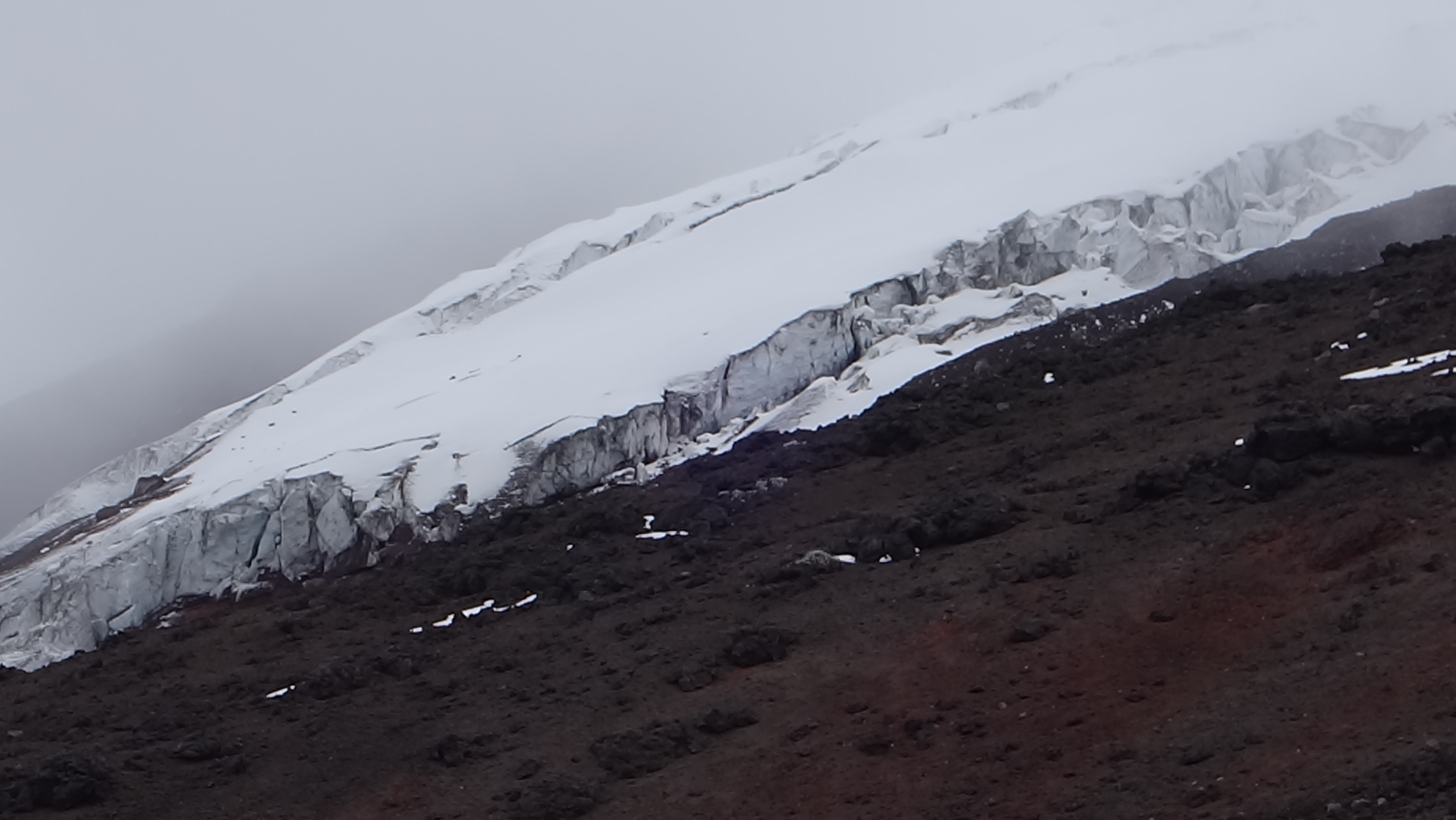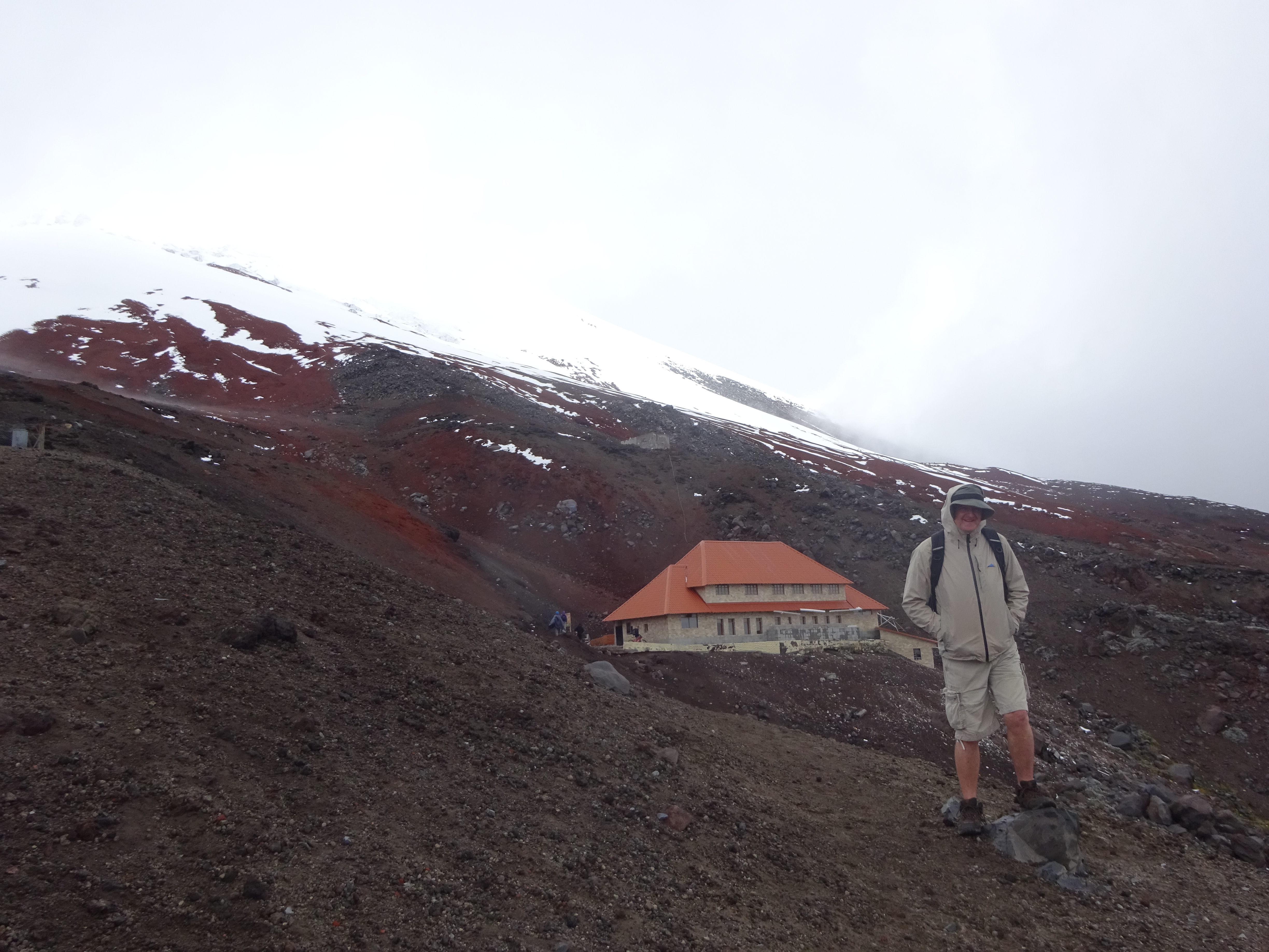 The temperature has dropped remarkably, so layers are applied, but I decide to go gung ho and opt for shorts. The trail zig-zags up a slope of unstable ash and I hit The Wall before I have let go of the car door. Fortunately, the Coca kicks in and we traipse slowly up the trail with Dori and Jack Frost nipping at my heels. This is head down and feel the burn stuff. After what seems like Scott’s Antarctica expedition, we round a bend and there is the edge of the Glacier and the Refuge. My fingers just manage to get off a couple of photos before my oxygen starved brain screams at me to “Get Real!” and we stumble into the Refuge, where US$2 for a mug of hot chocolate served by an Ecuadorian Sherpa makes absolute sense.
