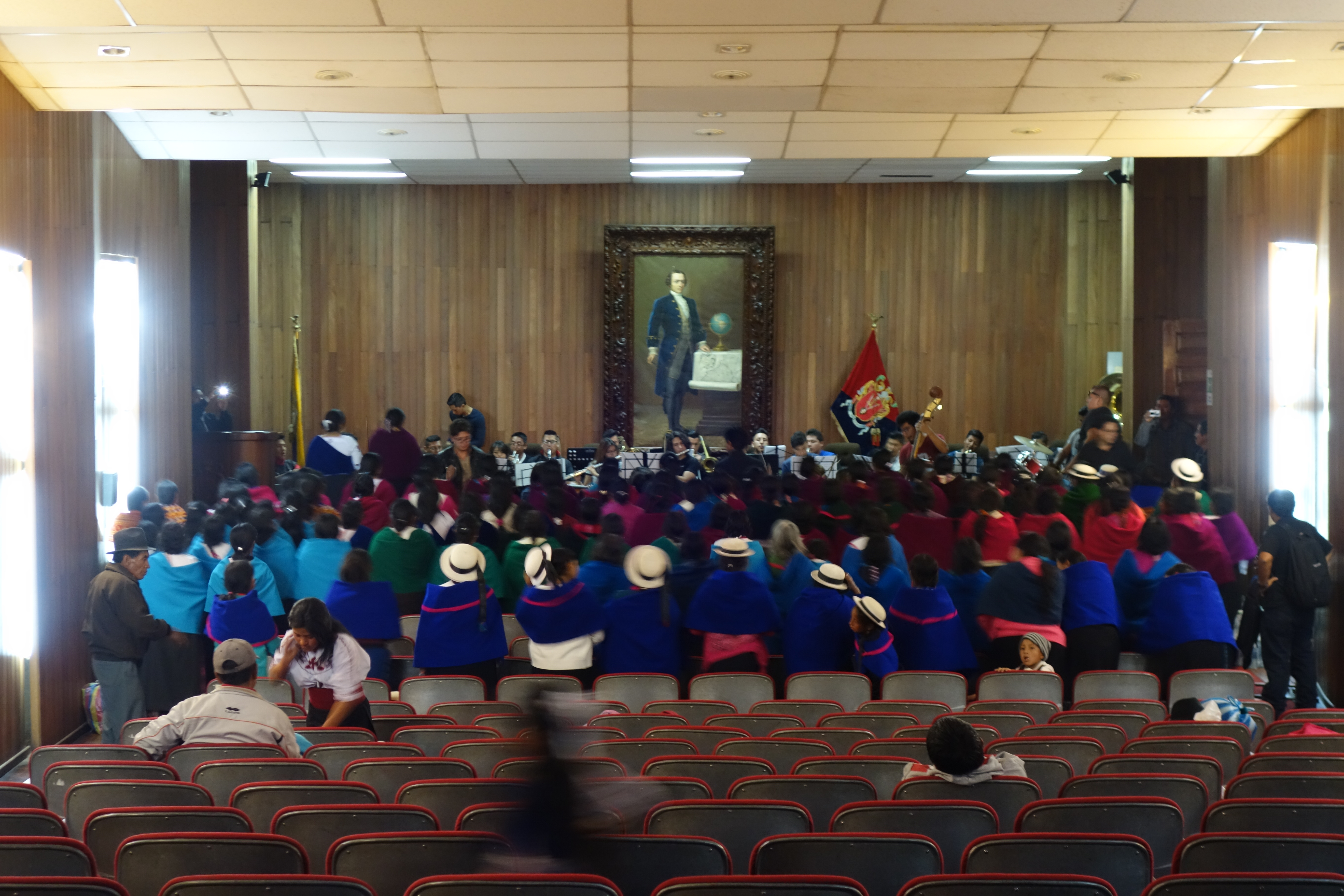 Christian transfers us to another car and driver and we rumble off to Rio Bamba and a really fabulous hotel owned by a young English guy and his Ecuadorian wife. The Santa Isabella is an absolute gem, especially as there is only one guy (Marcel, a Cuban Engineer) running it, along with an assistant cook. Rio Bamba could also be a gem, it gets pretty close at times, but everywhere just oozes “We got no dollar”. I hope it can find some. Someone left the back door of the Town Hall open and we innocent Gringos wandered in to a full scale Orchestra practicing with a choir of Native Indian Women and Girls in shawls and bowler hats. The sound is weird, wonky and wonderful and we are totally uplifted.