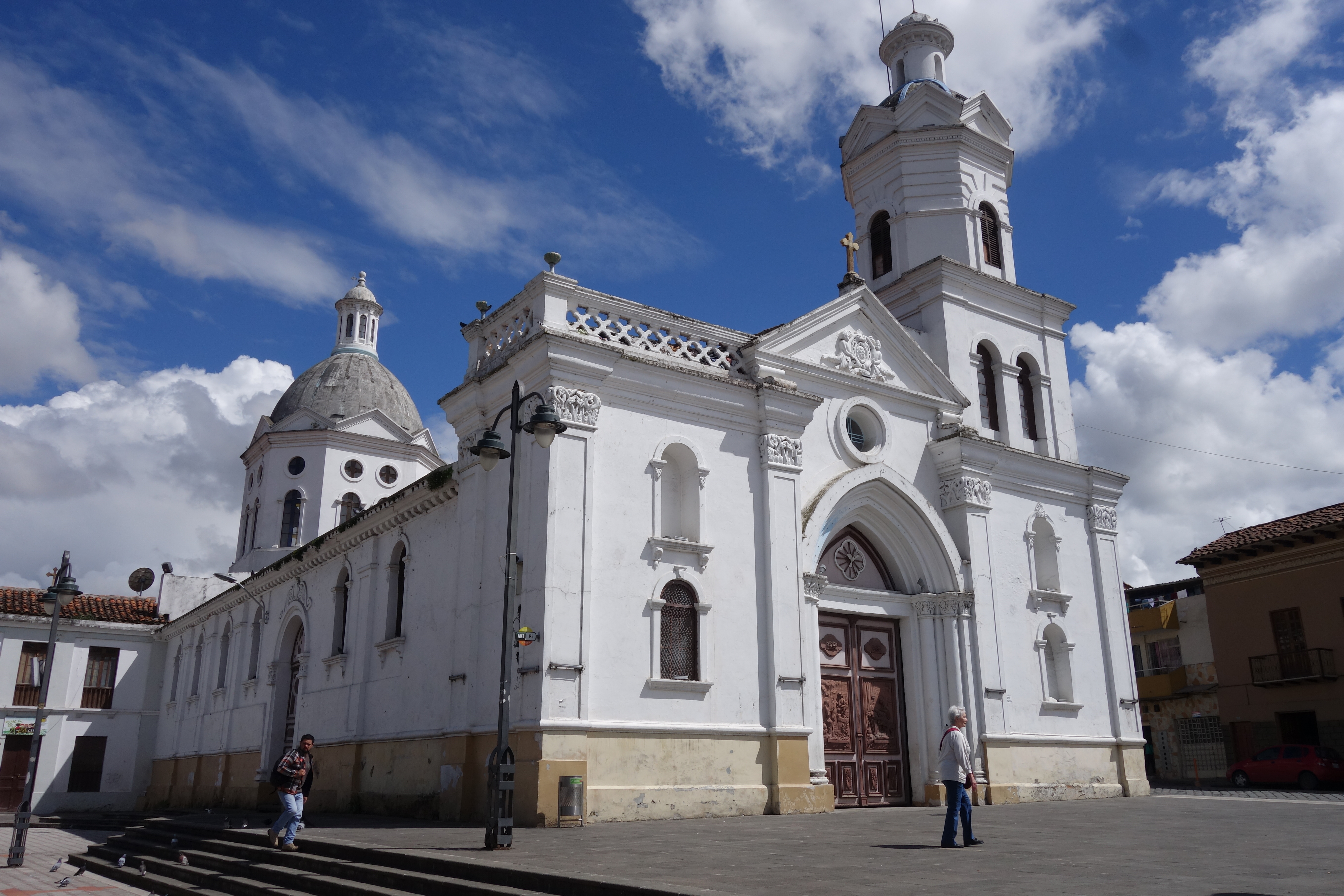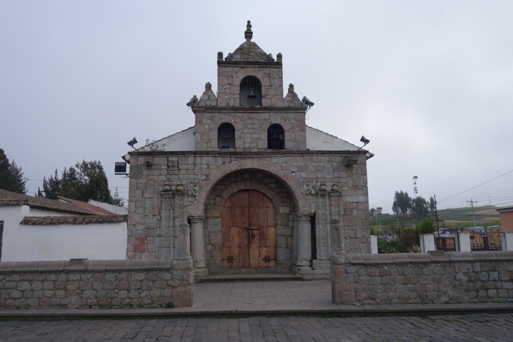 Due to a bulge in the Earth’s crust at the Equator, this peak is even further from the centre of the Earth than Everest. So why doesn’t all the air here, slip off to Nepal? Eh? Bit freaky that. As we drive, Milton gets a phone call, it seems that there may have been a landslide on the road we need to take after Alausi. Maybe. Maybe 10 cars got swept away. Maybe some people died. Nobody can be sure because it’s Ecuador and time for a little ITT. We won’t know until we find out for ourselves. The road we are on is quite beautiful, running through incredibly green valleys, where old grass thatched shacks with breakfast smoke seeping through, are still dotted between their newer and less charismatic neighbours. Fields 10 metres wide and 100 metres long, climb the lush mountain sides, some at 5degrees off the vertical. I imagine the farmer climbing to the top and jumping off, using his hoe as a sort of ice-pick to plough a furrow as he abseils down. There are reed lined lakes, but not much in the way of wildfowl. We stop for a quick look at the first Catholic Church in Ecuador which stands close to one such lake.