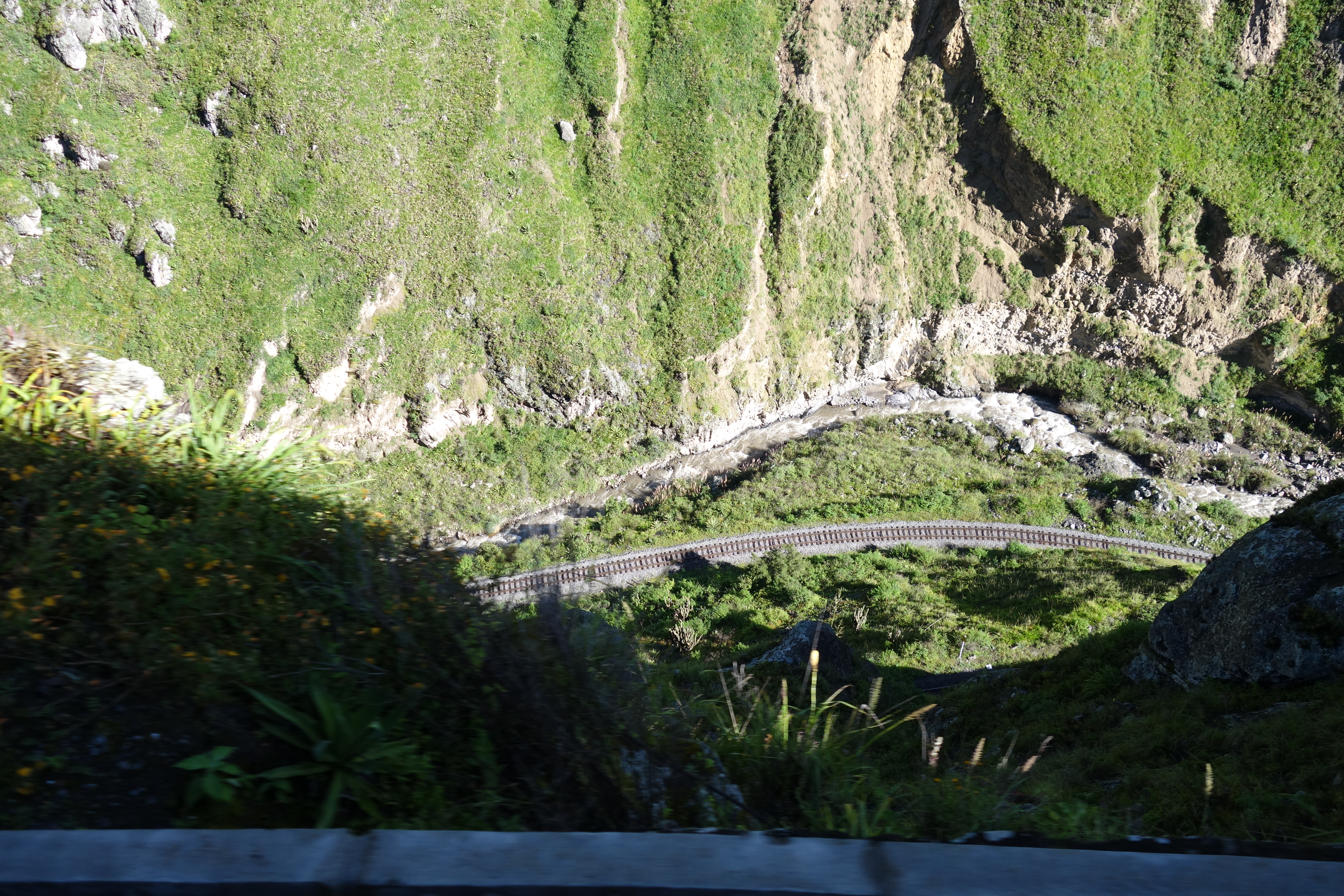 At 7.45, we roll into Alausi, buy Empanada con Pollo and clamber aboard the train to El Nariz del Diablo. The Devils’ Nose. This is a 3 carriage tourist experience that starts in the middle of town and rattles through a few streets before escaping into the countryside and snaking its way down 500M of elevation in less than 12K of canyon wall. At times, the view over the edge is pretty scary and you can see 2 other levels of track below and below that, the river hammering through the gorge. But the sun shines and fluffy white clouds dot a brilliant blue sky over emerald mountainsides, which, in numerous places, have slipped down to kiss the river. Not today, please.