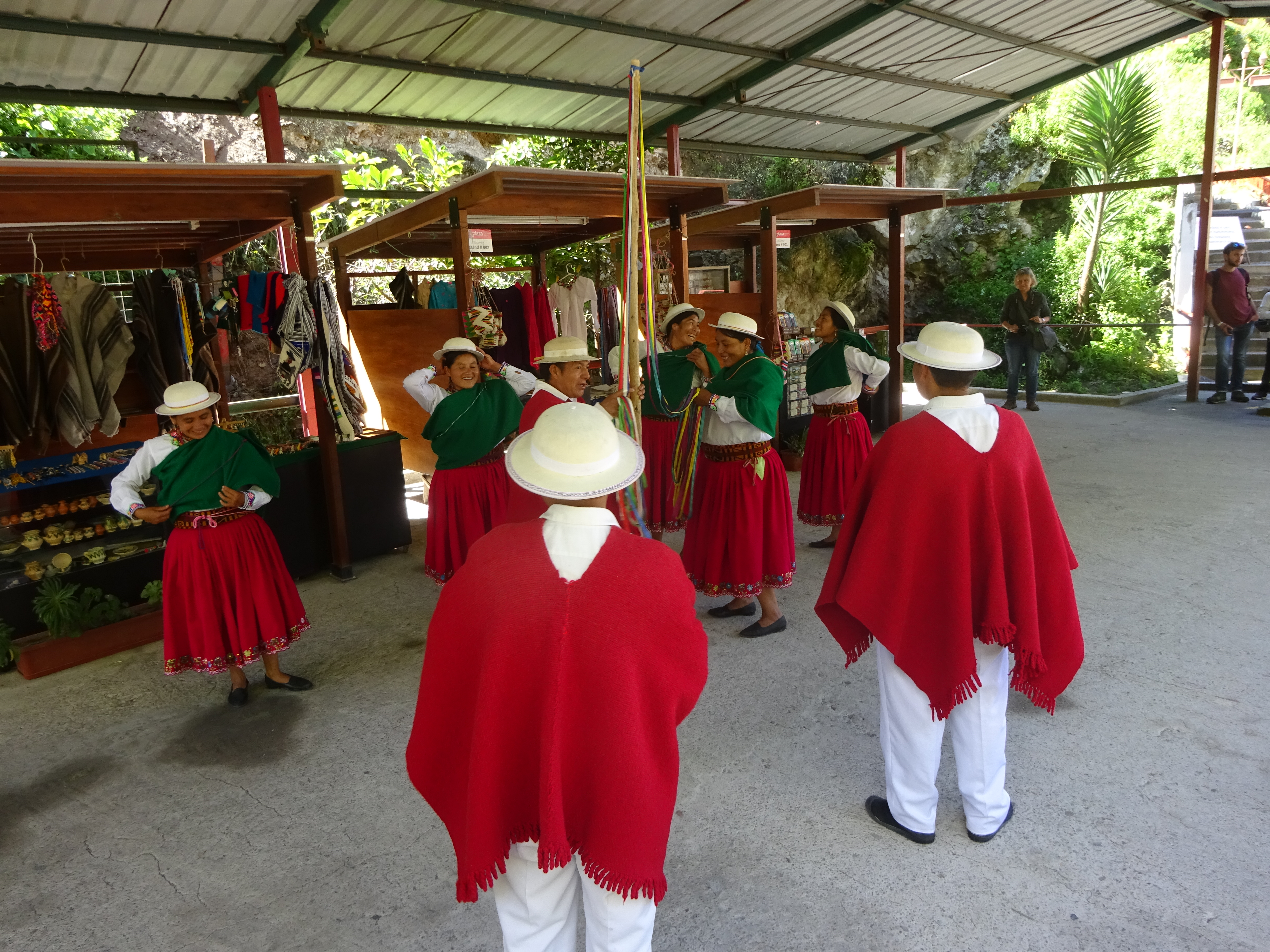 We have the last carriage to ourselves and through the back window have a great view of the Brakeman who spends the entire journey down leaping from one side to the other, screwing down the brake and pouring water over it so that it doesn’t melt. After 45 minutes and several changes of direction, we squeal into the lower station. A gaggle of local dancers, each no taller than a Pigmy’s armpit, dressed in white, red and green with white bowler hats, are twirling skirts and flapping ponchos in welcome and it is very festive. However, a cup of Te Negre con leche and my Empanada are a priority. After which a snooze in the station sunshine seems like the thing to do, while Dori and Liz go off dancing, of course. They tower over their partners and, somehow, Jon gets dragged in by a Lady whose eyes are on a level with his crotch, maybe that was the selection criteria. I maintain my Zzzzs in an effort to stay out of trouble.