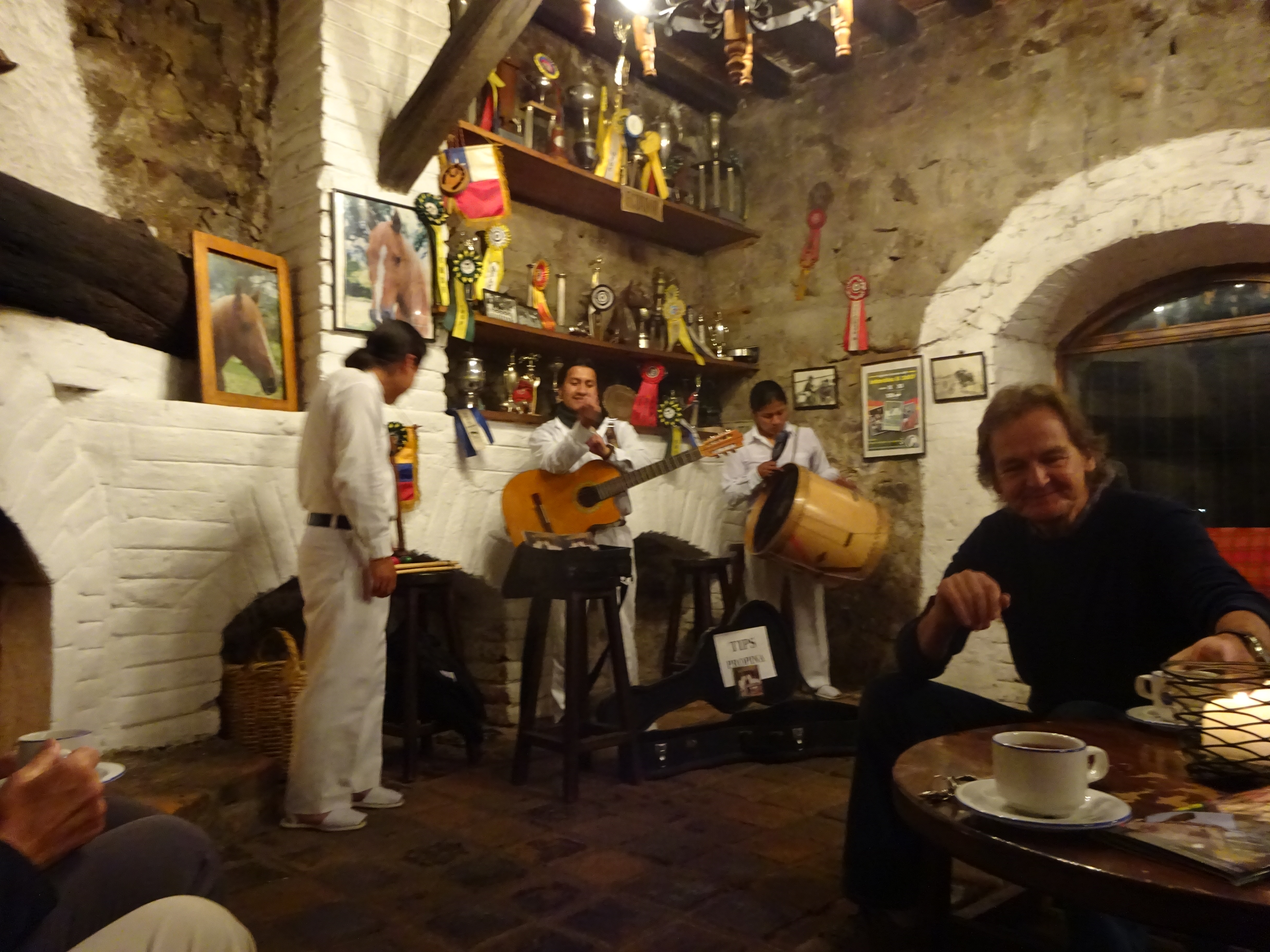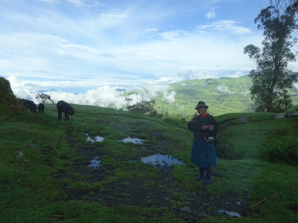 Imagine a classical Spanish Hacienda with stables, a front courtyard of majestic pines, whitewashed adobe walls, noble galleries of 19Century European art and furniture, orange trees on the balcony and horses wandering between giant Auracaria and Palms. Then, imagine that it is called Fawlty Towers, only it is managed by Manuel. Nobody has touched this place since the last Fascisti passed away. I think he might have used our bed. The Manager looks like he might have a black shirt and riding boots tucked away somewhere and he won’t look me in the eye. There are actually 5 Management staff, but only one waitress, one cook and one chambermaid. Our room is cold and damp. The grounds are a mess. There is supposed to be a walking trail, but it is overgrown with thorn and kudzu. The only trail we can find leads to a burbling stream of sewage. We ask if we can go horse riding. Yes – Normally. But..Unfortunatalissimo Signor, the horses, they have no shoes. No problem, they can borrow mine as I intend to be riding on their back. – Ha ha! Signor is, as you say, a funny man. So, disappointamento, we eat, drink and play cards and then… by bedtime, there are 2 oil radiators, a spare downy and… Hot water bottles!… In little knitted cosy covers! All is forgiven and I sleep like I have not slept in Ecuador before.