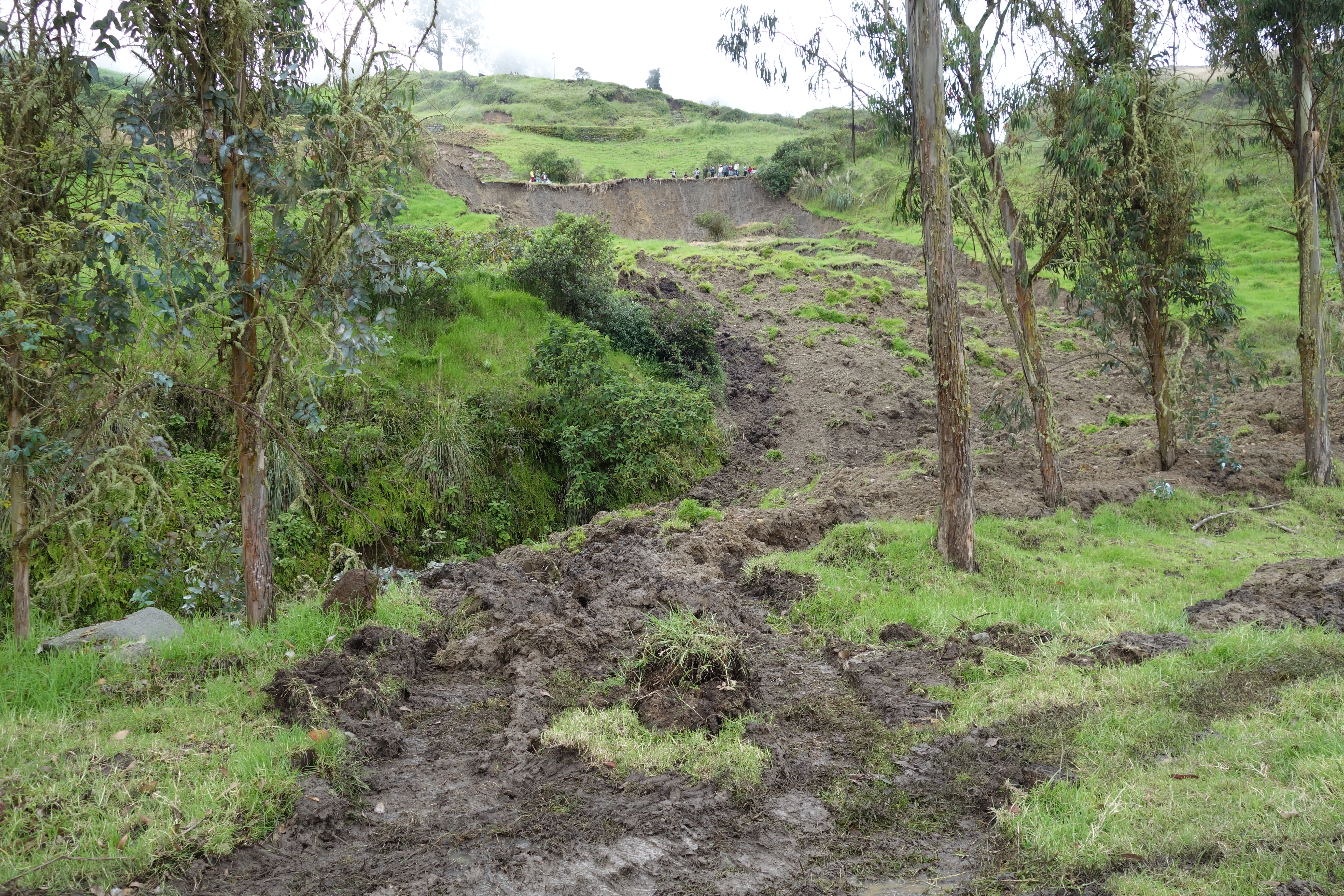 But we are out of it. Only we aren’t. As we pull off our dirt road onto the Pan-American, queues of trucks and buses erupt onto the scene and it’s like the Indianapolis 500 as engines are gunned and they all try to bludgeon their way into the space we are evacuating. Then we have to slow to negotiate a crack that’s as high as a kerb step and cuts right across the road. This is not comfortable. It seems that Ecuador is made up of 95% volcanic ash and 5% landslides. At almost every curve in the road we encounter banks of mud and boulders scattered willy-nilly. Oncoming traffic swerves hither and thither because the cloud has come down and people on both sides of the road are focused on avoiding rocks and potholes. Every 2-3K, the road is replaced by dirt and it’s difficult to see the edges. We have 3 and a half hours of this before we finally coast into Cuenca town, where Milton receives numerous hugs and a well deserved tip. His intention is to turn round and drive that road all the way back to Quito. My intention is to get a hot shower and a cold beer. The tip may have been superfluous – as we may never see Milton again.