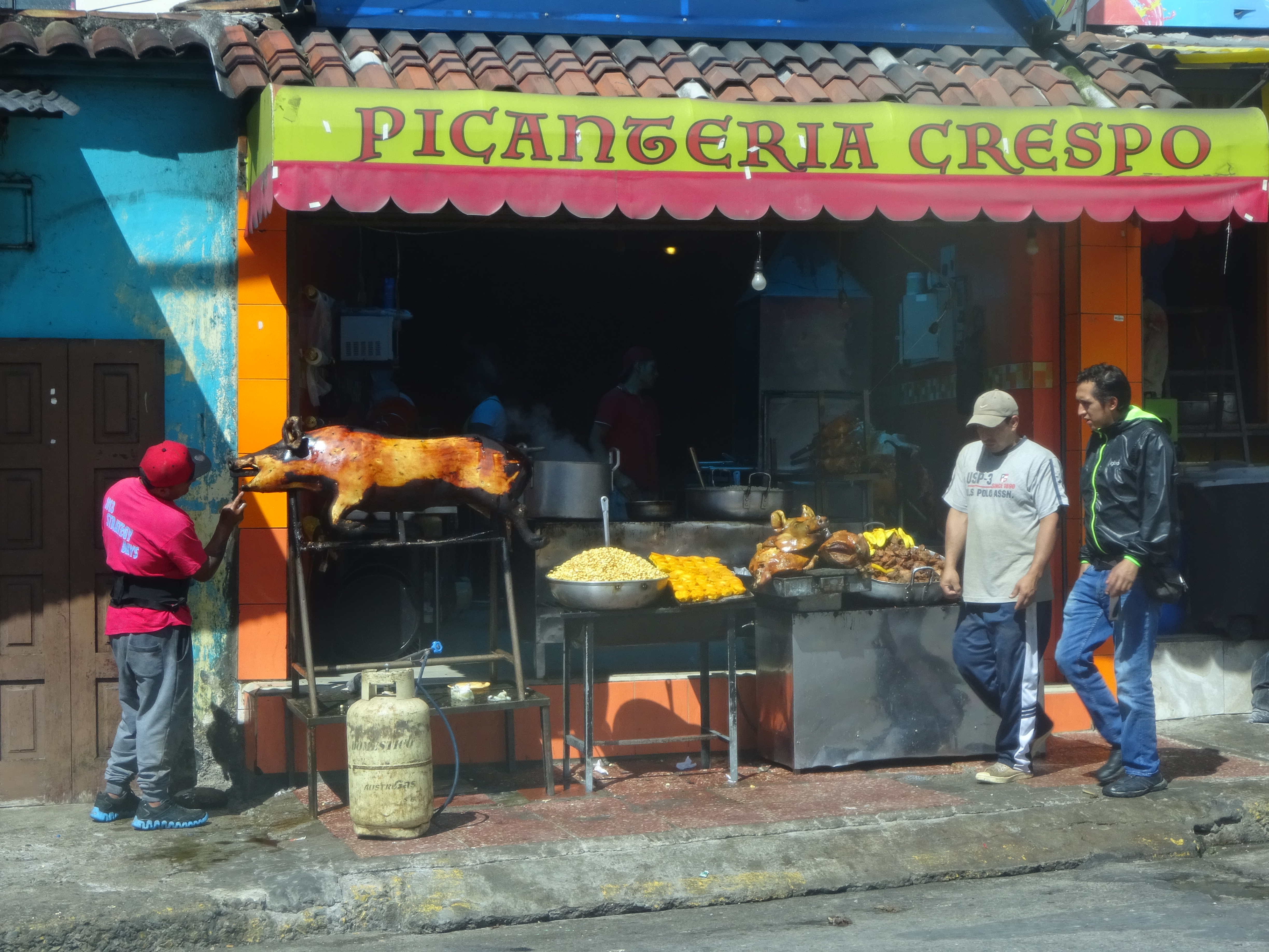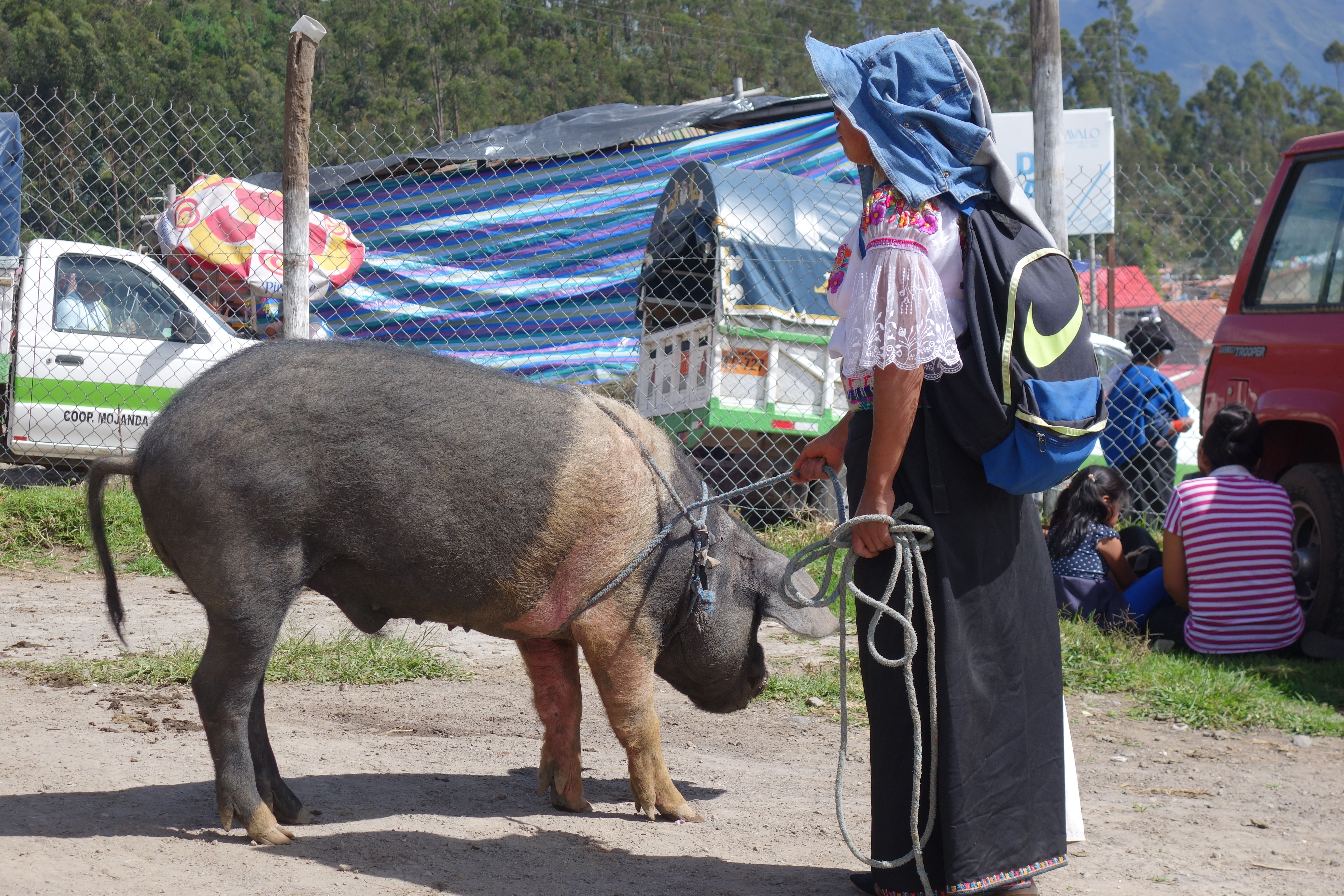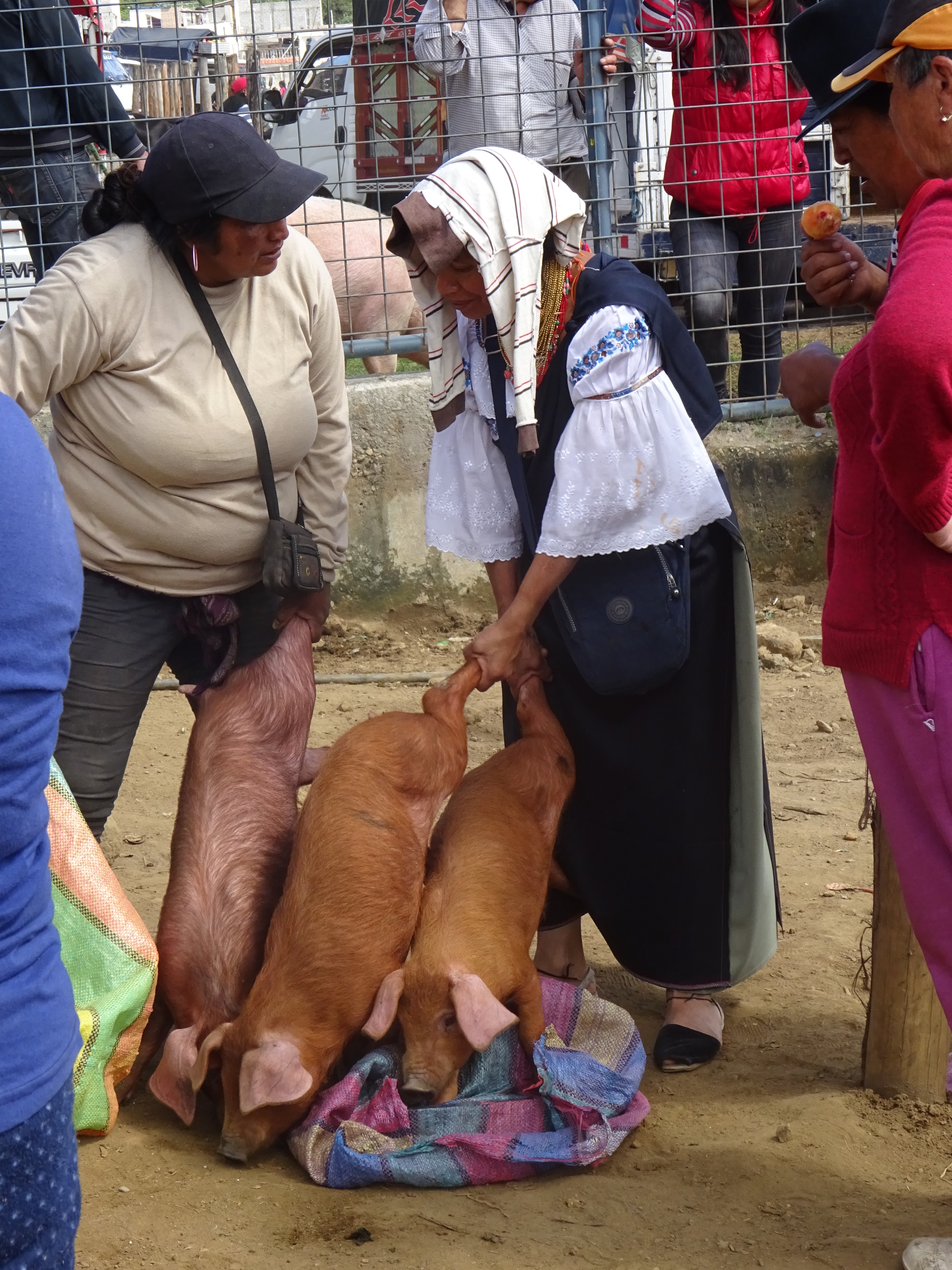 Our guide for the day is Jose, a cool dude in jeans, baseball cap and black T, but Jose actually knows his way around and is one of the good guides. We go first to the Farmers’ Livestock market. A riot of lowing, grunting, squealing, squawking, quacking, cheeping and Chirruping. The animals are pretty noisy too. This place is very local, people get aggressive if you take their photo, but the entertainment value is very high. Dori almost wets herself laughing as one enormous squealing hog drags half the populace round the field as they try to load it on a truck. Cows, ducks, pigs great & small, hens, rabbits and guinea pigs are being traded and trussed.