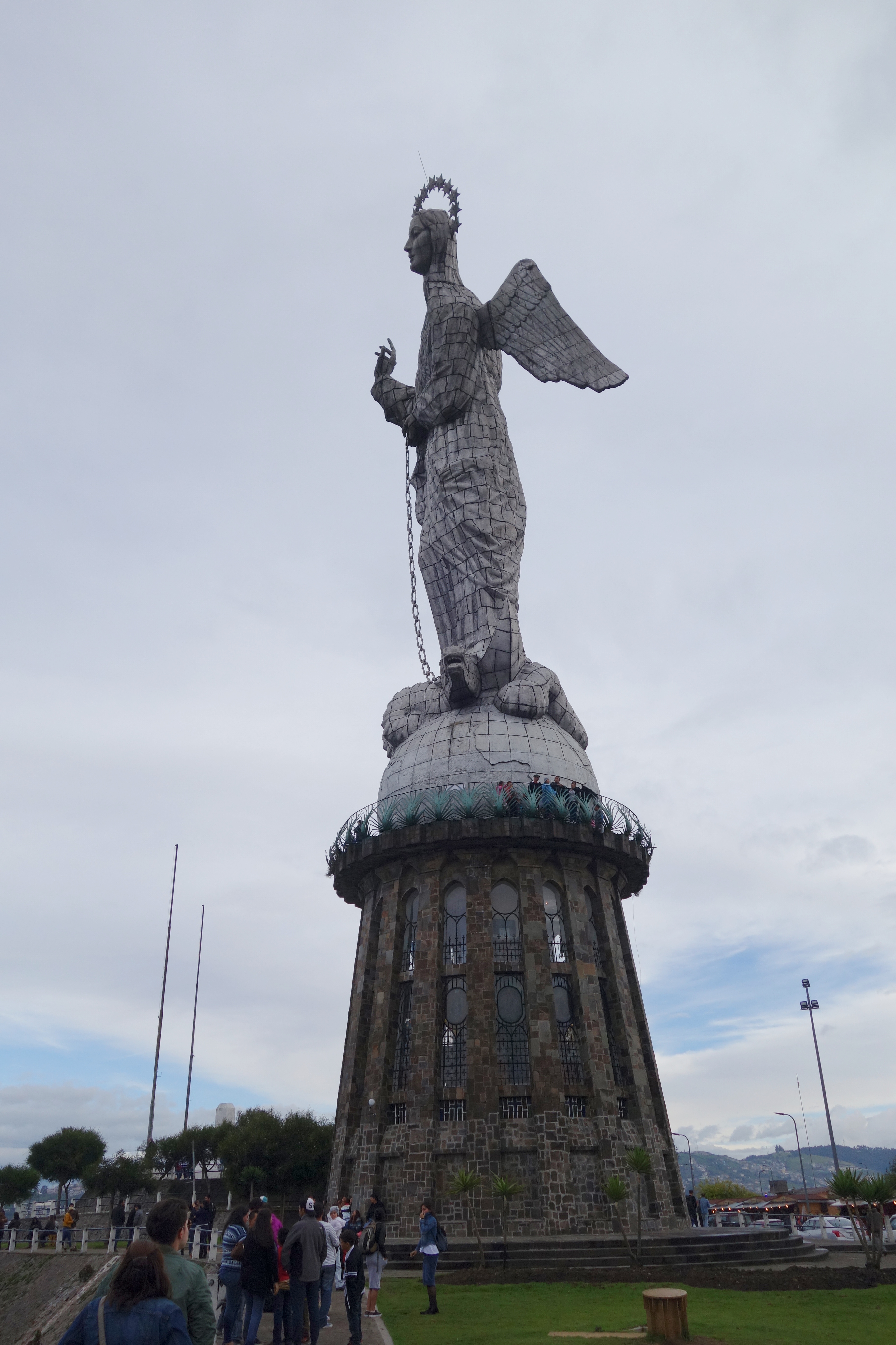 Back in town, we went to see the Giant Mary statue that stands on an overlooking hill. Giant Mary has her foot on a giant snake with a Dragon’s head and Giant Mary has really weird wings and I don’t remember any of that from Sunday School. Giant Mary is also made of patches, like a quilt, but actually more like a skin suit stitched together by a mass murderer.