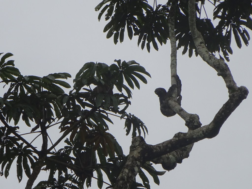 “Monkey!” shouts Luis and, over to the right is another species, Monk Saki and we get a full lecture on species diversity in the Secondary Forest. Everybody is prying cameras and binoculars out of bags, but after the cold of Quito we are into the humidity of the Amazon and everything fogs up and we are all cursing and wiping and cursing. The bus lurches off and screams to another stop. “Sloth!” shouts Luis and this time we are all herded onto the roadside to get a better look. “Where? Where?” we plaintively cry. “There! There!” shouts Luis and manipulates a dozen Gringos into a variety of positions to see the Sloth. It’s not like they move very fast. Then somebody says, “Oh-there!?!?” and suddenly we can all see it, exactly where Luis has positioned us.