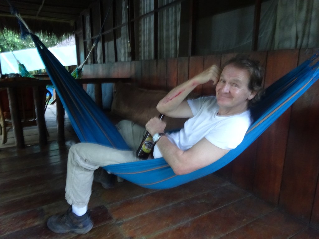There is a communal dining/lounge area and a small verandah down at the waters’ edge. I introduce myself to the other guests by slipping on the first step down to the verandah. My feet fly up in the air and my back cracks across the step edge. My right forearm helps to cushion the fall by sacrificing the skin which is grazed away from elbow to wrist. The blow to my pride being softened by the agony of the blow to my back. I am helped back up, painted from head to toe in Mercurochrome and shown the sign that says, “Slippery Steps”. Luis asks if I am okay and I reply, “Of course, thank you. I am English”. This is greeted with a smile which acknowledges the unspoken words, “We are not American,We don’t sue”. This is the Jungle after all.