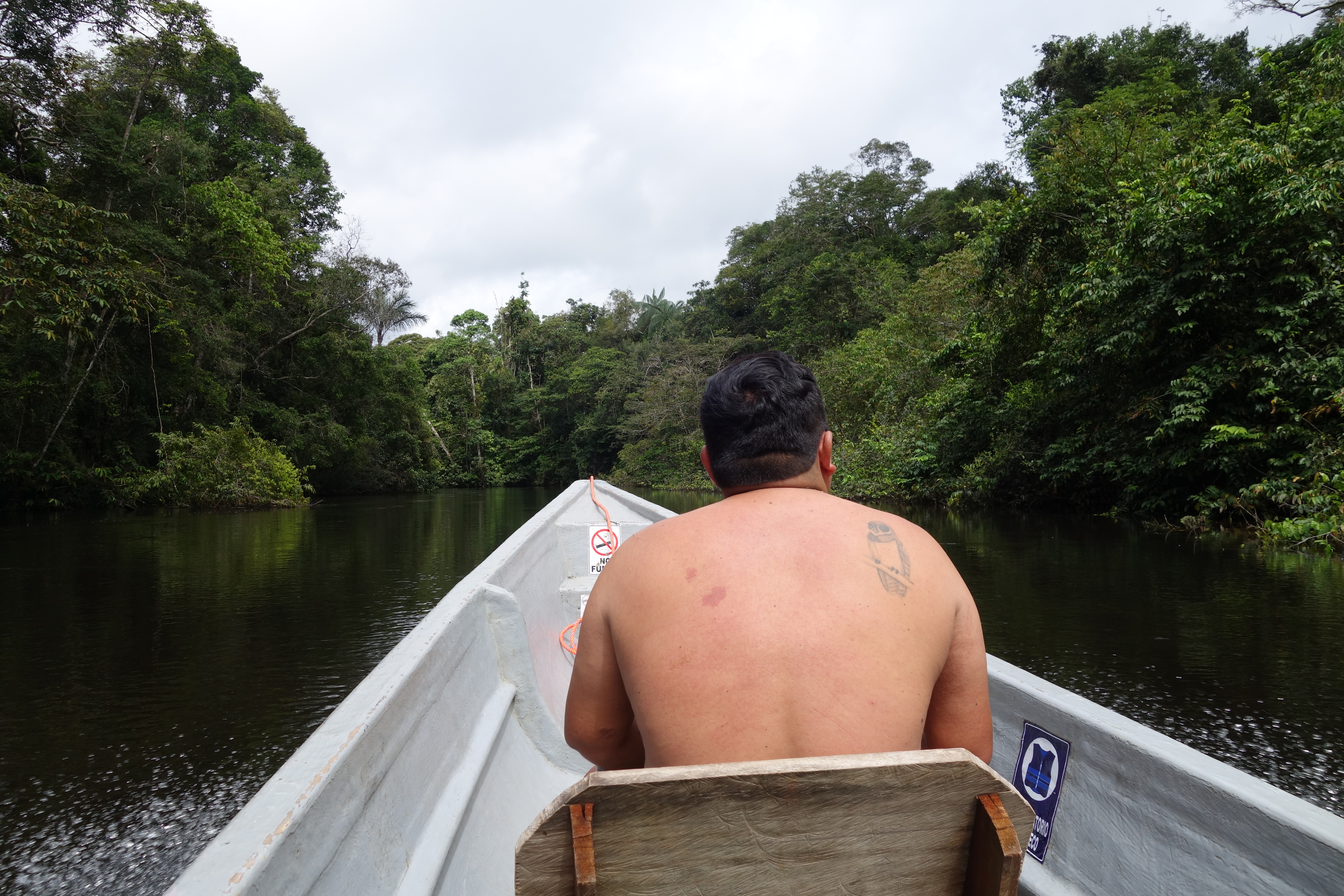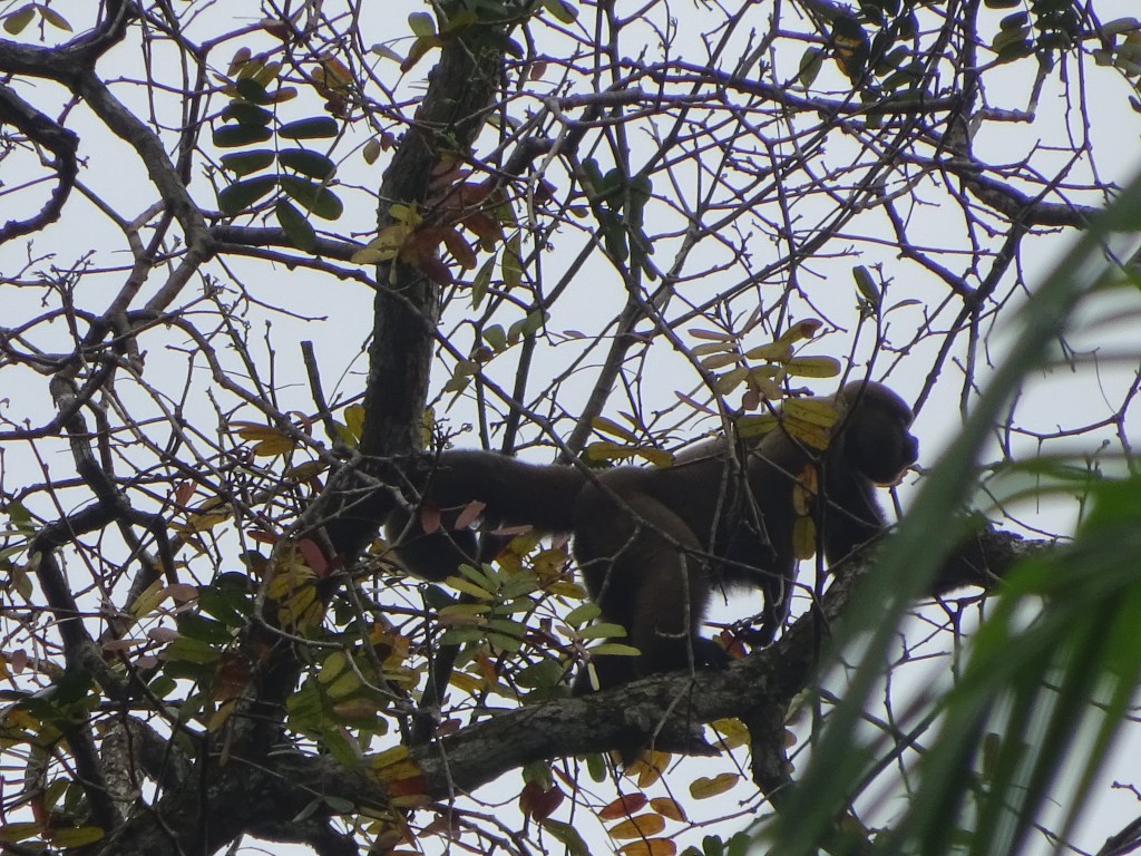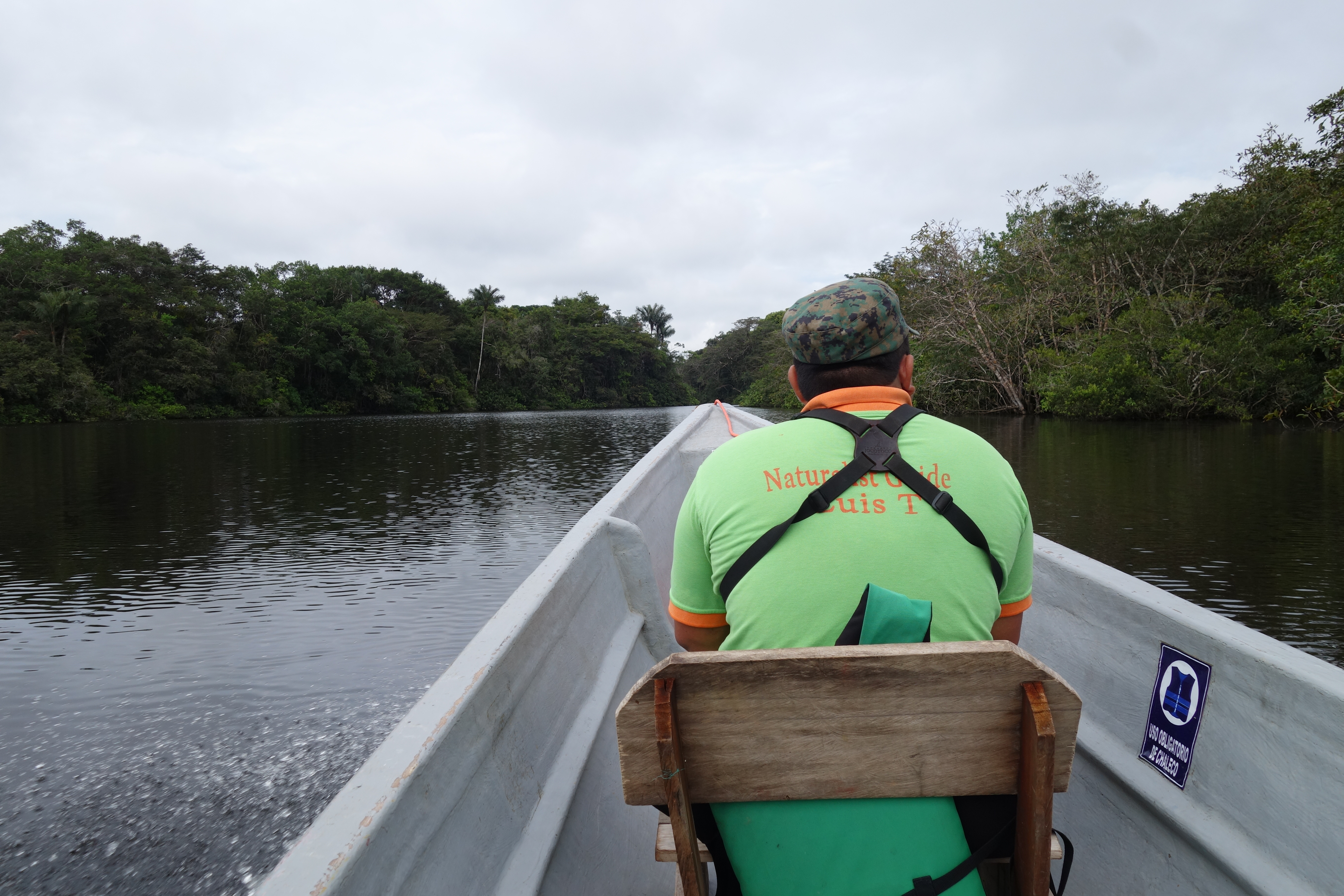 This is the way it’s going to be for the next 6 days. Luis is the Guide of guides. Short, stocky, no neck bullet-headed. His eyes are on gimbals. It is scary what this man can see and we can’t until he contorts us into impossible shapes. “Look! Look!” and suddenly out of the mind boggling shapes, colours and textures, an animal appears. The bus careens on for 2 hours through roughly farmed and roughly populated landscape, with one or two stops to keep us on or toes, until we reach the fringe of the Cuyabeno Reserve. Bags are transferred to canoes as we eat a basic lunch in a basic canteen. Then, we get divided up into 2 canoes, handed a rain poncho and a life jacket and tear off down river. Around the first bend, the canteen disappears and that’s it, Civilisation has come to an end. This is primal. “Monkey!” shouts Luis and the outboard grinds into reverse. No change there then.