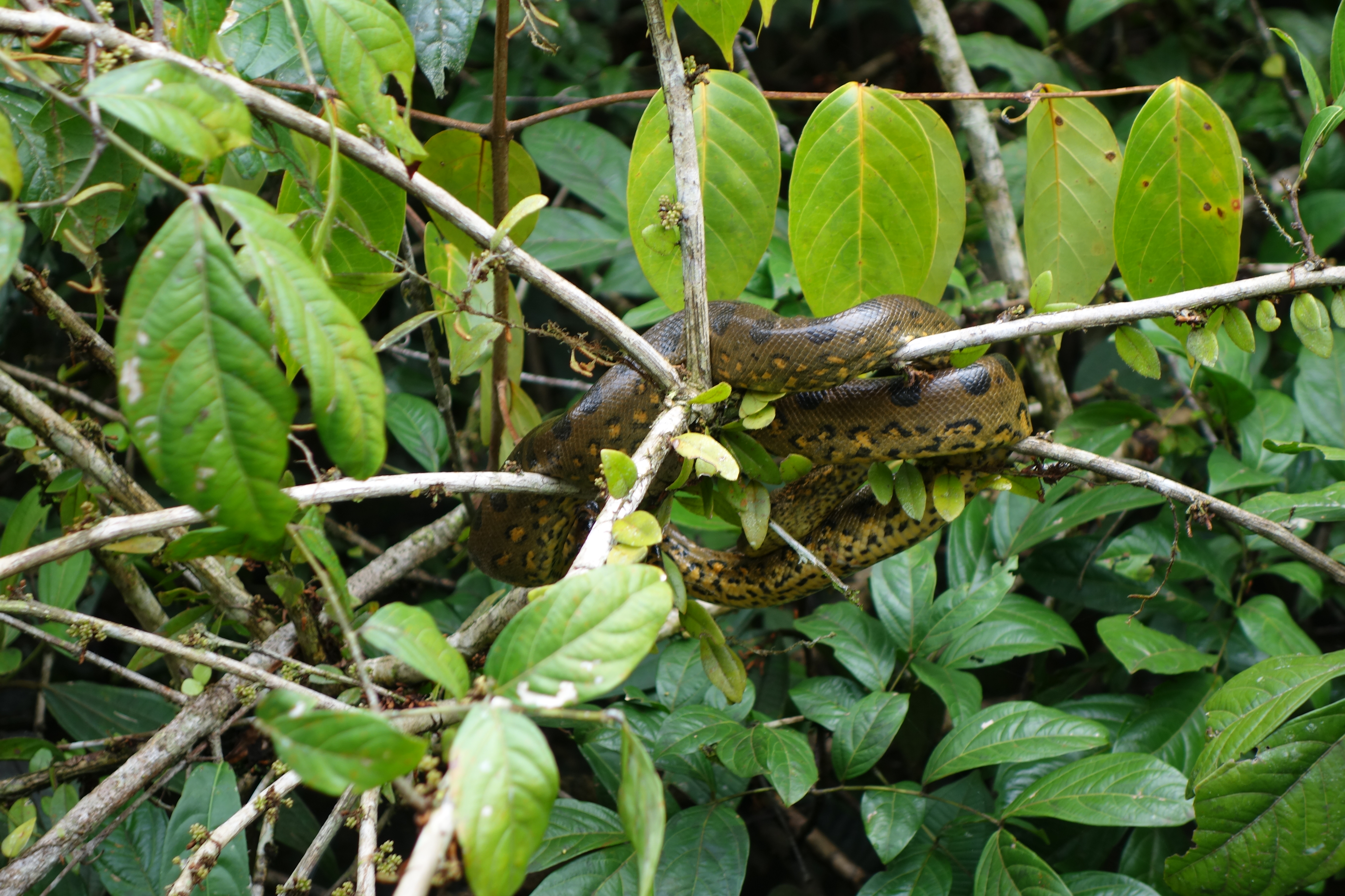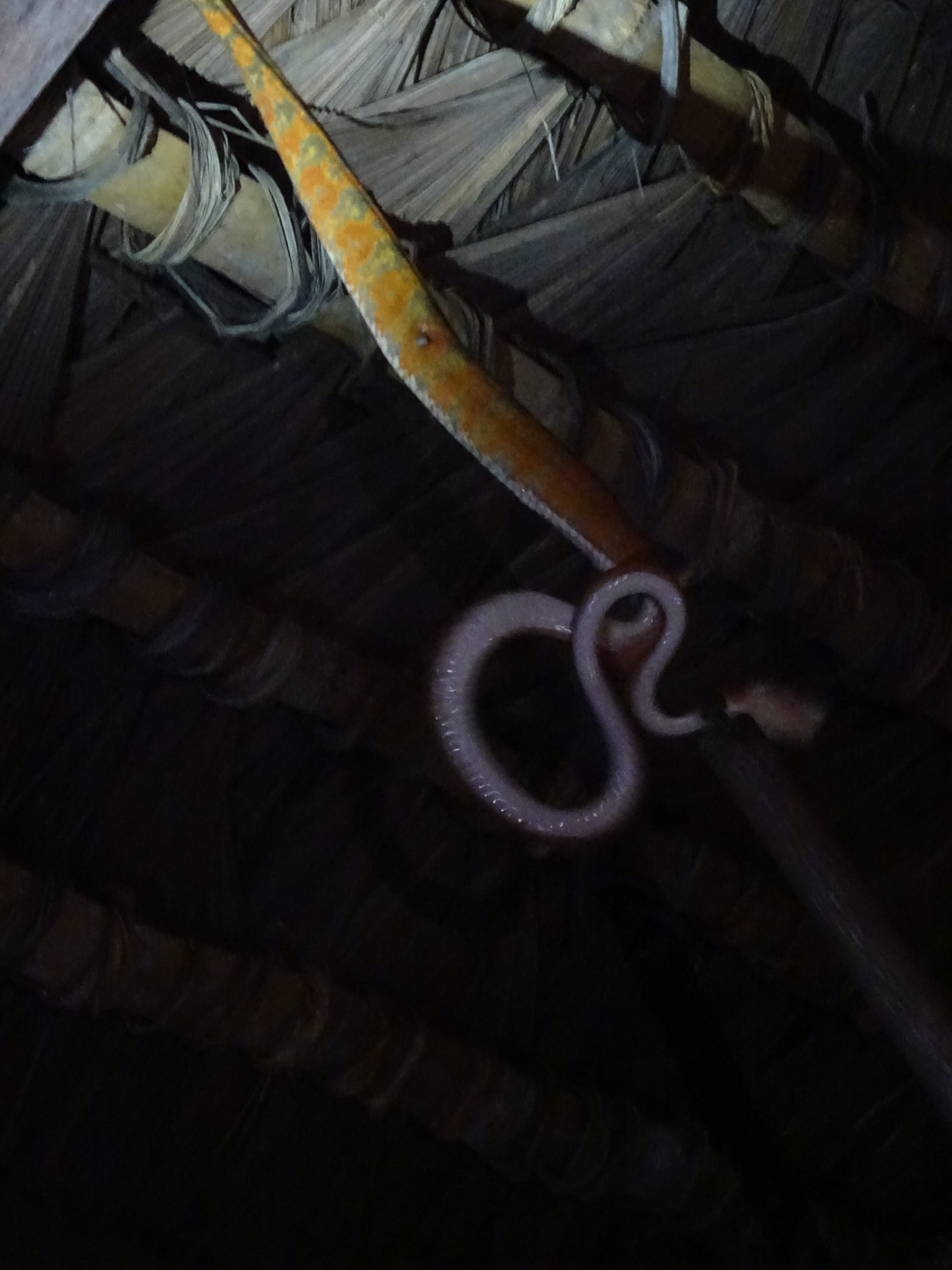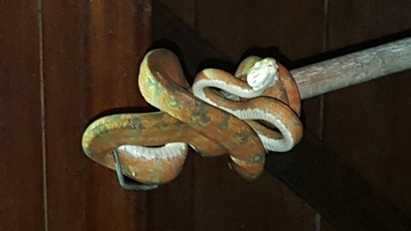 Having been out in the Jungle all day, we would return, exhausted, physically and mentally. On one such evening Dori beat me into the shower. There was a knock on the door and there stood Luis. “You have another visitor”. I looked behind him at the Manager. “Not him. We need to come in”. I let them pass, Luis had a big stick with a hook on the end and shone his torch up into the rafters. I could see a slight movement and a flash of Gold. He slowly pushed the hook into the thatch and started to pull out our visitor. I called Dori out of the shower and we watched as Luis teased and eased 1.8metres of Golden Boa Constrictor into our room. That was an incredibly beautiful animal. Not really dangerous to the likes of us but, if he fell on you, he might be tempted to bite.