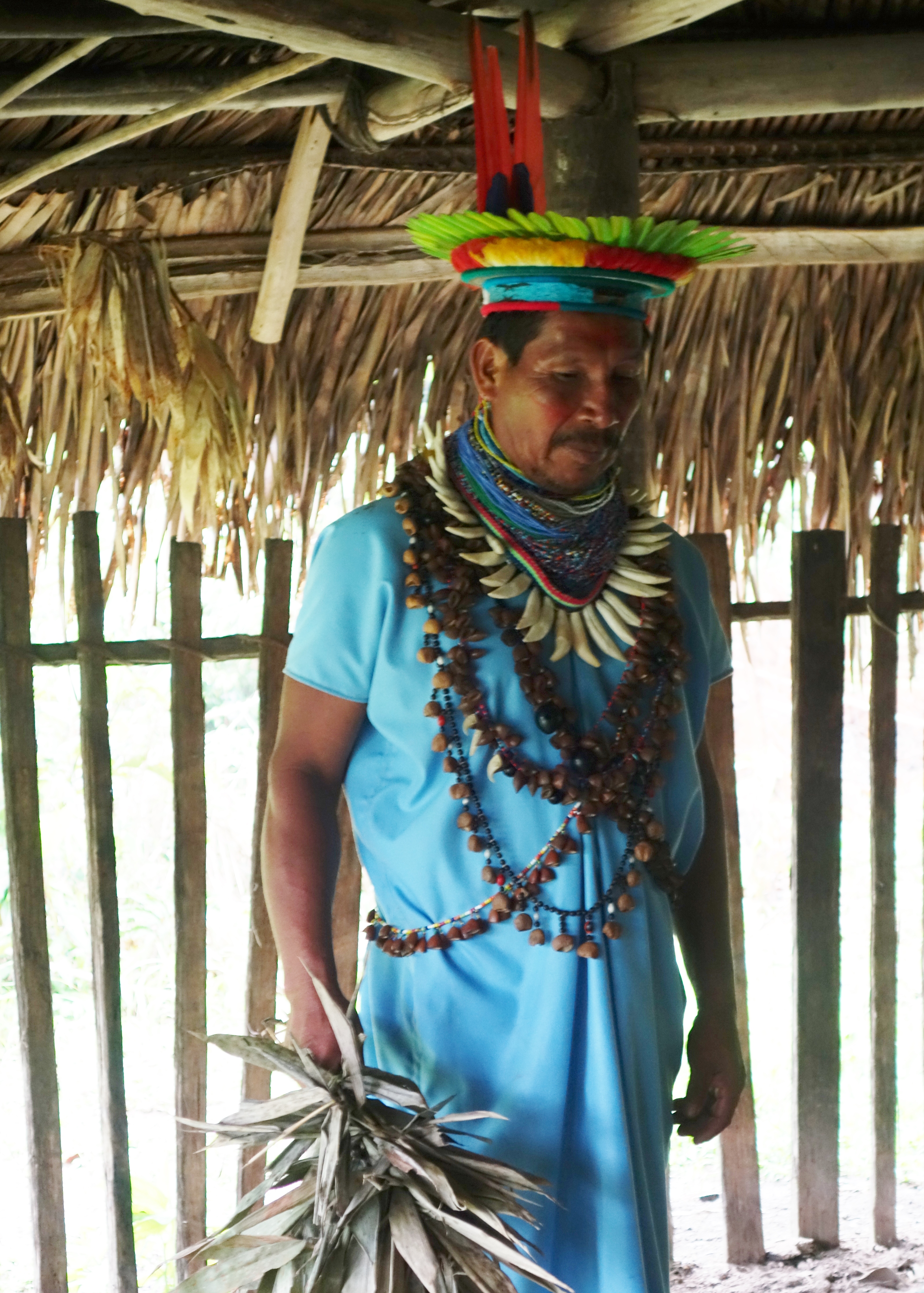 We meet the local Shaman, weighed down by beads and teeth and with a hat of parrot feathers that would give Dolce and Gabbana something to think about. He is a very smiley man and we all get a shot on his blowpipe, with a reminder that it is important to suck in your breath before you put pipe to mouth. There could be consequences otherwise.