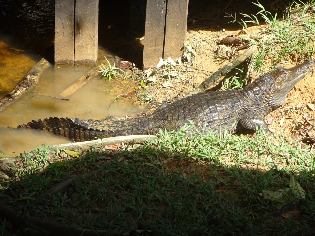 The engine cuts, the pointy end penetrates the foliage and there is a small pier. Welcome to Siona Lodge. 3 staff, 2 guides, 3 boatmen, 16 guests and there, just where you are about to step off the boat, a 2.2metre White Cayman called Pancho.