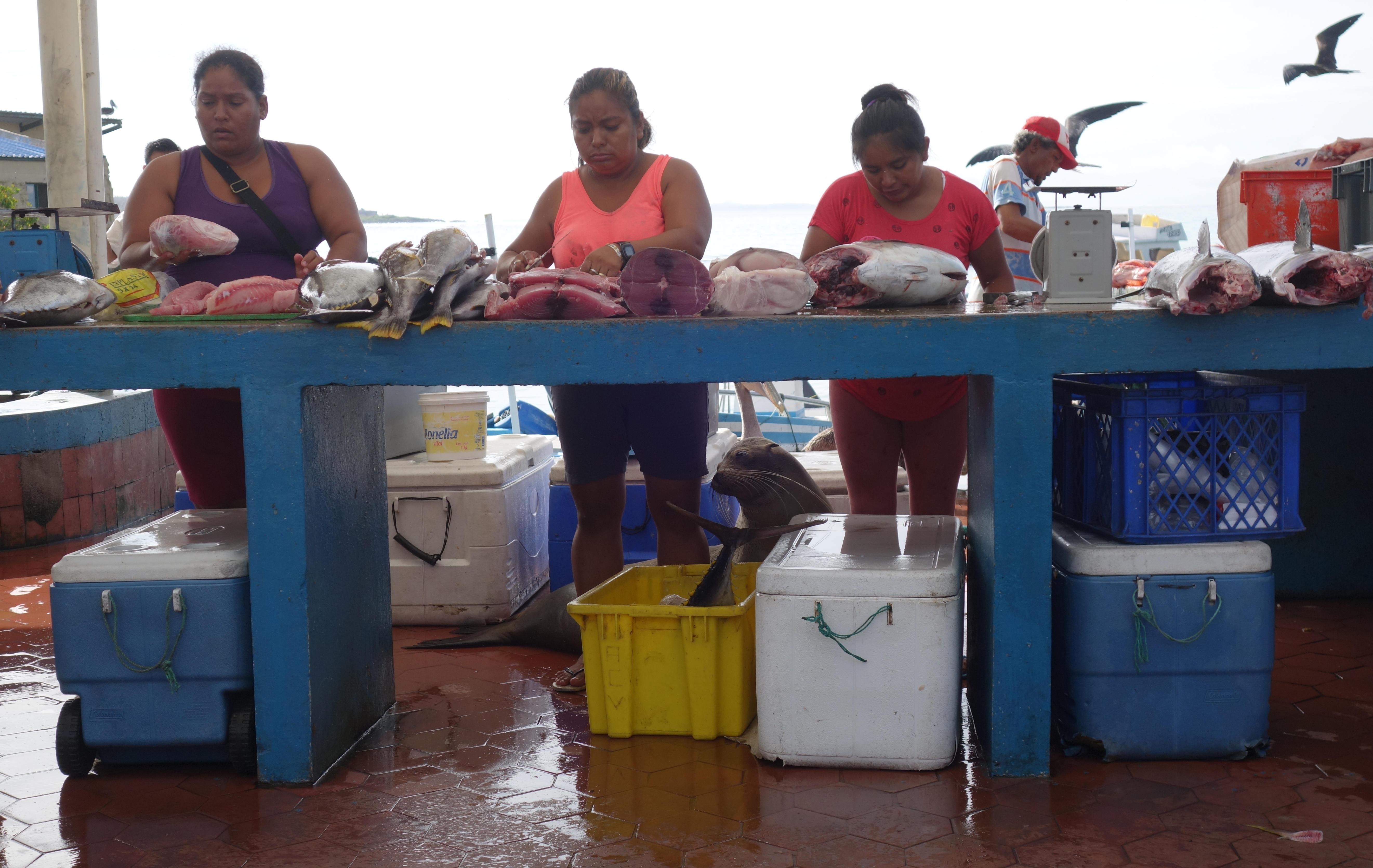 We walk through the town of Puerto Aurora and stop at the fish market, which is basically a shelf where 3 ladies chop up fish. A sealion lounges over their feet and cleans up scraps. The air is filled with wings as Frigates and Pelicans fight over guts. We carry on to the Charles Darwin Research and Development Station where the remaining Giant Tortoise have been secluded and are encouraged to bonk. It doesn’t seem like they need much encouragement.