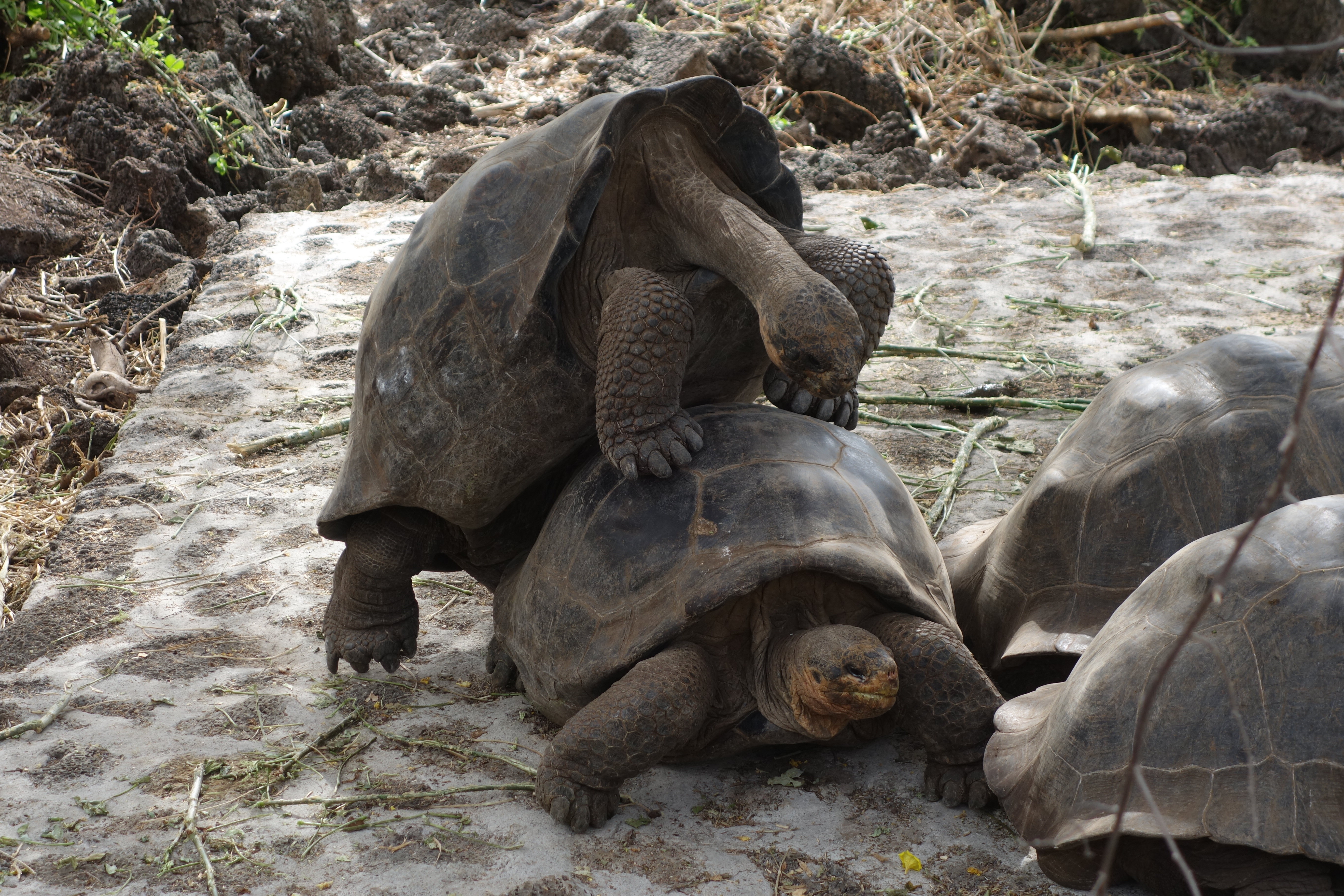 Galapagos is translated from the Spanish for “Intercourse-at every available opportunity”. We are surrounded by giant beasts, who carry their own caravan, humping. The air resounds with “Grunt! Crack! Pause, pause, pause, Grunt! Crack!” ad infinitum. The act requires the Male of the species to clamber up the back of the Female’s carapace and then, with a thrust of the hips, a straining of the neck muscles, a cracking of shells and a grunt worthy of a WWF wrestler, attempting to make babies. Giant Tortoise do everything slow, so it’s pretty much 4 grunts to the minute. A full bonk lasts about a week and the girls spend most of the time trying to crawl under a branch in an effort to topple the old guy off. In one compound there are only males, so guess what? Yup. Like any other prison, one guy is getting a sore bum.