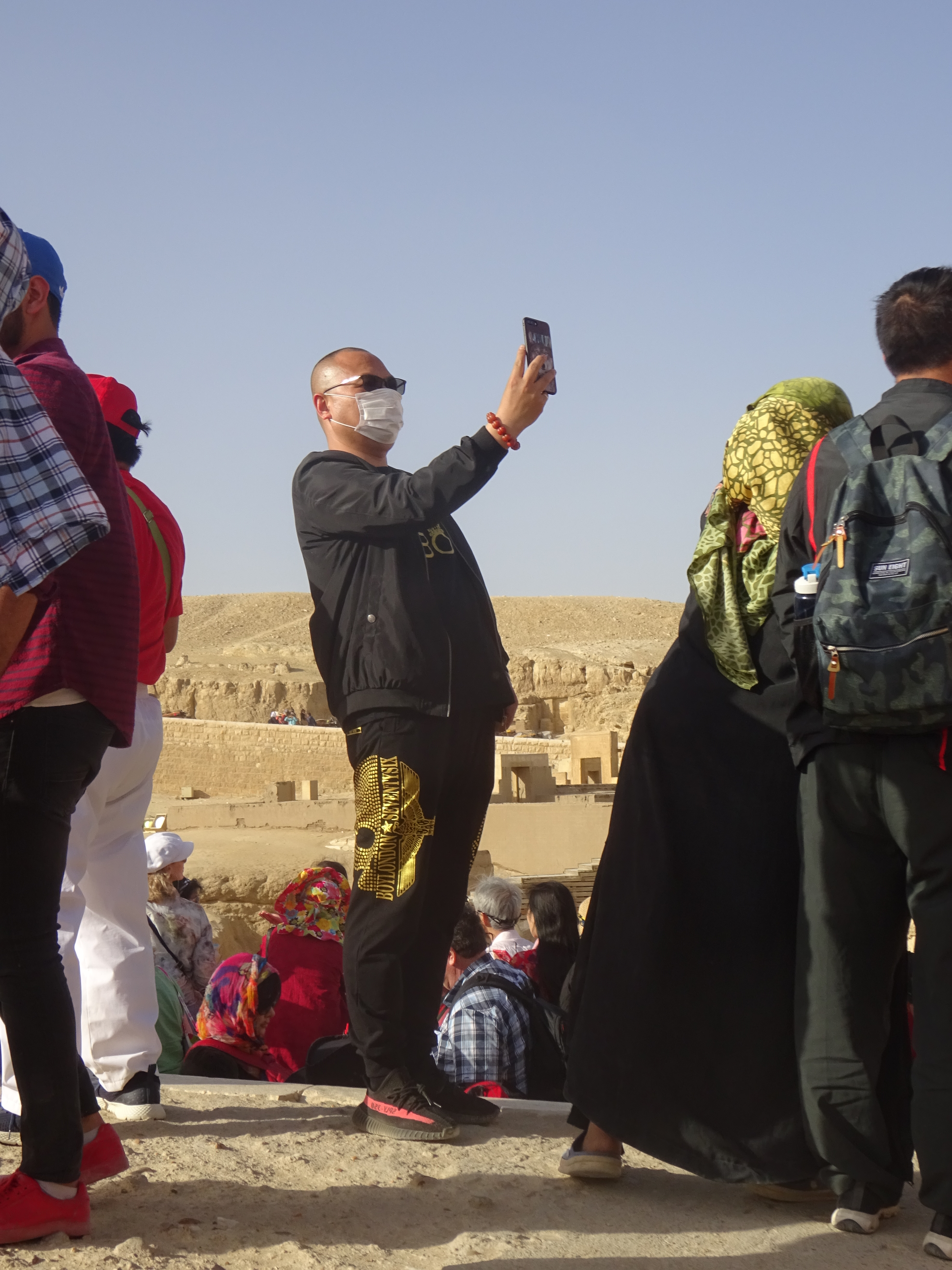 Suitably refreshed our Guide, Imam, had us straight off to the Pyramids to mingle with the Chinese and Koreans wielding selfie-sticks in the cradle of civilization. The Pyramids of Giza are still cool, rising majestically above the chaos of Cairo, but boy are they mucky. Plastic bags soar like vultures in miniature whirlwinds of hot air, the ground is almost concrete; 2 parts broken rock: 3 parts sand: 5 parts camel poop. The inside of the Great Pyramid of Cheops is massively forgetful, the Government limits the number of paid tickets but, thanks to the wonders of baksheesh, this is completely ignored and it’s a bit galling, having paid full whack, to be surrounded by whining four year olds who are convinced that their parents have brought them to hell. Our Guide tells us that the Egyptian People are very proud of their Cultural Heritage, but all I see is people ripping it off.