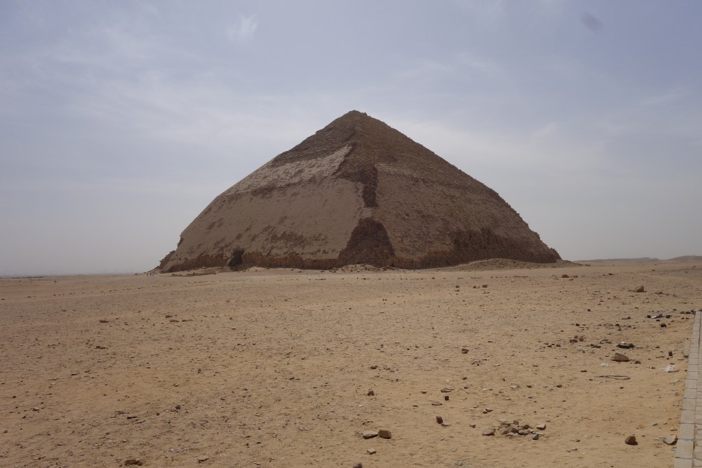 We drive out into the country and, immediately, the hordes are left behind. There are Date Palms and fields of wheat. Donkey carts piled high with alfalafa, turbaned drivers cracking whips. Camels plodding by loaded with palm fronds hanging from their backs looking like bizarre four-legged peacocks. The irrigation stops and the desert starts, the division line is brutal and so is the heat, once you leave the shade of the palms. It is stony and ugly, but the ruins of five huge Pyramids rise out of the sand, mostly ruined, but two are pretty impressive. Built by King Snefru, originator of the word “Snafu” (I believe), the first is known as the “Bent” Pyramid, not because of his inclination, evidently many of them were ‘switchers’, but because of the Pyramids’ inclination.