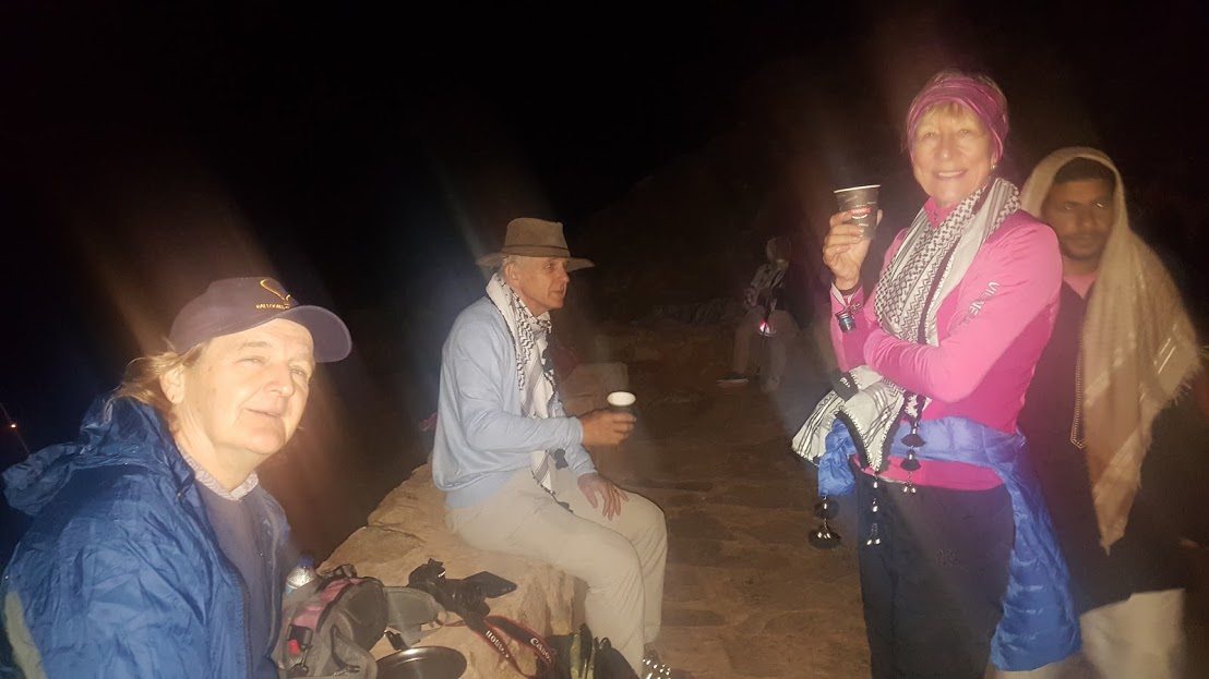 Being the Grim Pills that we are, we rise at 2.00a.m. and are introduced to our Bedouin guide, Jamile, who is going to take us to the top of the mountain. We set off on foot while all the real pilgrims are mounting camels for the 3 hour trek to 2,286m. The night is pitch black and cool and the desert stars are breathtaking. Our lights startle a Desert Fox who stands transfixed for a moment before loping away over the rocks. We start to climb and soon encounter the first of many camel trains, some of them carrying hymn singers. The track is narrow and rocky with sheer drops in places, but we have to pass them otherwise it’s going to be a 3 hour climb with your face in a camel’s arse. Camels are not inclined to give way and we have to scramble, duck and weave to avoid getting pushed over the edge or stood upon.