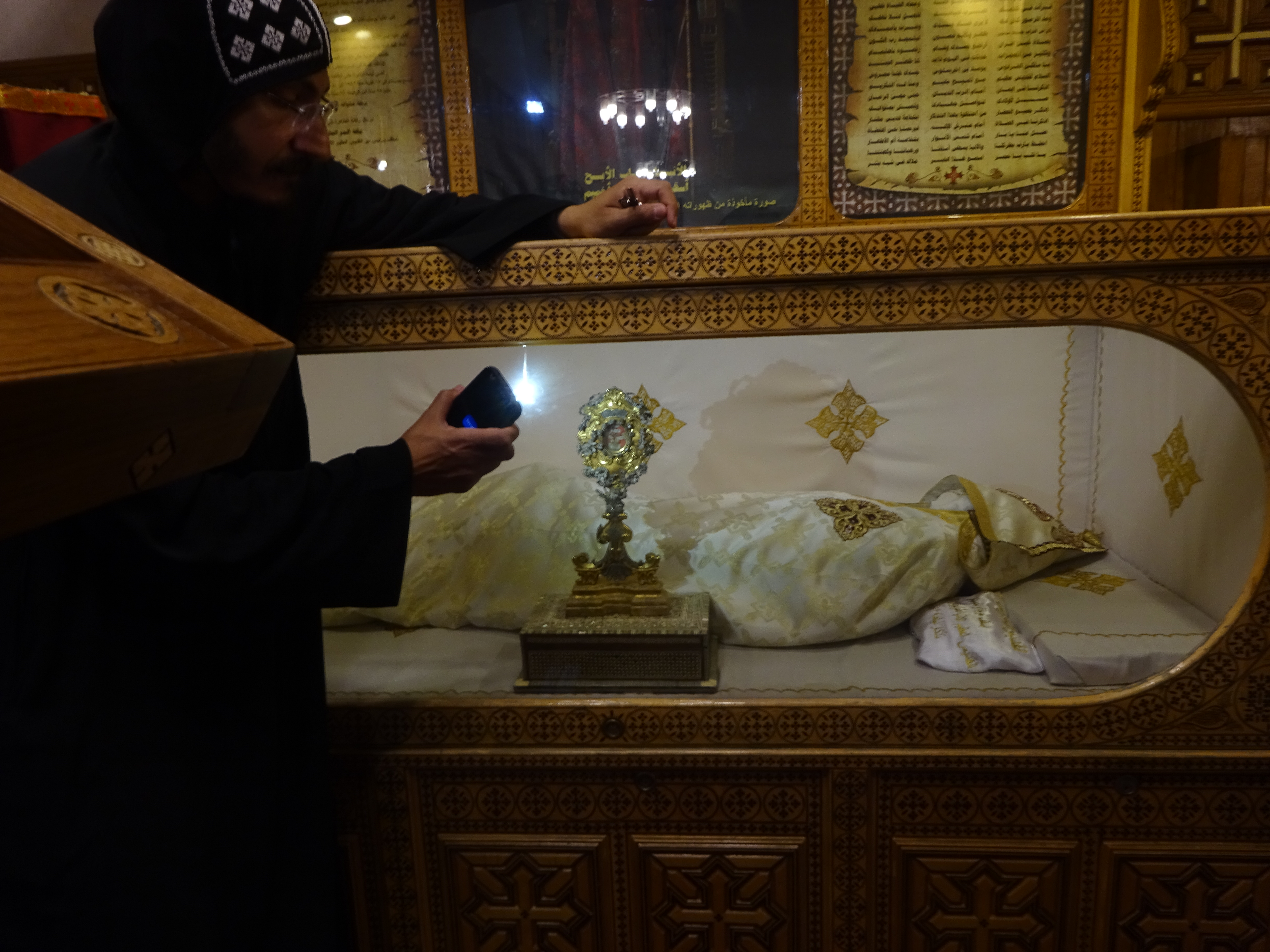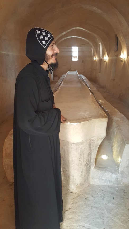 Having climbed back down to the Monastery, we were greeted by Brother Lucas. He looks young enough to be my son, he wobbles a bit because this is one of his 260 fasting days in the Year, he wears a long black robe and a little hooded cap tied under his chin and embroidered with white Coptic crosses on top. He used to be a dentist so, okay, I can understand how this might be a better life. He can only just manage a very scraggly beard and is in no way handsome but, he is one of the most beautiful people that I have ever met, a gentle man.