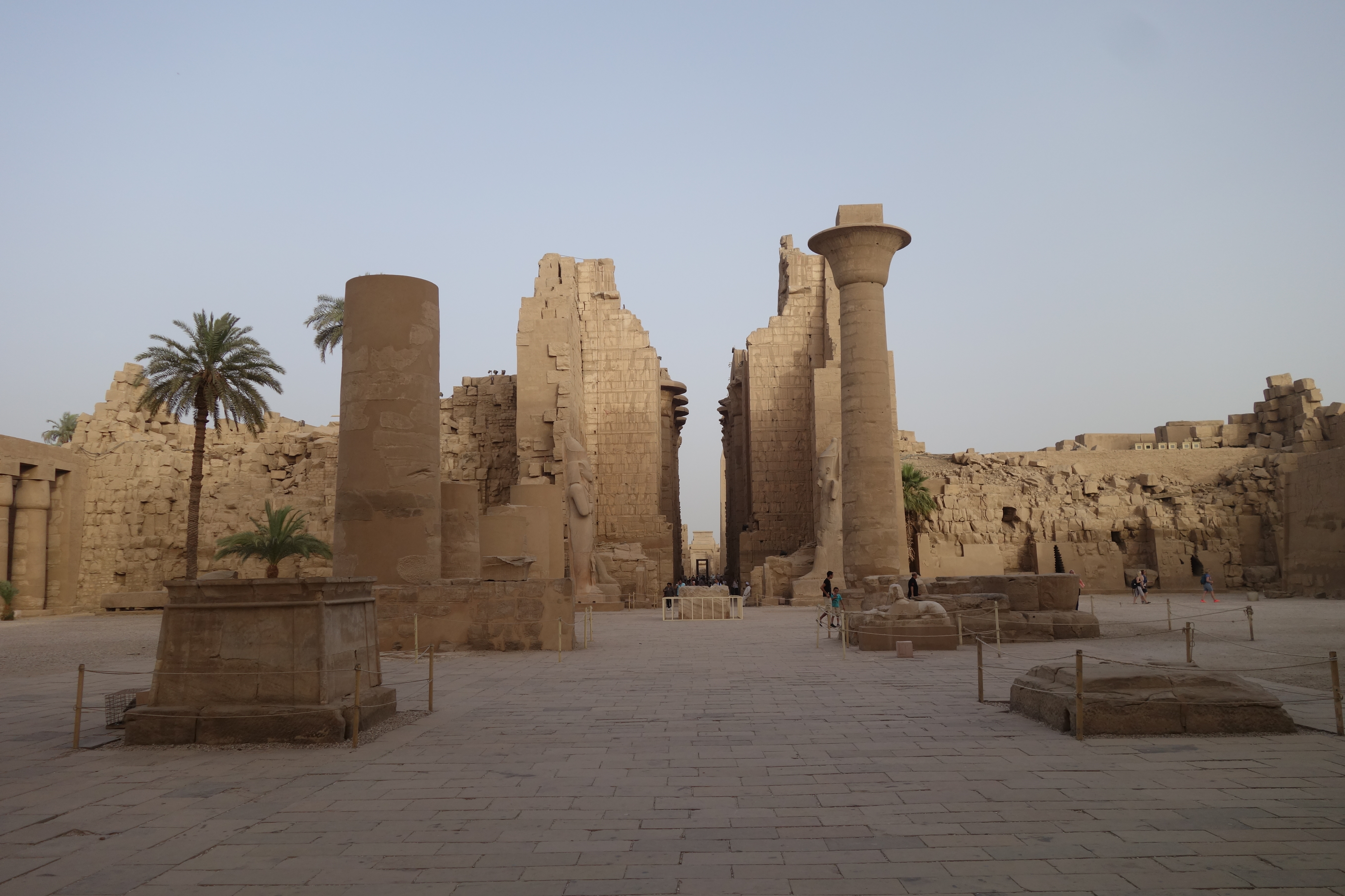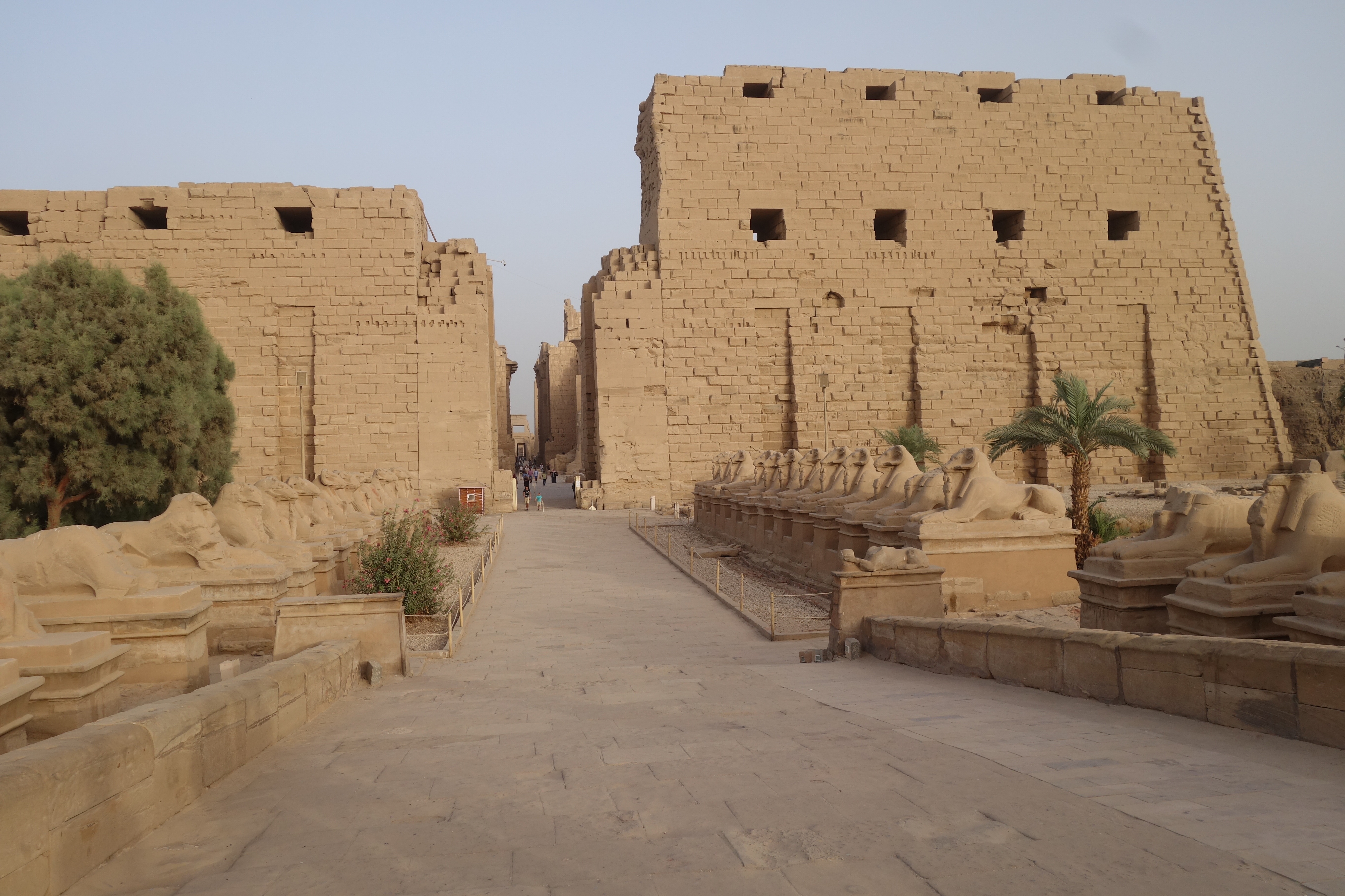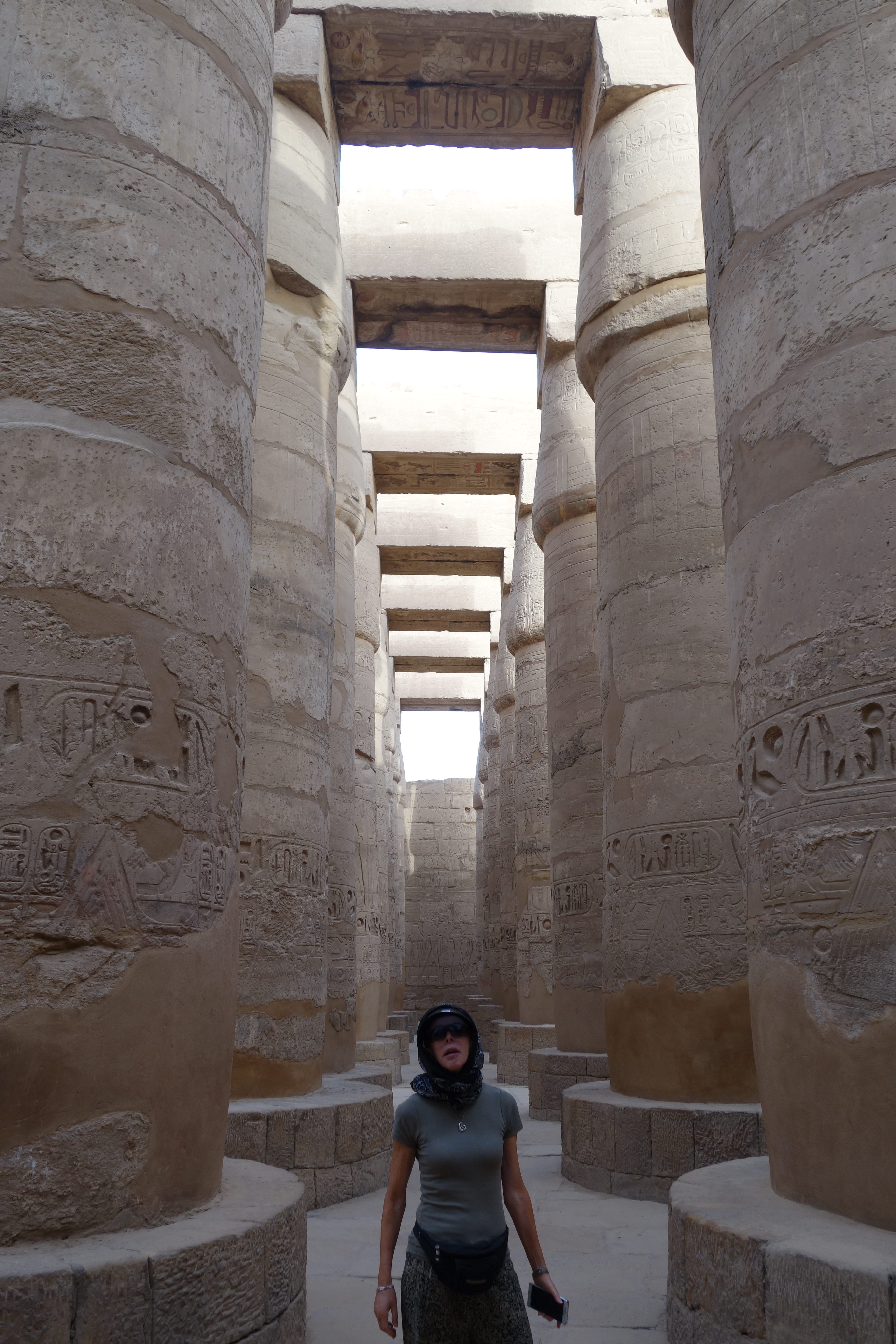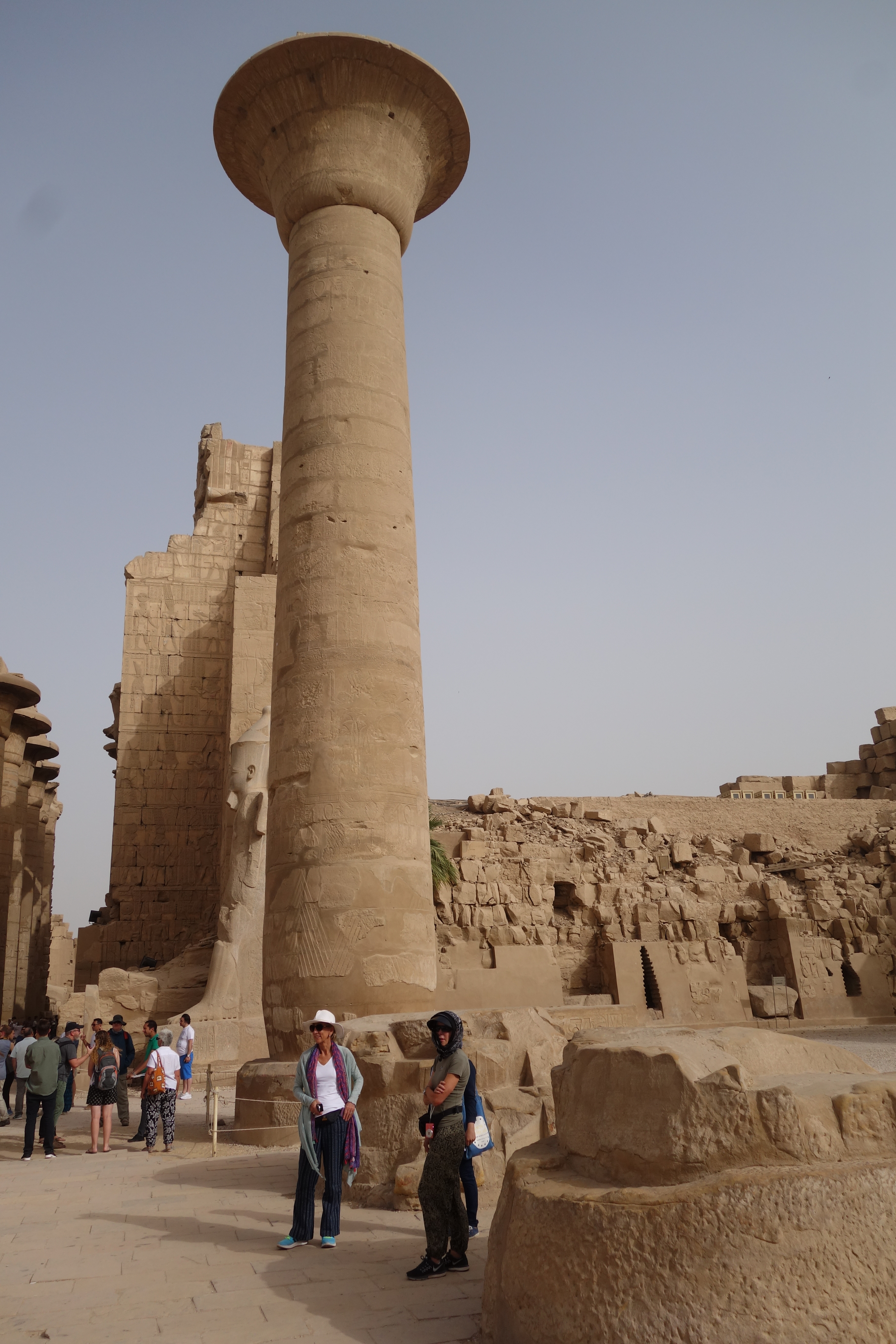 In the terminal, it takes an age to get our bags and, when they arrive, they look like they have been towed behind the plane, clouds of dust erupt when we pick them up. The local boss of Djed meets us, Osama, 6’2” of Egyptian cool with a mobile phone surgically attached to his ear. He is so cool that it’s difficult to tell if he is awake. Having lost a day we opt to drive straight into Luxor and get on with it, so the bus drops us at Karnak Temple where we meet Summa, our next Guide. She is sweet, very knowledgeable and talks at 78rpm. There is a lot of information, a short time and there will be a test.