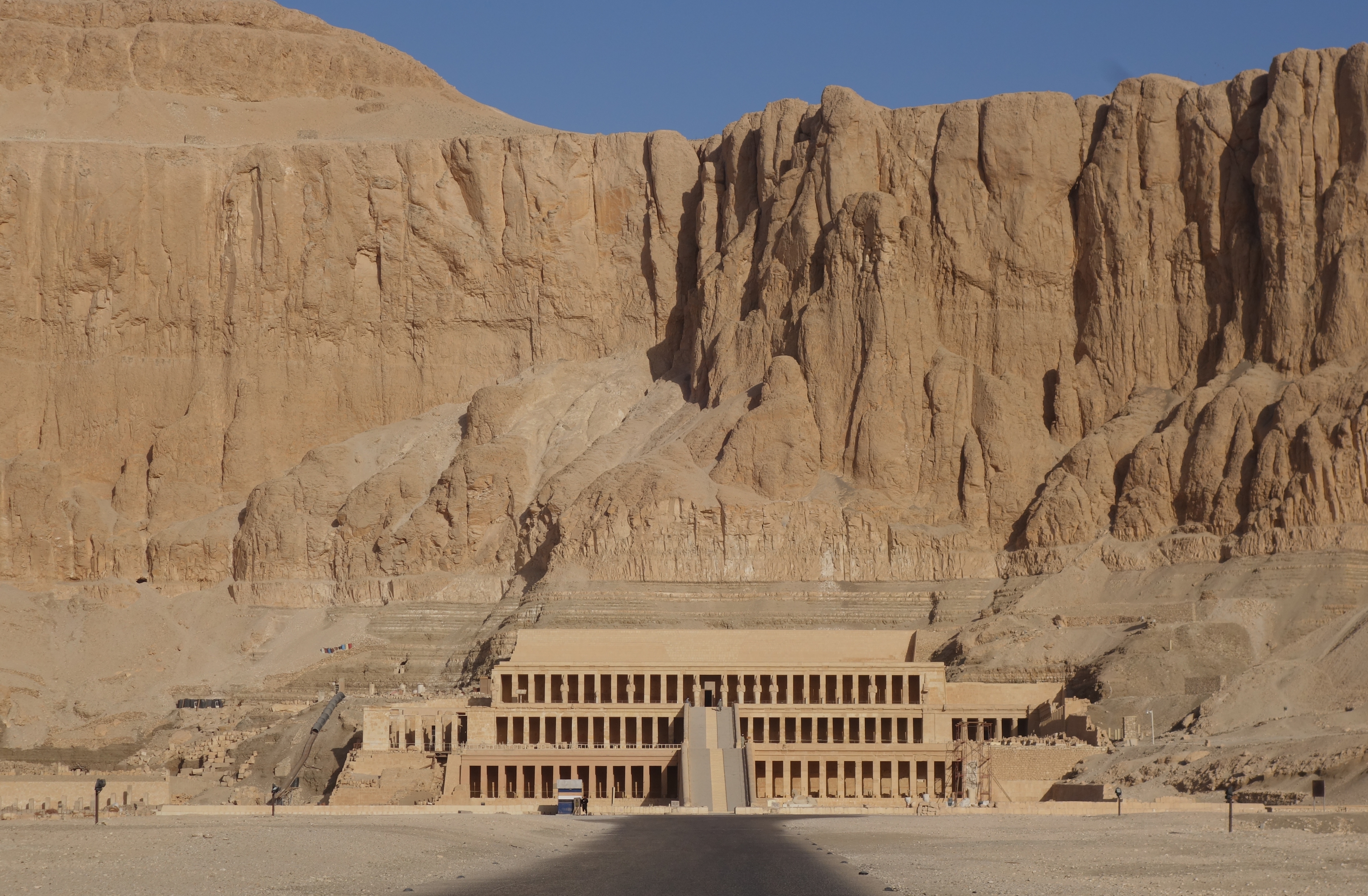 We cross the wheat field/desert divide to the Temple of Hatshepsut. The death of the Pharaoh left his 9 year old son in charge with his step-mum as guardian, but she did a deal with the Head Priest (Baksheesh) and, with the help of a false beard and a tight vest, she ruled as a man for the next 23 years. Go Girl. She evidently did a better job than most blokes and built herself a spanking temple although, when her stepson finally got around to pulling off her beard, he did his best to rubbish it.