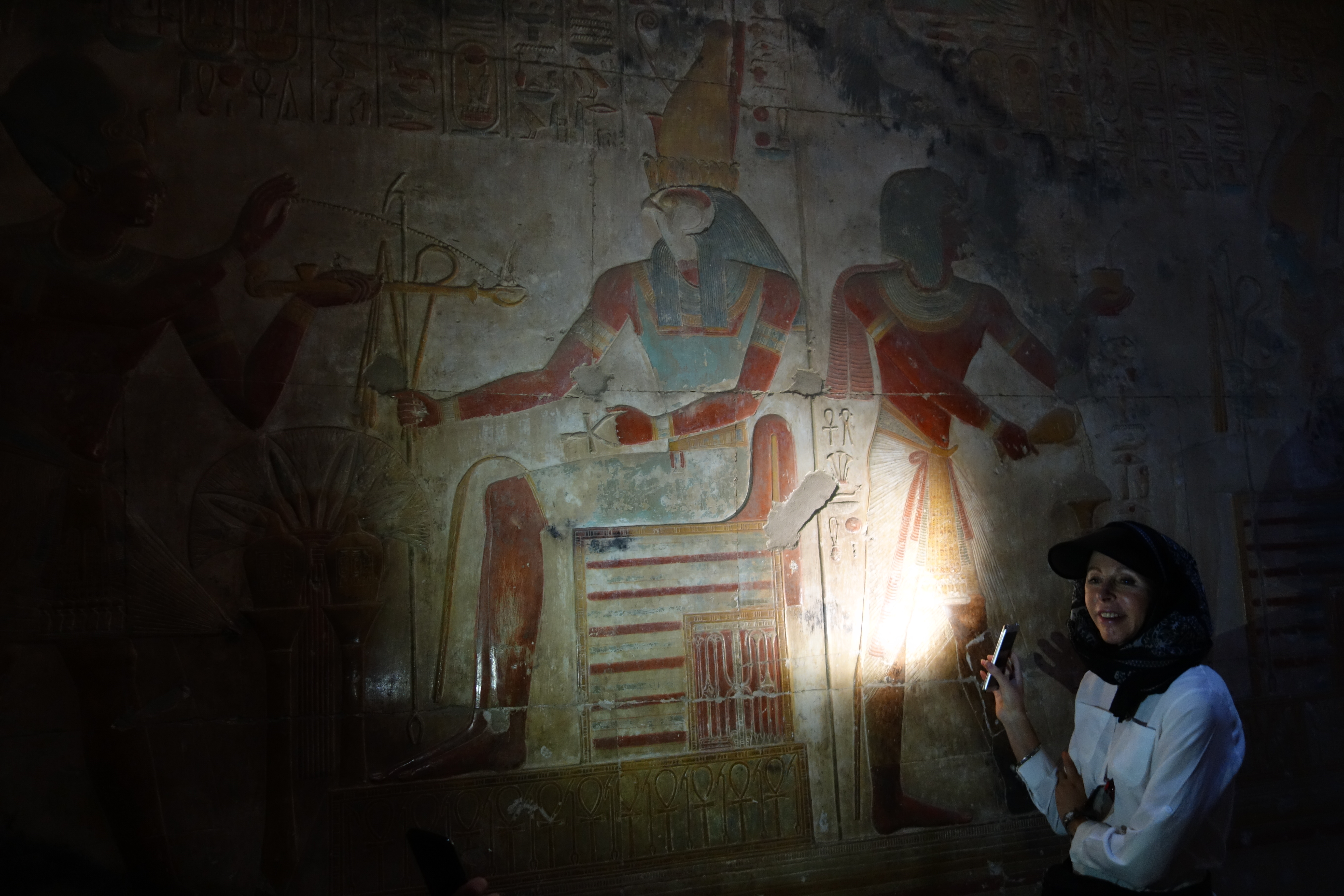 This was one of the most beautiful and atmospheric of all the Temples we were to see. Shafts of brilliant light slice through the ceiling, you almost expect to see sparks where they hit the floor and the walls are bathed in a soft glow which brings the artwork to life. The carving and the colours are fabulous and really well preserved after 3,300 years. We loved it.