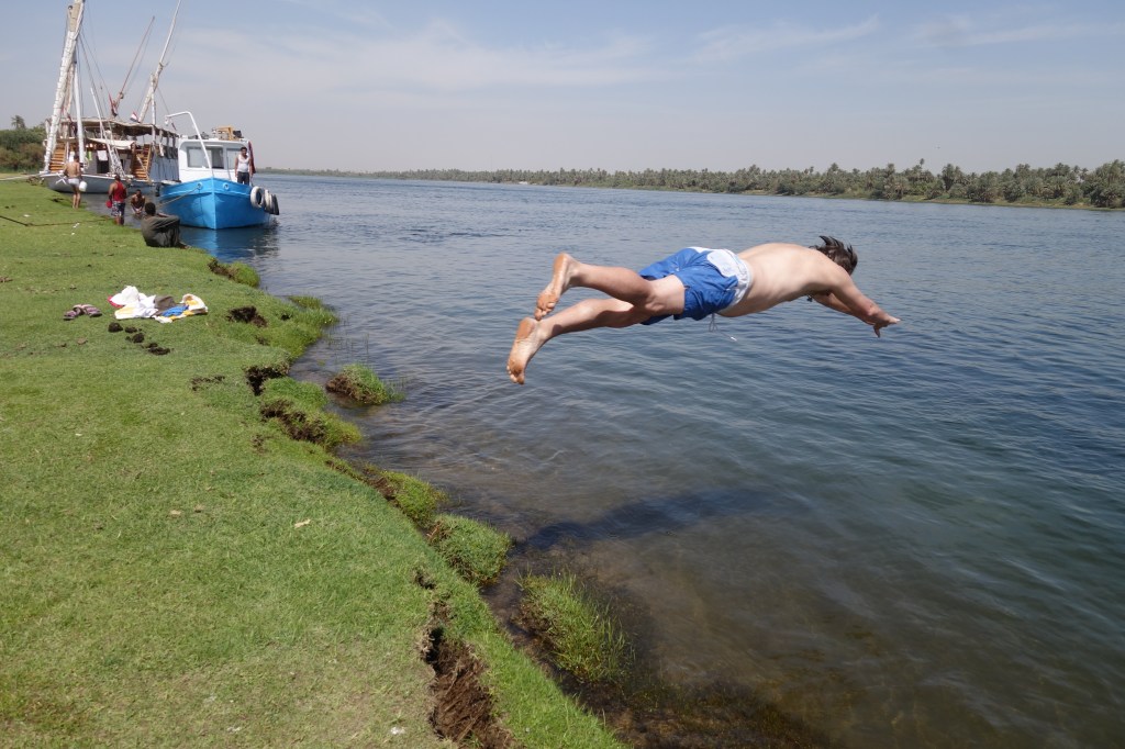 We moor further upstream at a quiet spot, with green pasture and cows, for lunch and a swim. Yes, I have swum in the Nile and must say that despite this being one of the hottest places on earth, the river is bloomin’ bracing. The water is clean, but don’t open your mouth and we are assured that there are no longer any crocodiles, honest. If there were, I’m sure that my Godzilla-like aquabatics would have frightened them off anyway.