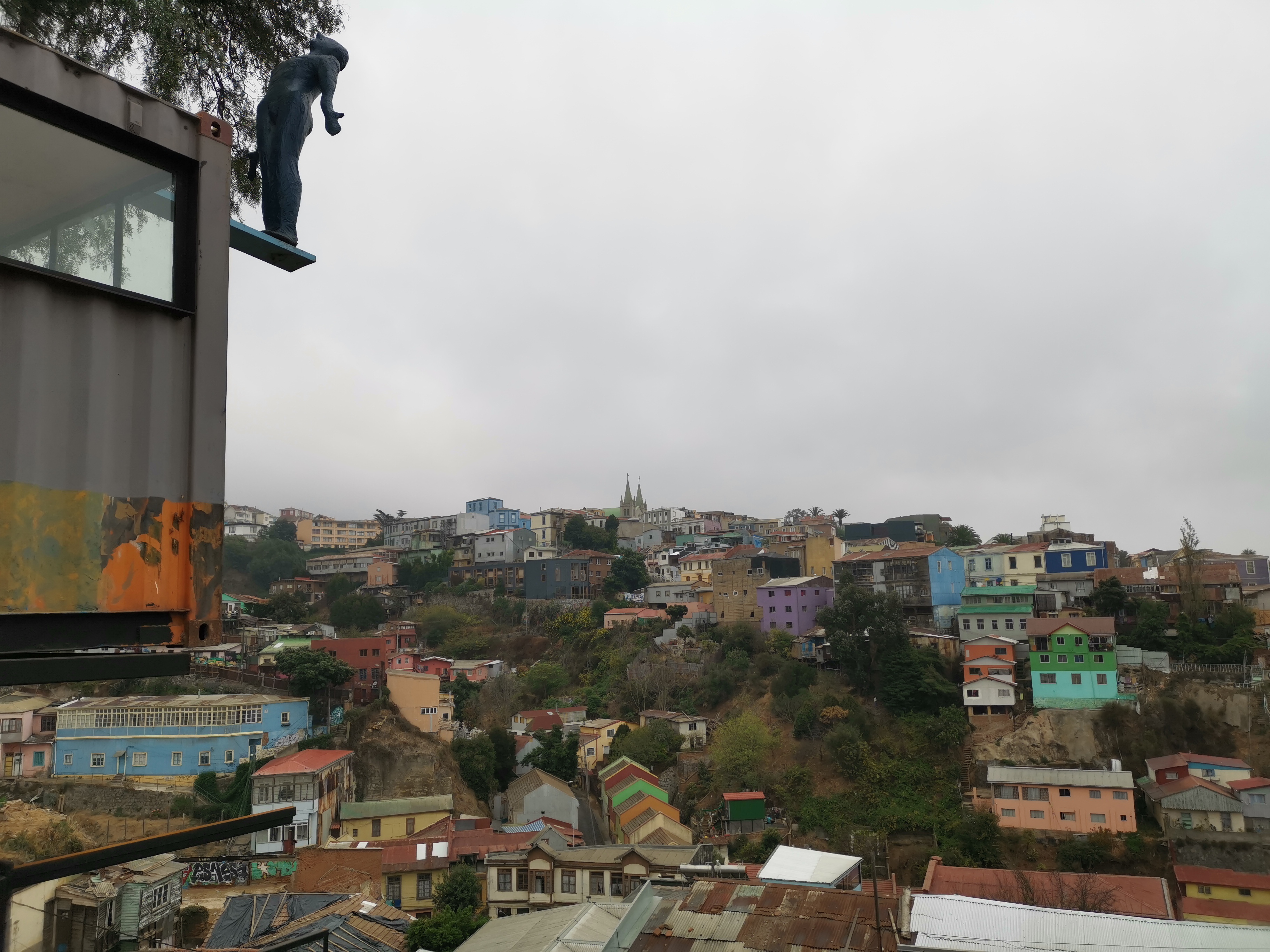 Filippe pours us back into the van and we drive into Valparaiso. Valpo comes with a lot of hype and, just maybe, with the light vibrating off the multi-coloured houses it might live up to it, but I’m not convinced. In the foggy Autumn, the houses look like corrugated tin shacks, which is what they are, glued precariously onto the hills overlooking the bay. A bit like Cezanne has painted a Calcutta shanty town above Glasgow docks.