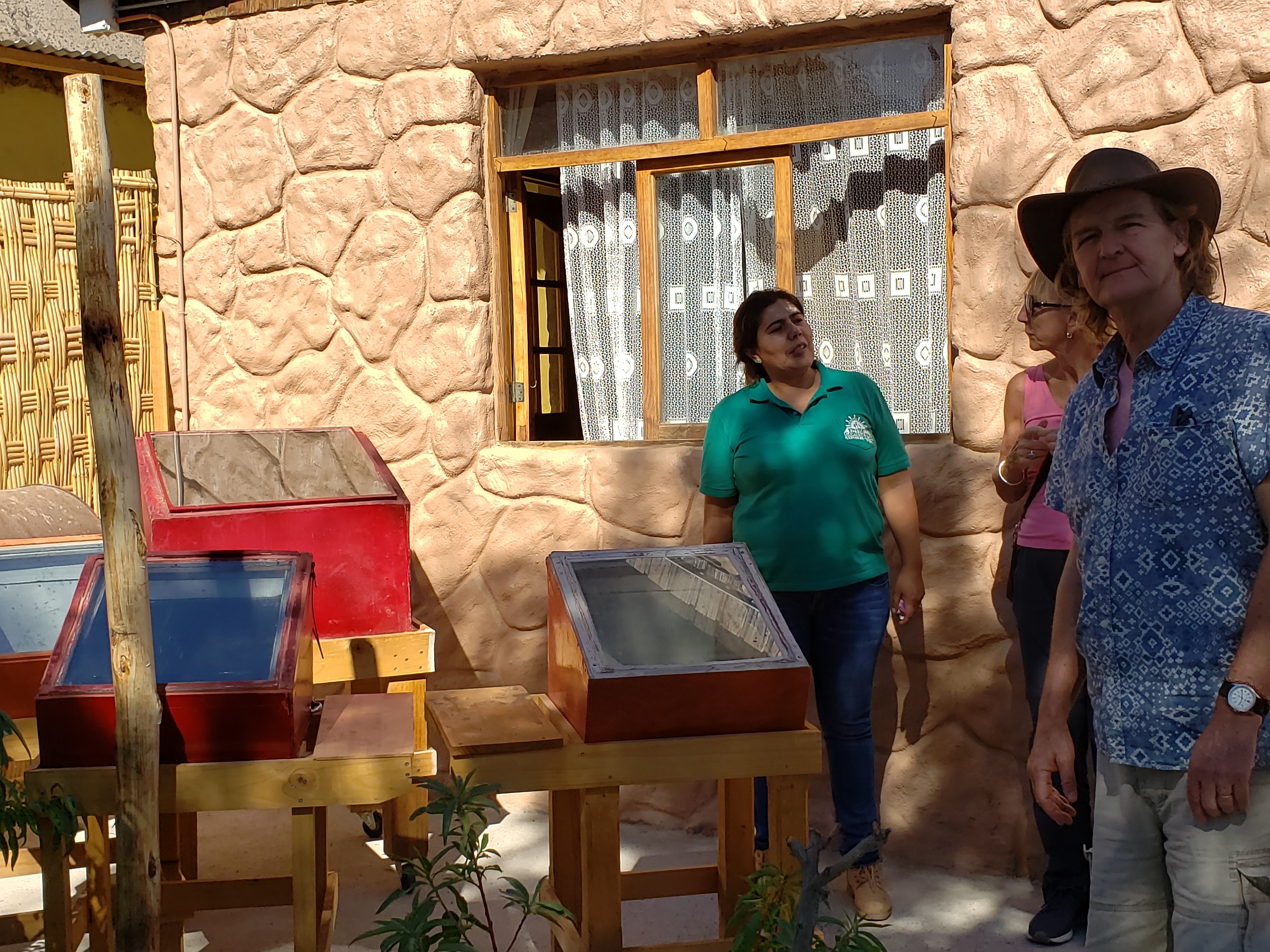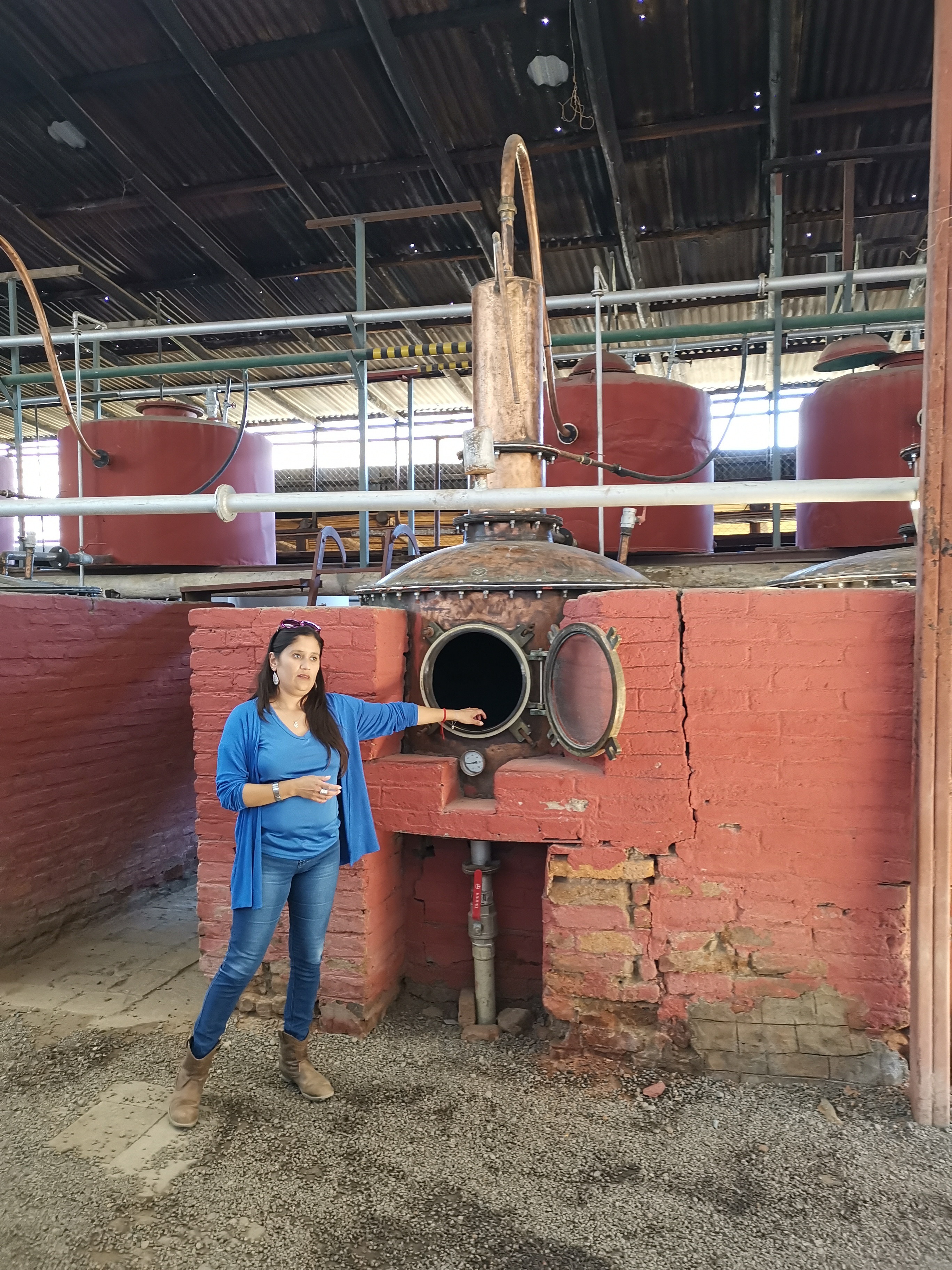 Lunch beckons and our orders have been forwarded to the local Restaurant Solar several hours before, that’s because no electricity is used, everything is cooked in a big silvered box on wheels that they push around the yard to stop it falling in the shade. Slow cooked is delicious but, typically heavy on the carbohydrates. Thick pea soup is guaranteed to cause me to generate copious amounts of alternative bio-fuels, useful for cooking snacks after the sun goes down. The casserole of goat is delicious but perhaps a bit heavy on a day when the temp is hitting 33degC. We stagger back to the van for the 5 minute ride to the Aba Pisco Distillery, a very old and pretty Family run establishment.