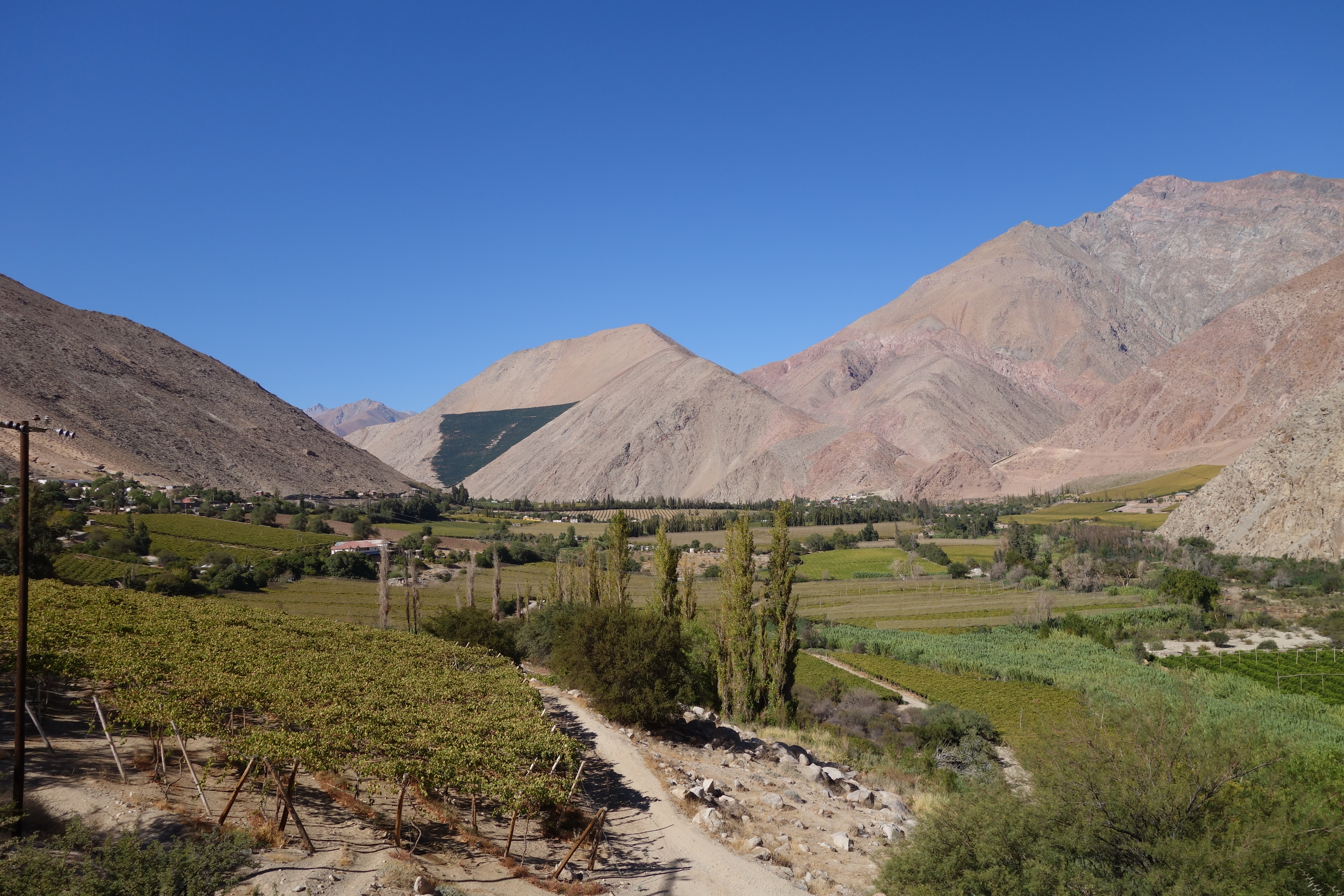 Our guide, Kathya, arrives and we head up the Elqui Valley, the early morning fog follows us and, at first, this is disappointing, but once we are out of the burbs and steadily climbing, the sun comes out and burns it off. The Elqui Valley is a narrow ribbon of green flanked by high red/brown mountains, very little grass grows above the irrigated fields except for hard green cactussussuses. The sky is an incredible blue, the light is strong but not hurtful. The vines are already tinged with yellow at the edges, but the Muscat grape leaves are a deep old red blood as the ribbon of cultivation winds ever upwards, the “Skinny Boy” River splashing colours through the tawny hills.