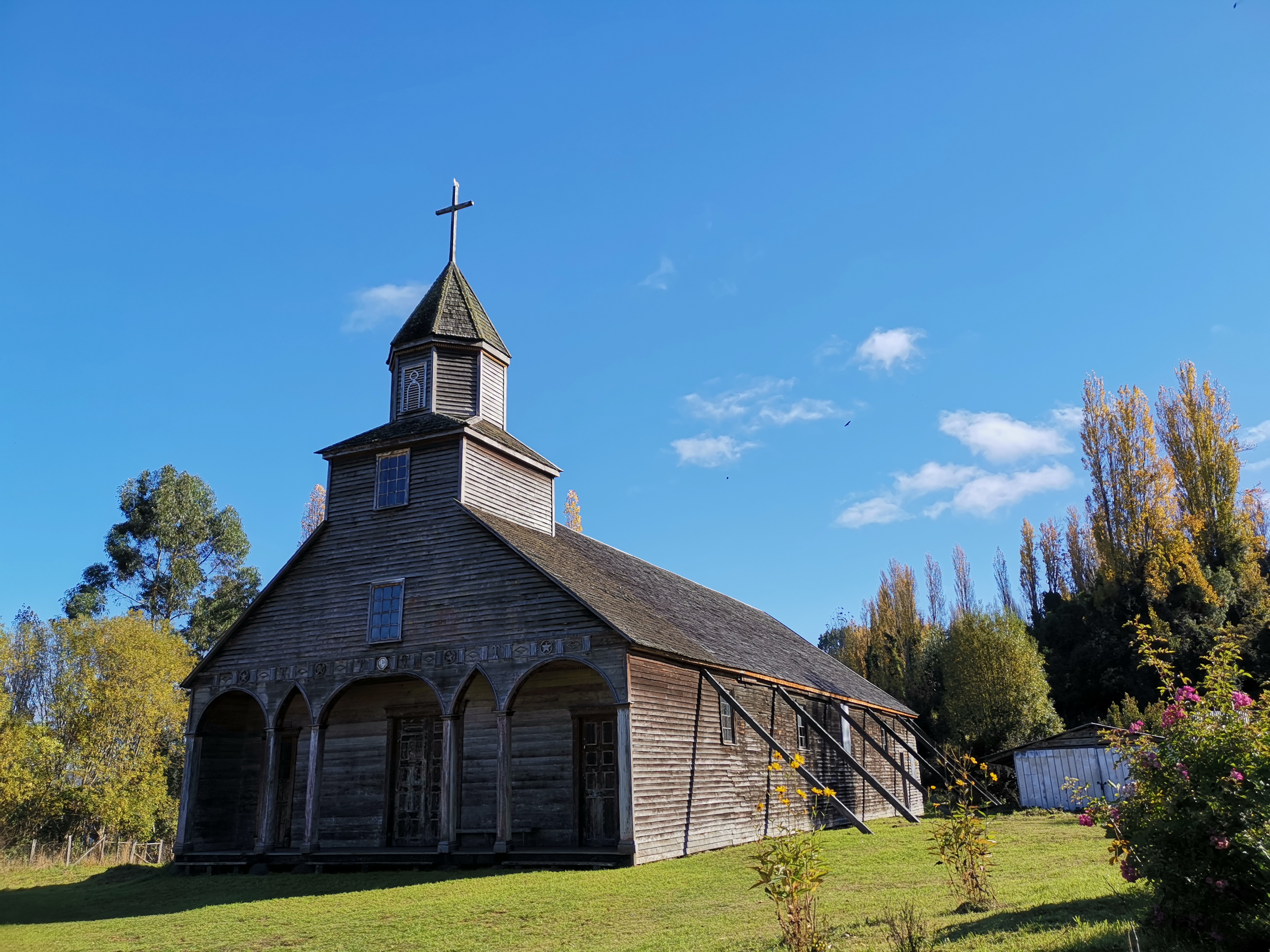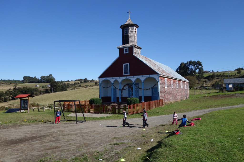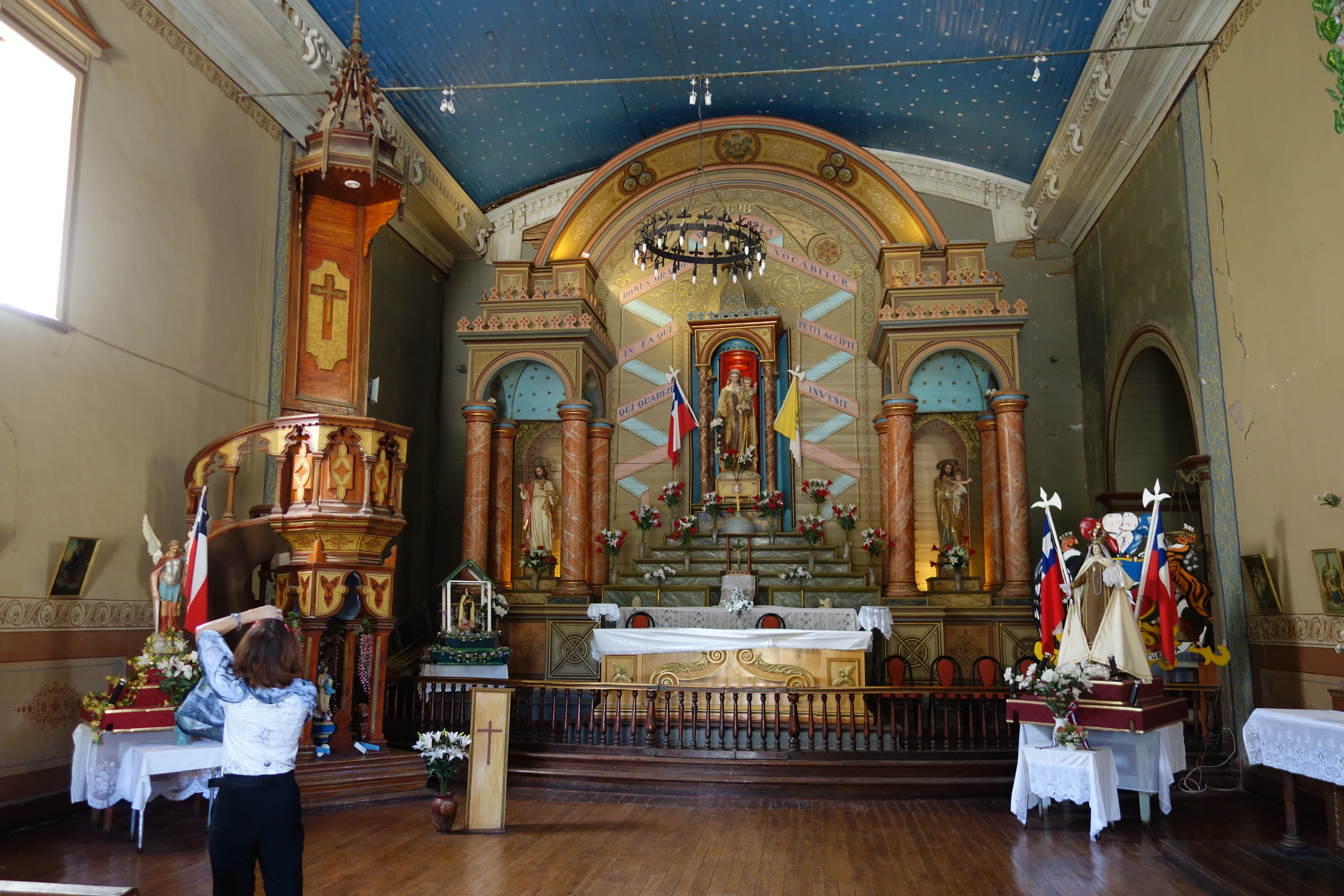 Chiloe is known for its large number of wooden churches, many of which have been recognised as World Heritage. Chonchi has a big one, but it is seriously into the blood and pain side of redemption and we scurry onto the ferry to Lemuy Island which has some of the nicer ones. We stop at the first one in Ichuac and it’s very pretty, but it’s closed, surprise, surprise, and the lady in the village who keeps the key has gone on the ferry to Chiloe Island for the day, of course. Aldachildo is next and Juan is mates with the key guy so we score an entry.