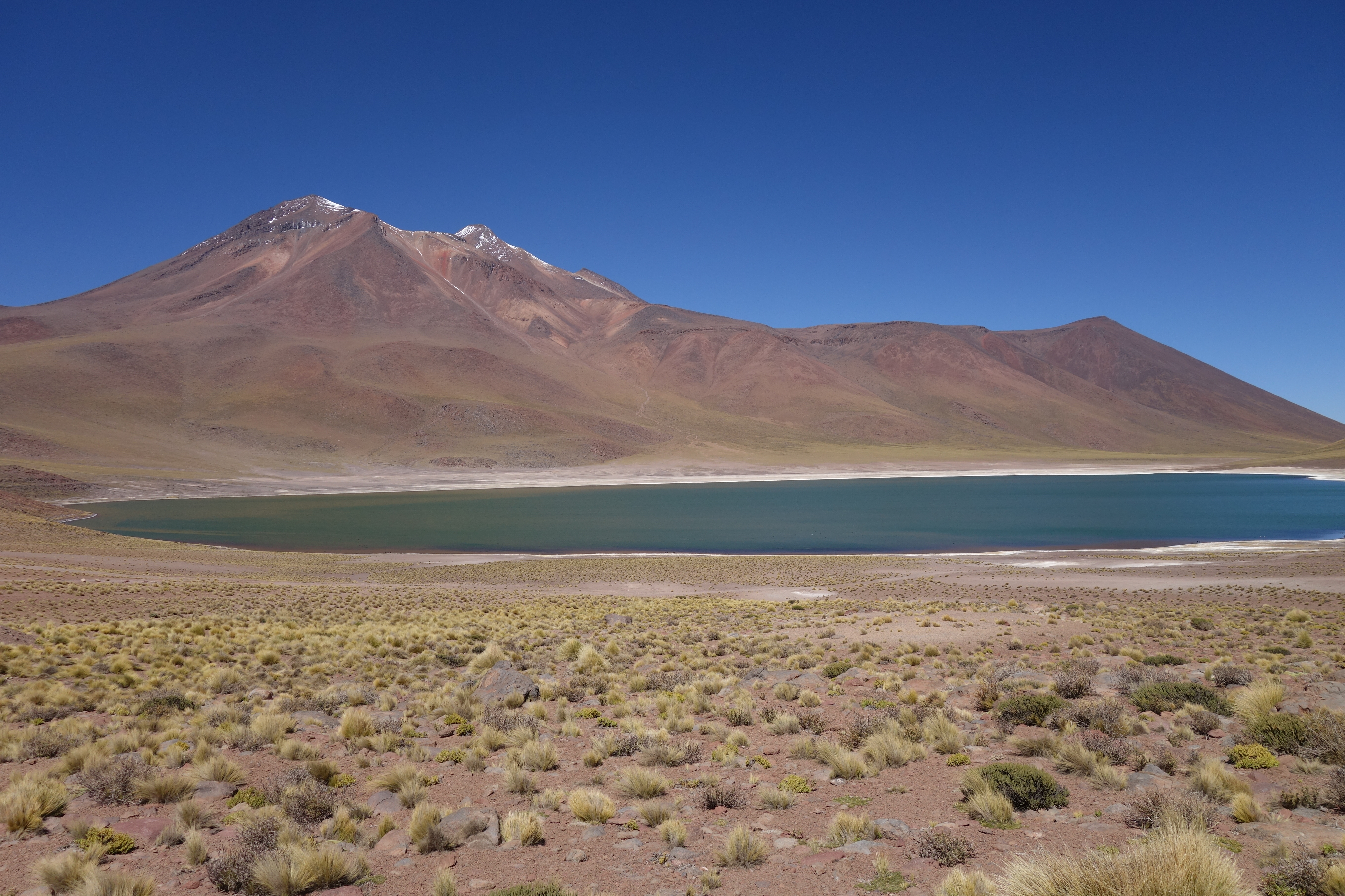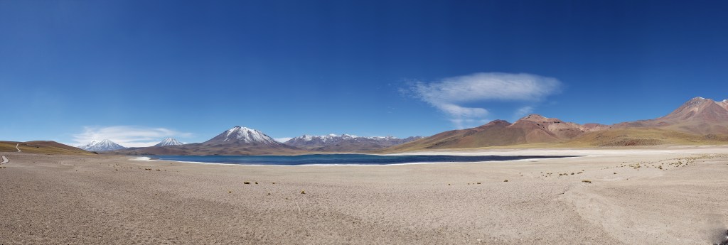On the other side of the ridge, two perfectly blue lagoons nestle below snow dusted dormant volcanoes, their blue greens illustrate that at 4,200M these are still uplifted salty seabed. There are a few ducks scattered across the surface, but not much else can survive except for prehistoric salt water organisms.