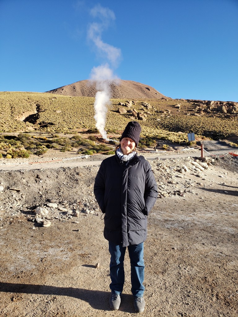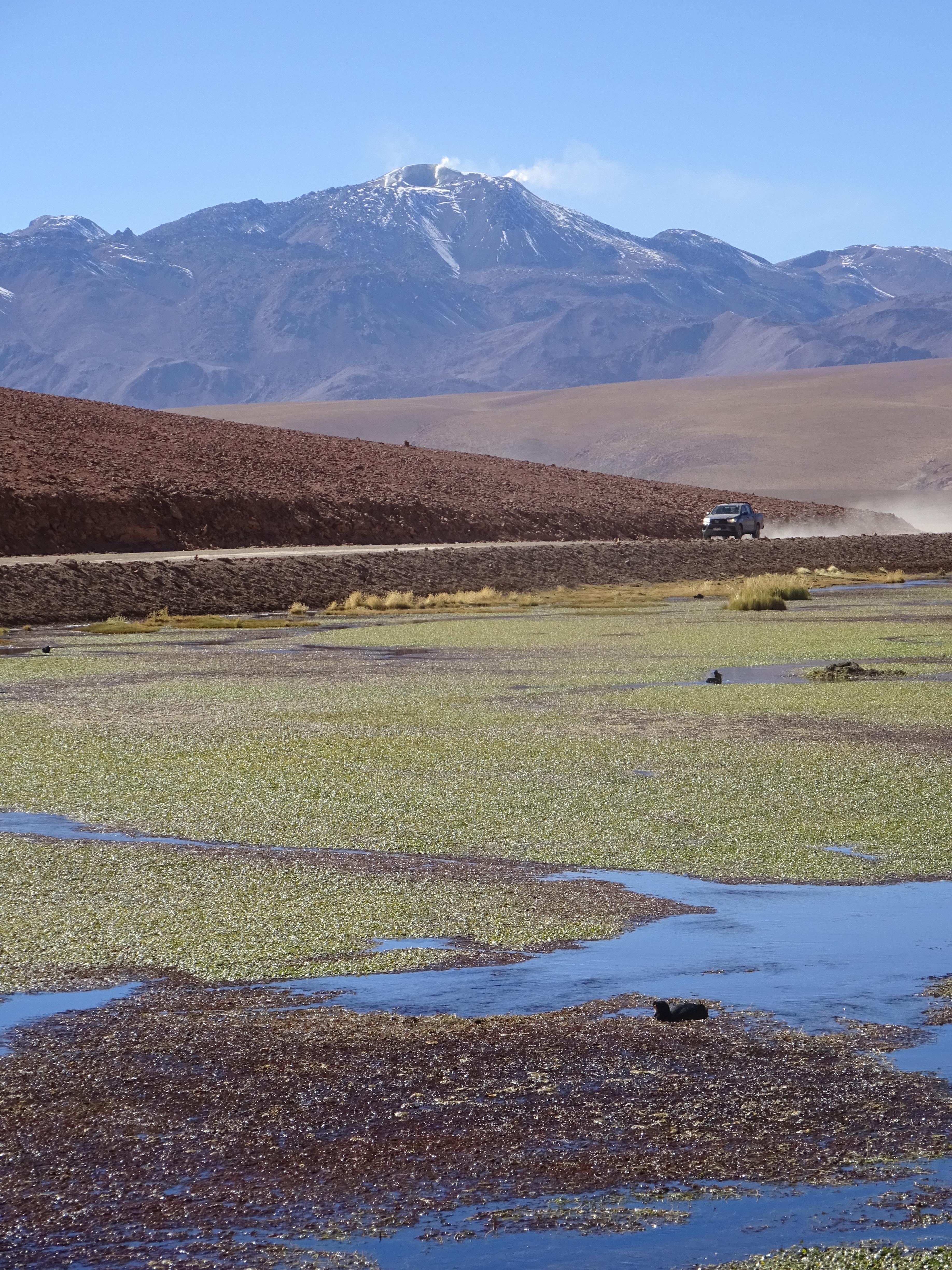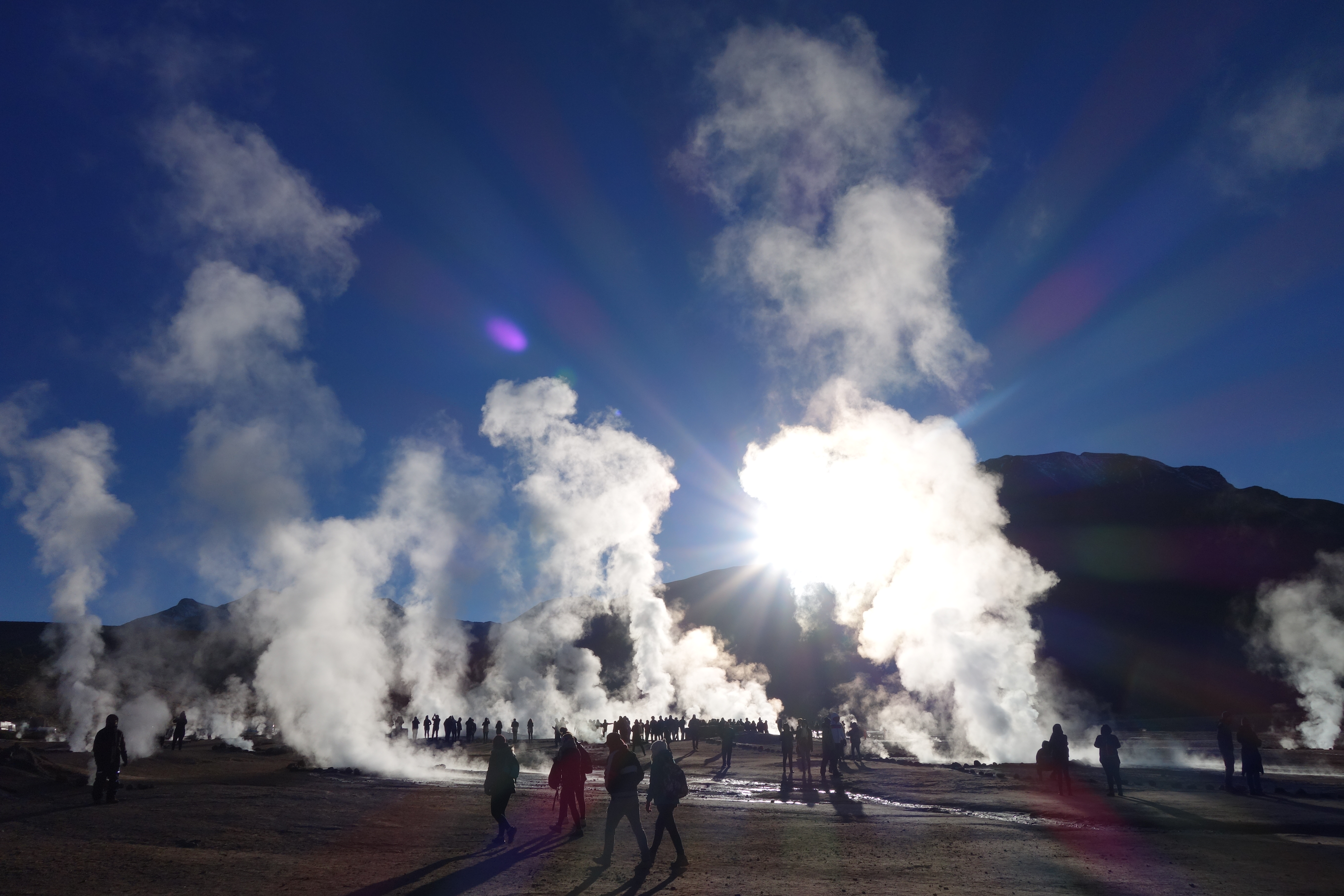 The moon drops and the sky eventually lightens as we waken and pull into a coral containing hundreds of cattle vans, with the occasional buffalo bus and a smattering of sheep cars. The queue for the loo is stamping and snorting, it’s minus 7degC and steam rises from the huddled herd. Boots, quilted jackets and woolly hats abound, but there are the occasional sandal and sweatshirt who look due for an early cull. Eventually Sina has the tickets and we rumble into the valley of Taito Geysers.