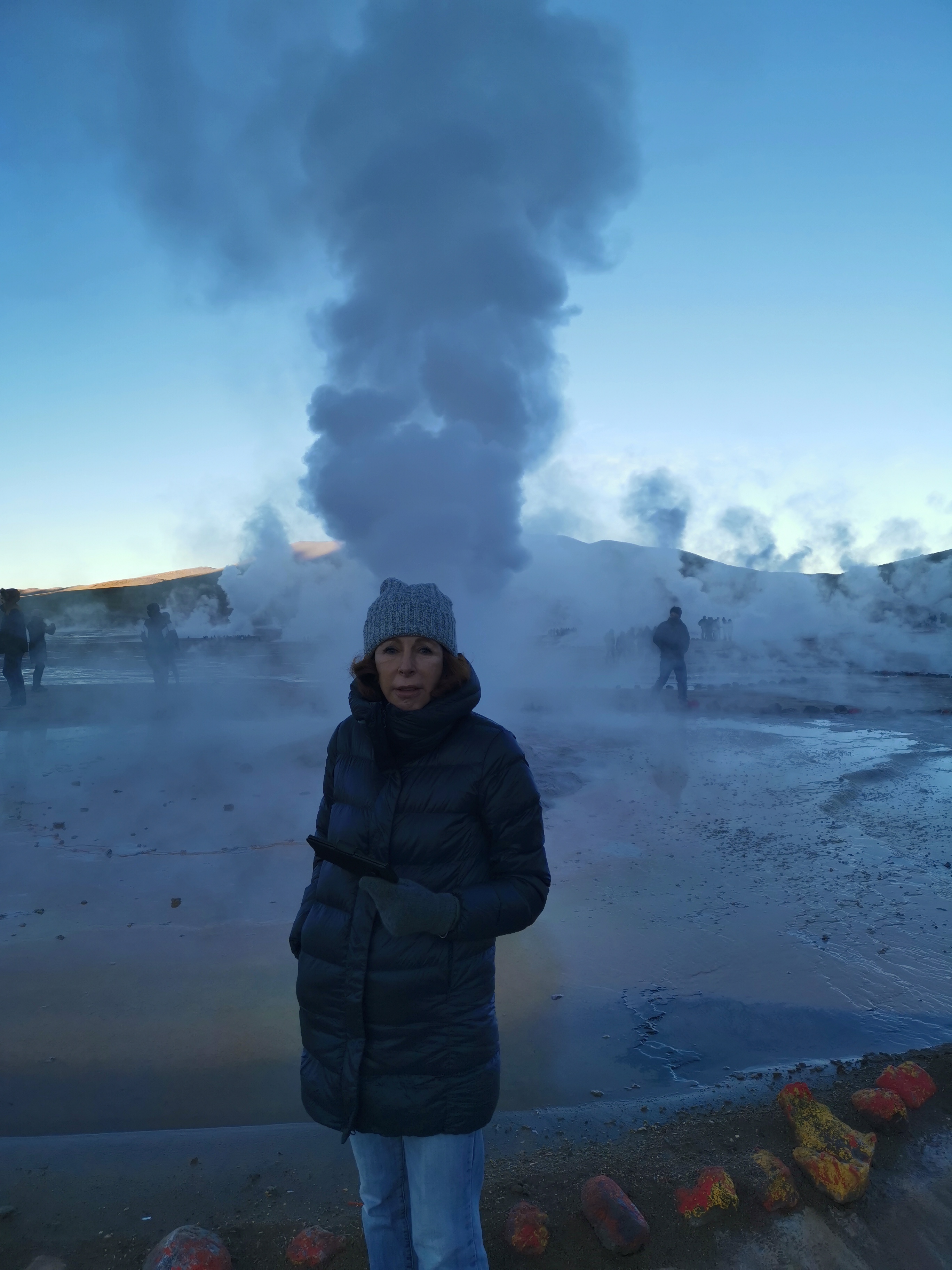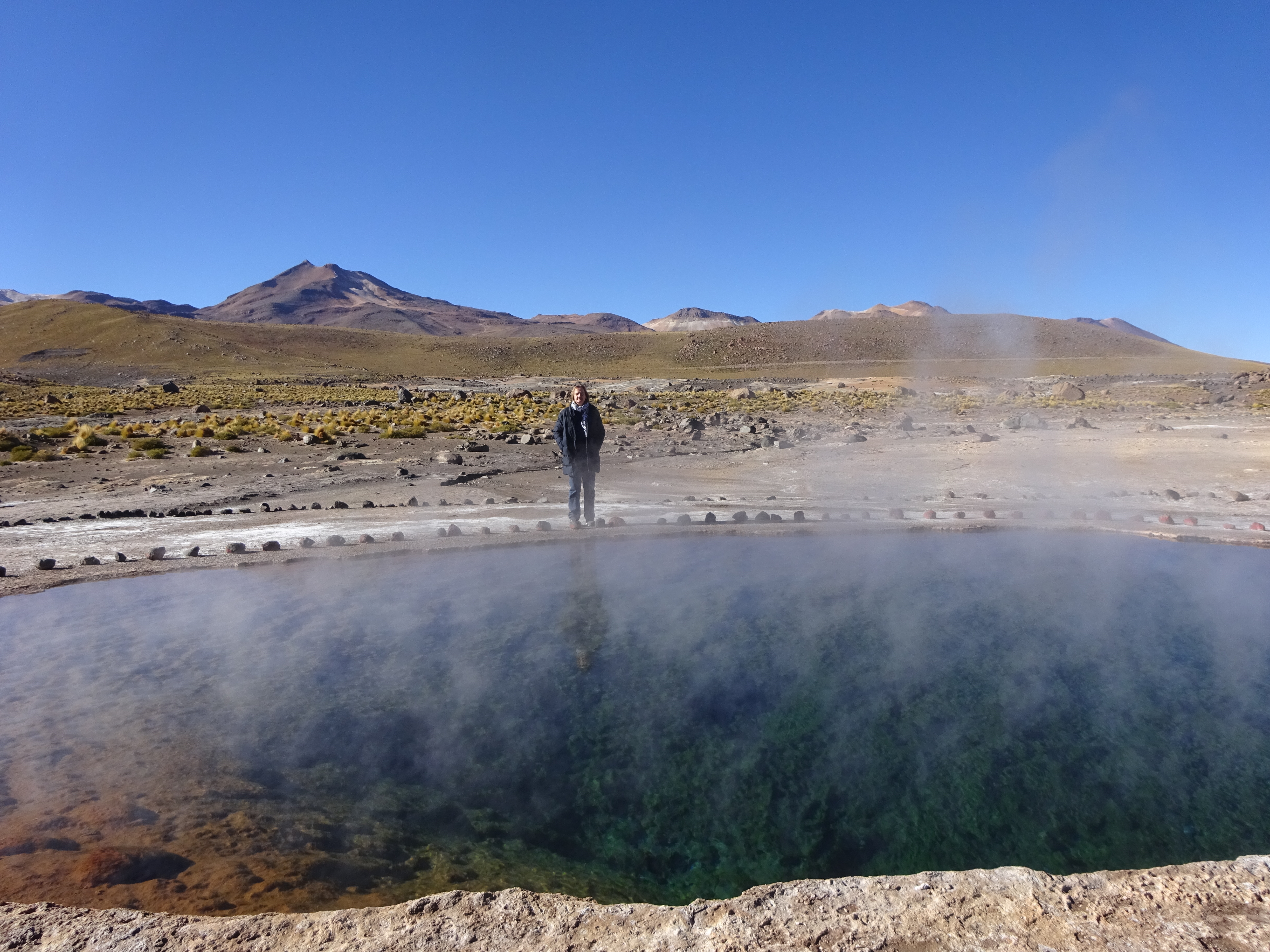 Anyway it’s pretty impressive and, as the sun comes over the mountain from Bolivia, the colours, sounds and the blue blue sky are gorgeous. So is Jose who, by now, has whipped up a breakfast of scrambled eggs, toast, cheese, ham, coffee and hot chocolate from the back of the van. We eat and become human once more. Standing round a deep crystal pool of gently steaming water, a passing guide warns us not to get too close as it is dangerous. Not as dangerous as the pool they call “The Assassin” , that one claimed three lives last year. One woman tripped and tumbled right in, her husband reached in to pull her out. She suffered 78% burns and died in hospital 3 days later. He lost his arm. Nobody asked him if it was a good trade. We ask Sina about this. “Oh yes, it happens all the time, but we don’t want to scare people so early in the morning. Sometimes, groups come with 10 people and leave with 9, nobody knows what happened. Seriously, it’s a fact.” We look at the crowds of backpackers balancing on small, slippery rocks, trying to get the best selfie and think; “ OK. Nature has its own way of thinning the herd….. And that’s a good thing.