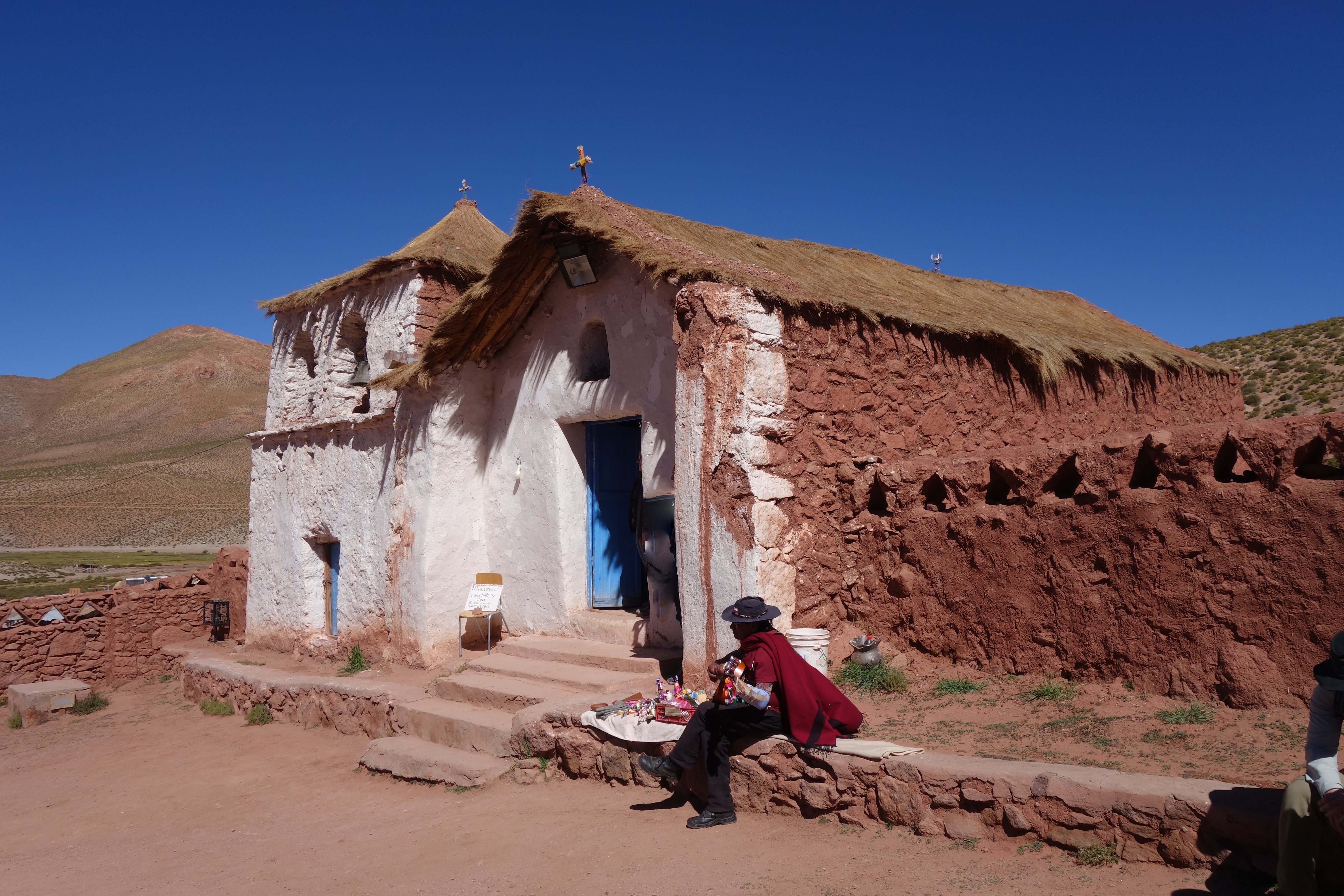 We head back down the mountain and are grateful, now that we can see, for Jose’s driving abilities. We stop at lagoons to watch Giant Coots building their nests and Andean Geese arguing with them. One volcano amongst many is quietly steaming reminding us that they are not all asleep. Vicuna graze amongst a myriad pools that reflect the pure blue sky. A local village provides an expensive banio stop as the herd coalesces once again to photograph the rustic church, but we do find a lovely old lady knitting alpaca socks and buy a pair for Dori. We like to do what we can for the Chinese economy. We eventually manage to coax Cochetina back into the van after her 50th selfie and our last stop overlooks a beautiful deep canyon where we can hear water but can’t see it for the carpet of pampas and giant cactus and arrive back in town at 35degC by 11.30.