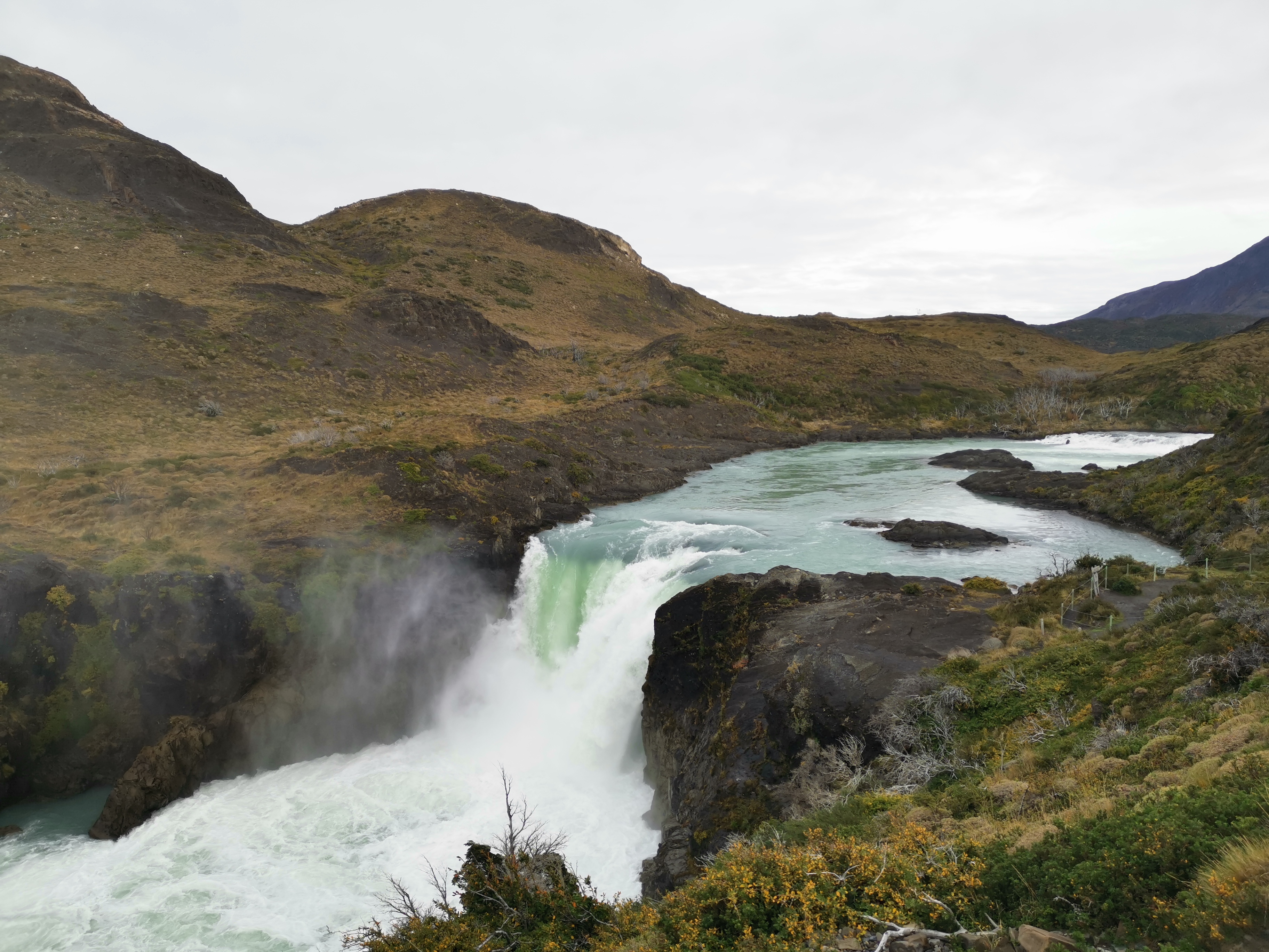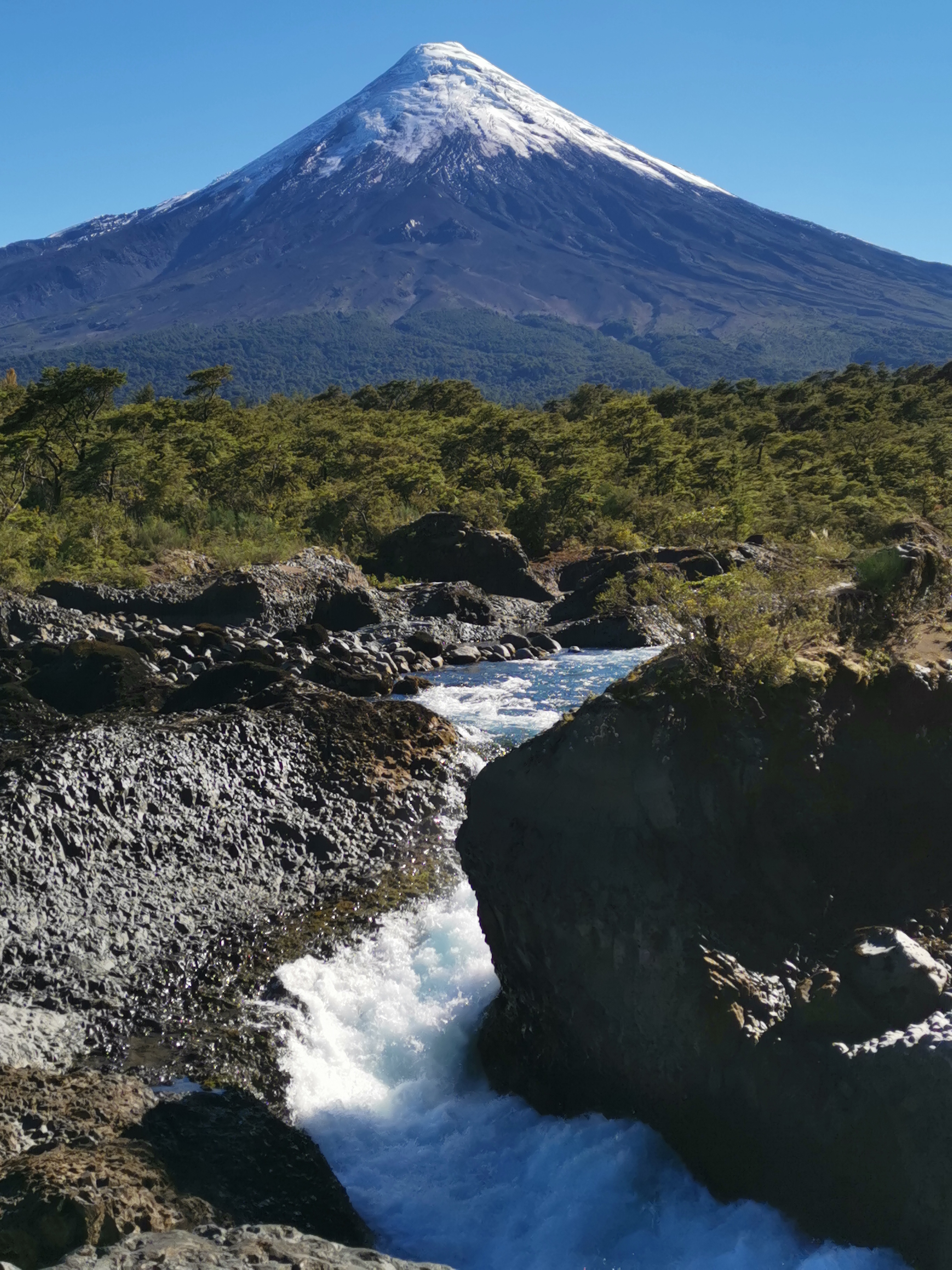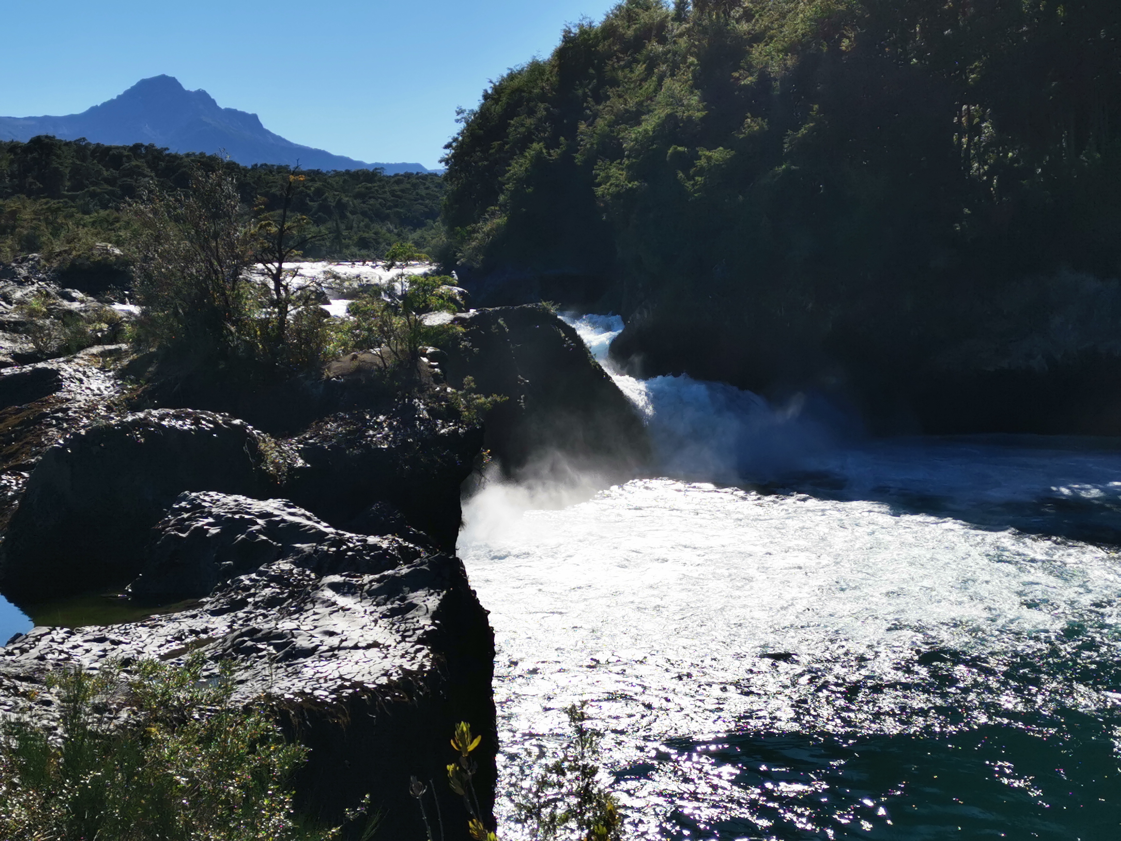 We stop at Petrohue Falls where the upper alpine lake crashes down the valley to the lake that washes the pebbles by our hotel. The swirling river water is crystal and huge salmon wait patiently for a mate before they can spawn and die.