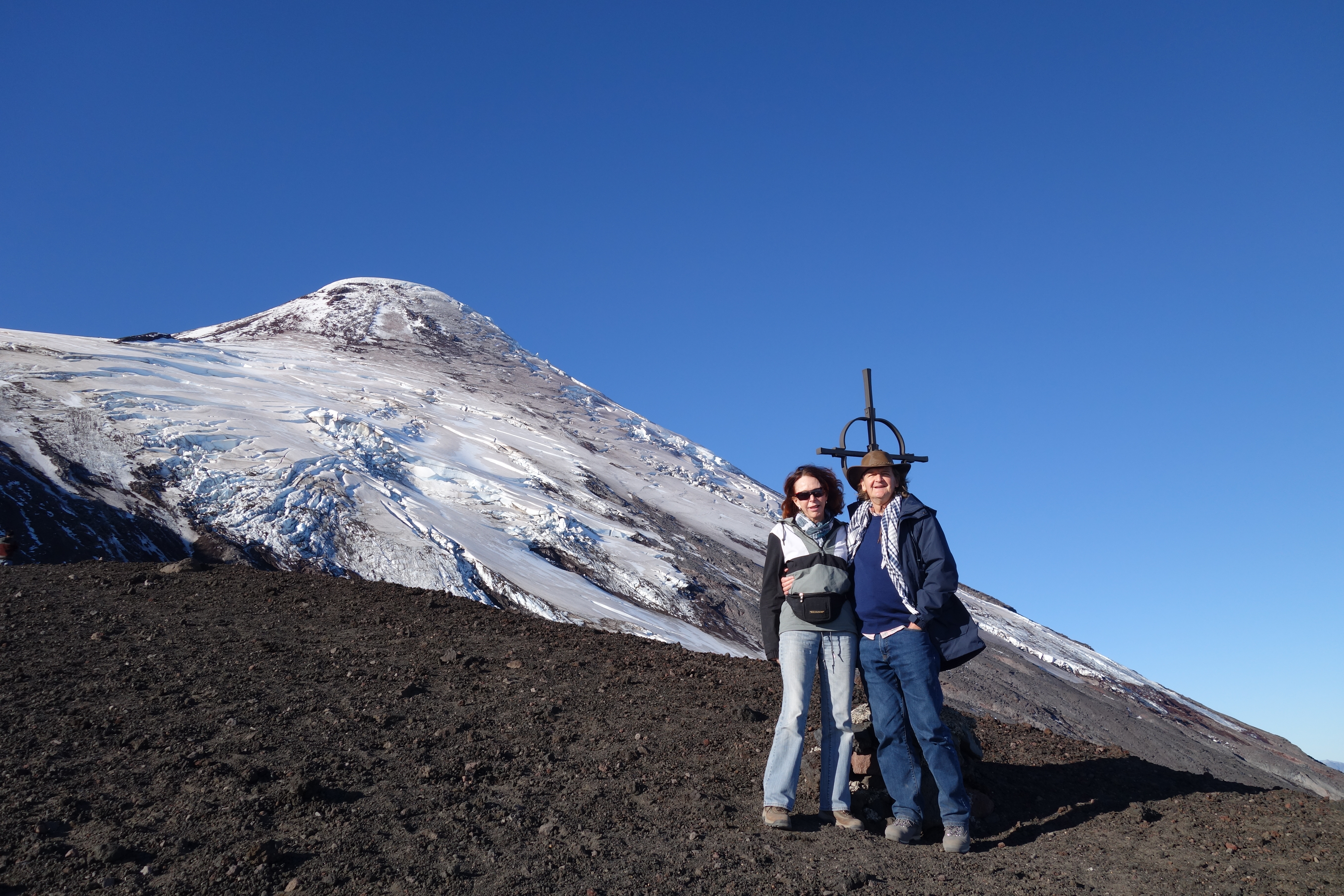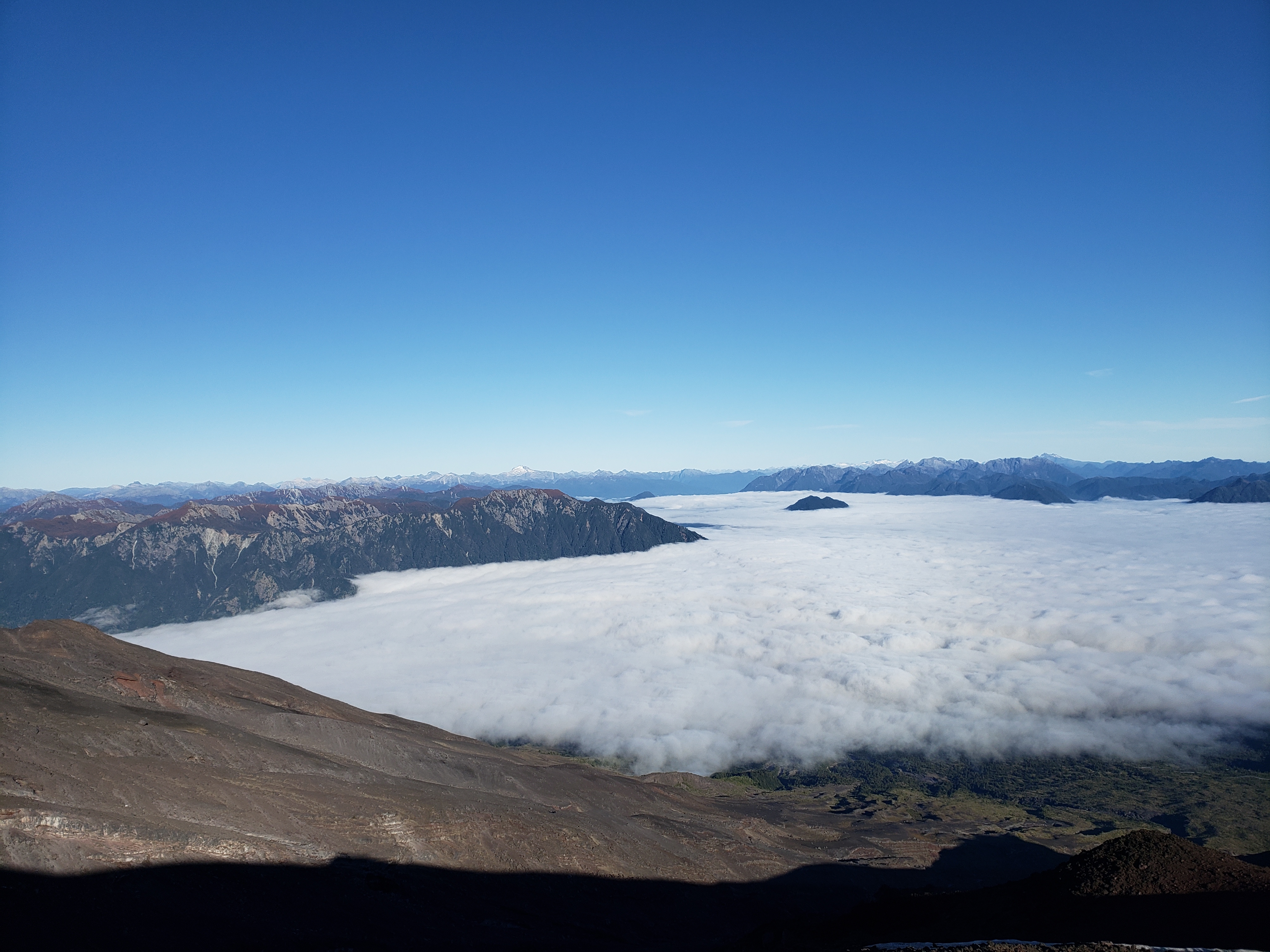 We roll on to the Osorno Volcano which has featured in many, many photos today. The road winds ever upwards and, so do we, the cloud begins to creep back in until, by the time we reach the ski station, we are looking out over a vast blanket of white sea that butts up against the Andes in the East and disappears over the Western horizon. We jump the chairlift which climbs up and above the snowline, even so, it’s surprisingly mild and the sun is almost harsh. The sky is so pure that I just gaze around with a stupid grin on my face. Naturally, Dori has to get some heart rate in and, despite the fact that I am still enjoying the effects of a Pisco lunch, I have to chase her up the last few hundred metres. Victor is game and tags along telling stories of climbers who died on the mountain and helicopters that crashed trying to bring their bodies down. It’s not possible to get to the actual summit without all the proper gear and about three months preparation but, even so, I’m feeling on top of the World. The sea of cloud with the Andes poking through is incredible.