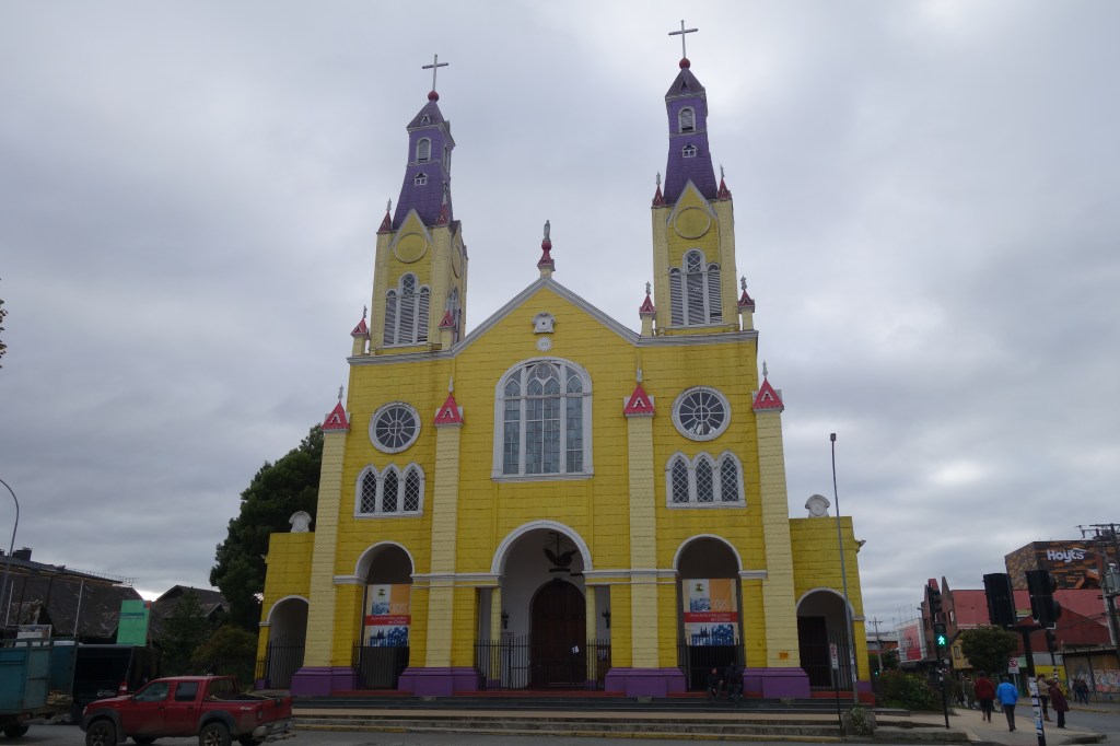 We reach the main town of Castro and stop to look at the Cathedral, this has to be the ugliest Church in Christendom. It looks like a bad version of Cinderella’s Castle, covered in corrugated iron and painted puke yellow, bilious lilac and obscene orange. It is dramatically vile. Fortunately it is closed, surprise, surprise, and we run away, frightened to look back in case I get the heaves.