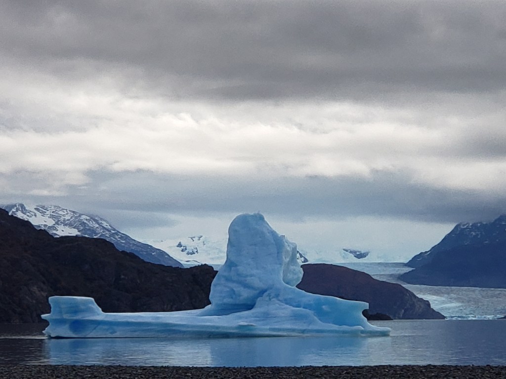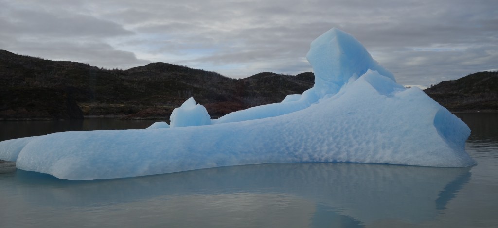 Actually, during all this verbiage, I manage to down a large hot coffee and my packed lunch, so that when the prison doors open, I am the first on deck. The wind hits me like a brick wall, made of ice. Okay – An ice wall. This is seriously cold. People spill out of the cabin, round the corner, stare transfixed for a split second and then fall back inside for 3 more layers and a face mask. As we head up the lake, the Grey Glacier comes into view. 2 enormous fields of blue ice, split by a huge outcrop of black granite. It is phenomenal.