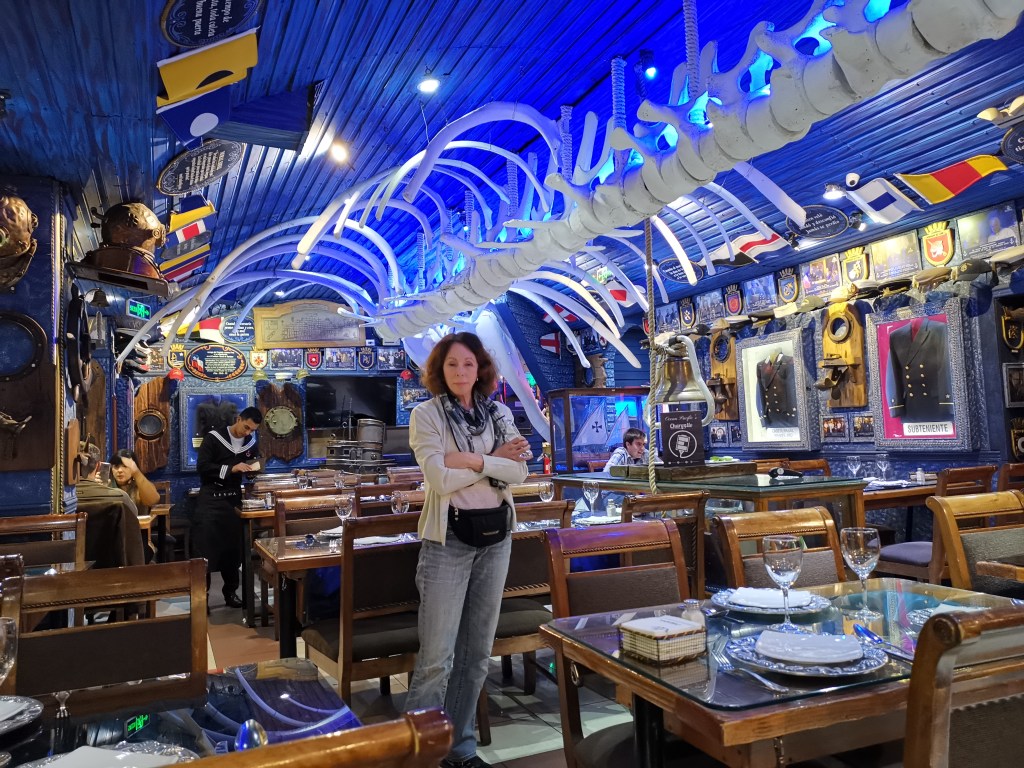 Eventually, we end up in a restaurant that seems to take its theme from the Beatles Yellow Submarine, except that everything is blue, even the lighting. The waiters all look like Popeye and there is a giant whale skeleton suspended from the ceiling and seafaring knicknacks everywhere. I expect to see Pinocchio at any moment. I’m tempted to ask for steak, but chicken out and have a surprisingly good seafood tagliatelle. Don’t judge a book by its extremely gaudy cover.