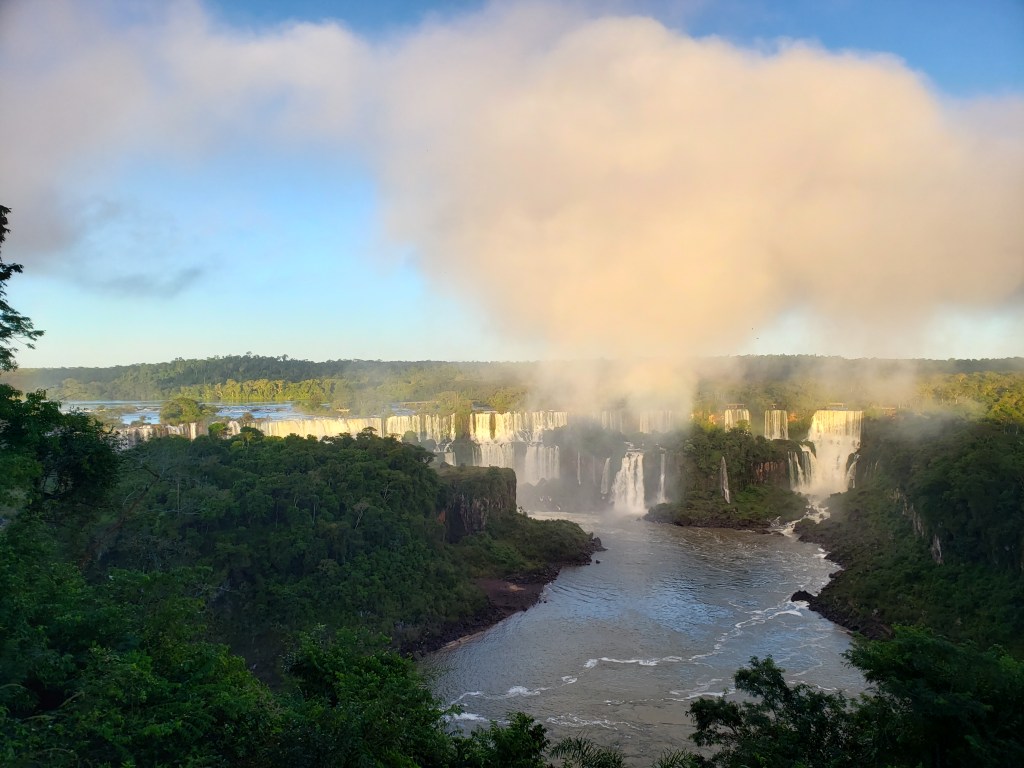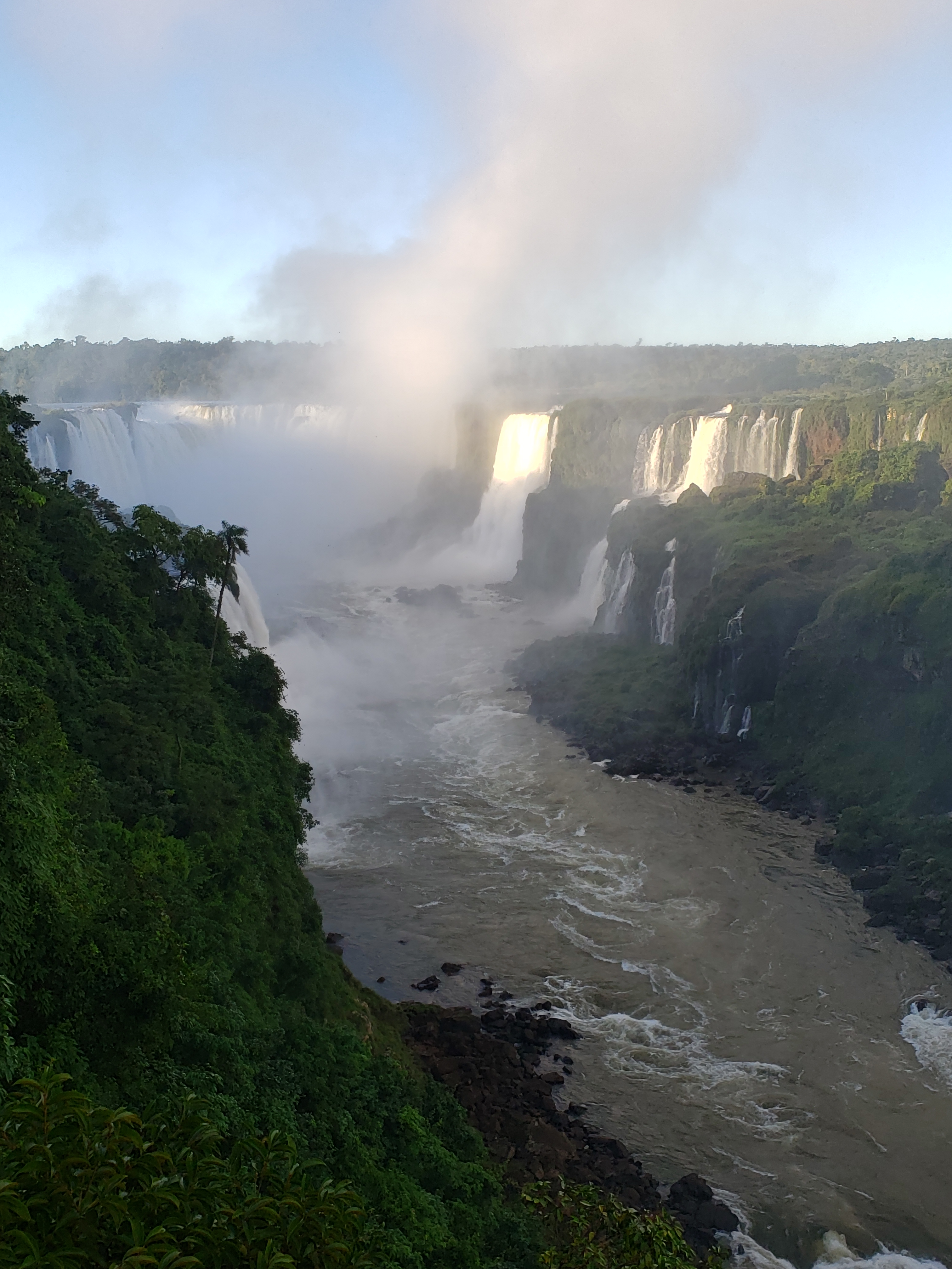 Out the front door while the sun is still yawning. In the half light we can now see as well as hear the falls, from the front doorstep of the hotel. The Belmond is set quite high and down the slope, over the road, through the trees, a vast wall of water is crashing ever forwards. We scamper over the road and are blown away by the scale of the little bit that we can see.