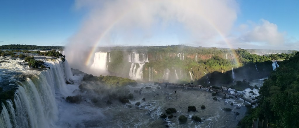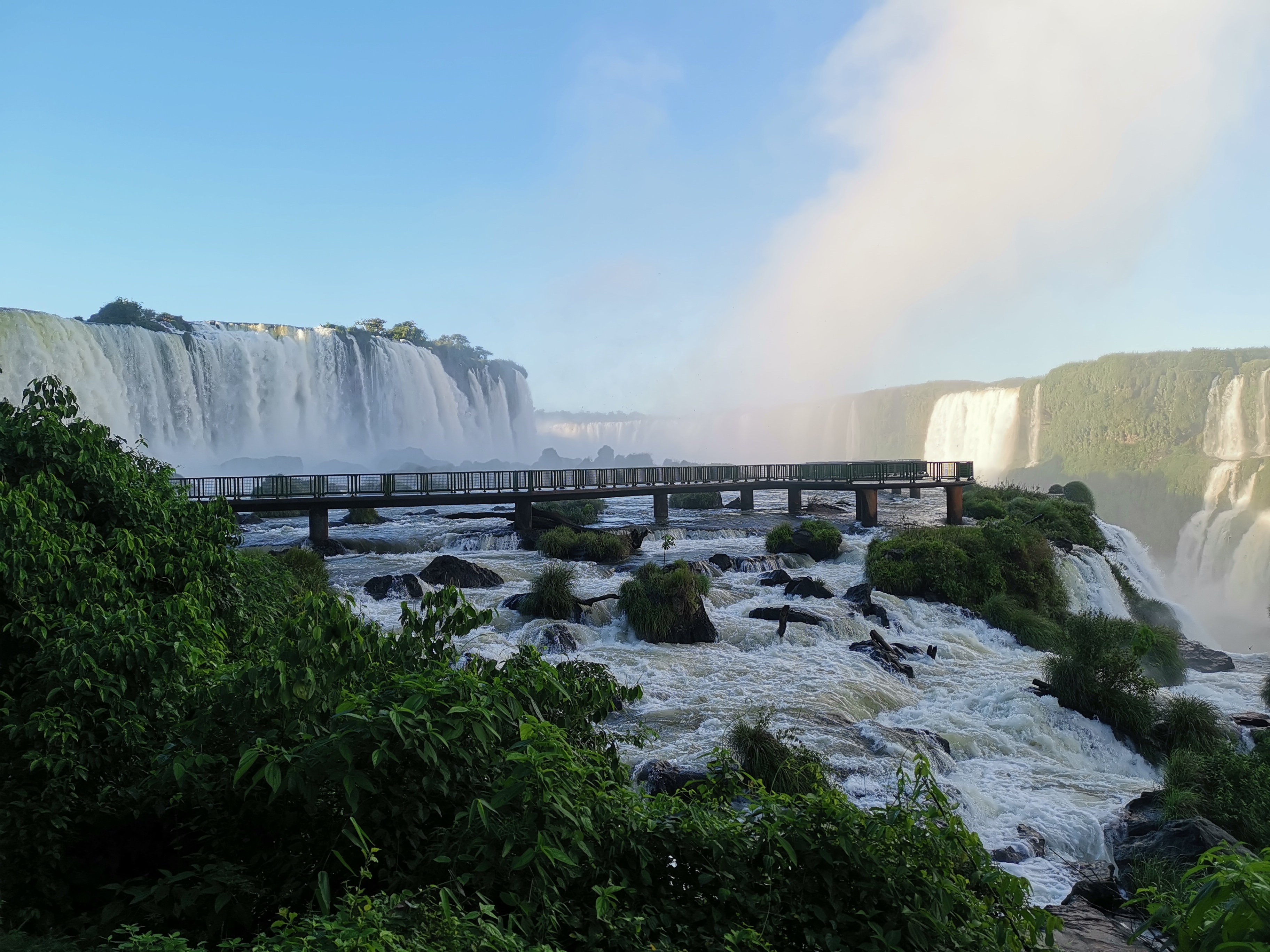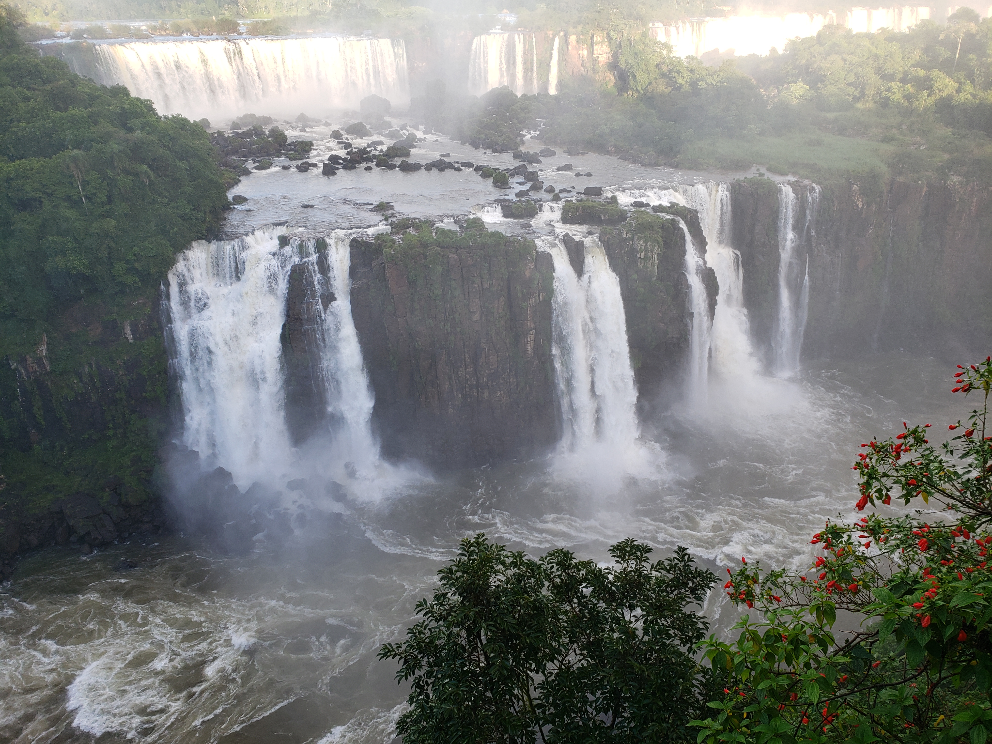 We walk along the trail on the Brasilian side, looking at the rolling thunder falling from the Argentinian side. The trail winds up and down the side of the gorge, offering glimpses as you get closer to the neck, what is called ‘The Devil’s Throat’. At this point, there is a huge step on our side and a walkway zig-zags out over it. An enormous maelstrom of water drops from our left, onto this step, swirls below our feet and tumbles over the dizzying drop to our right.
