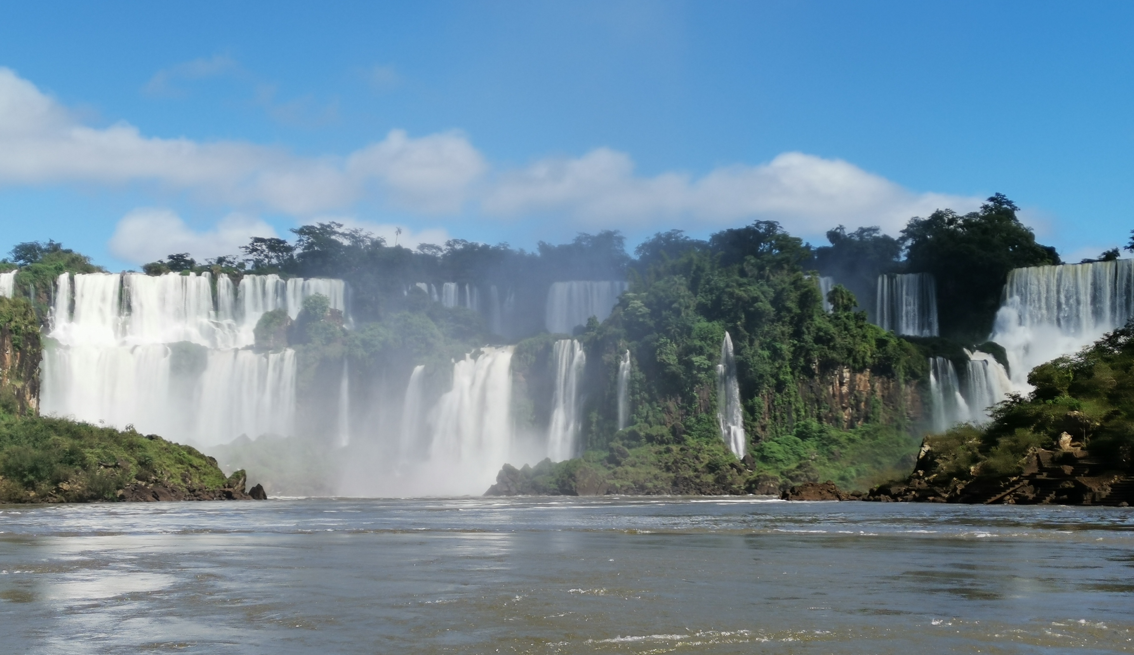 The Iguazu Falls are an enormous squashed horseshoe about 2.7 kilometres long and 82 metres high. In many places they are split into two massive steps and interspersed with wedges of jungle and sheer rock faces. They are incredible in power, beauty, magnitude, sound, colour and touch. They envelope you in water until you almost drown.