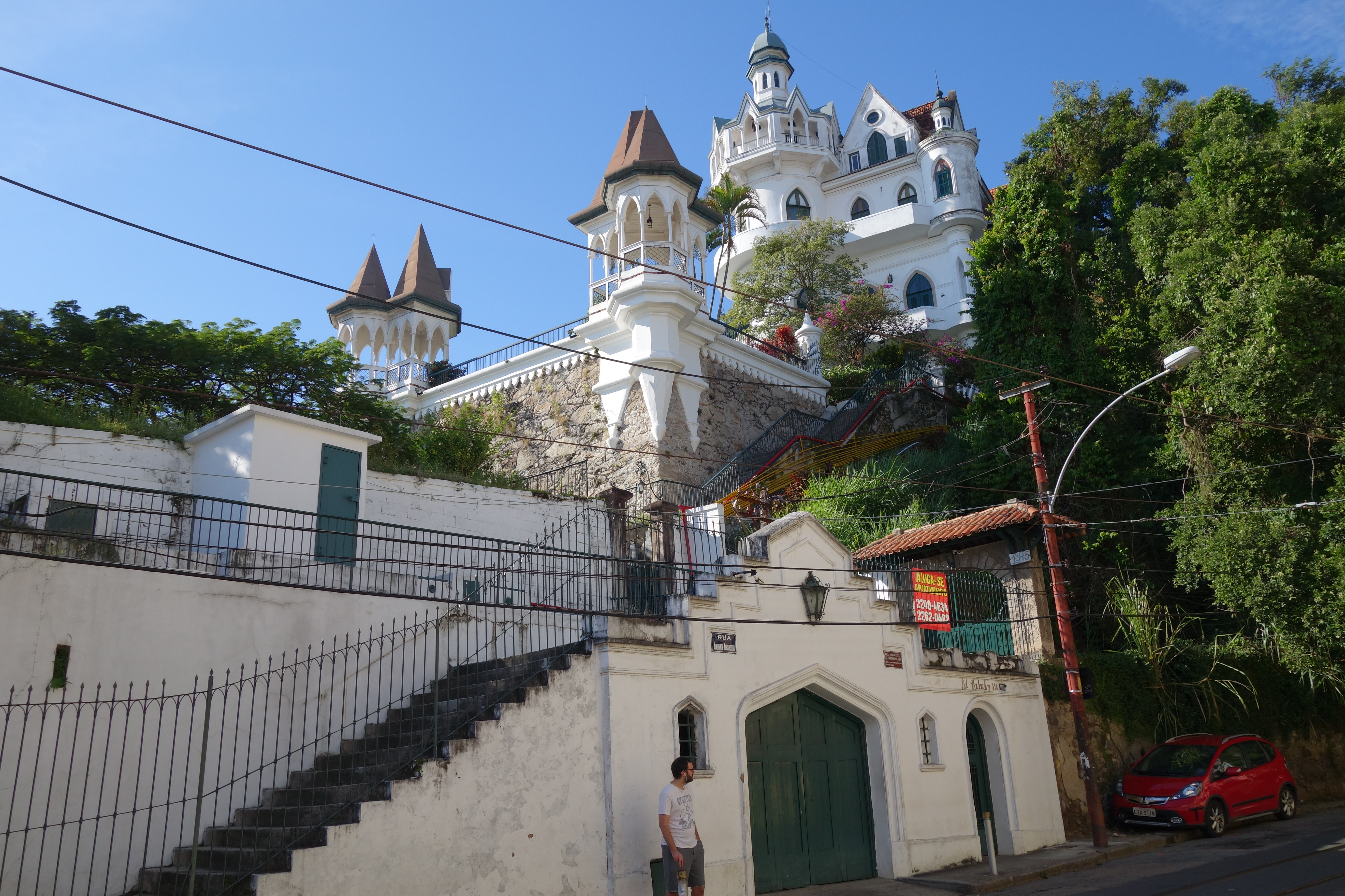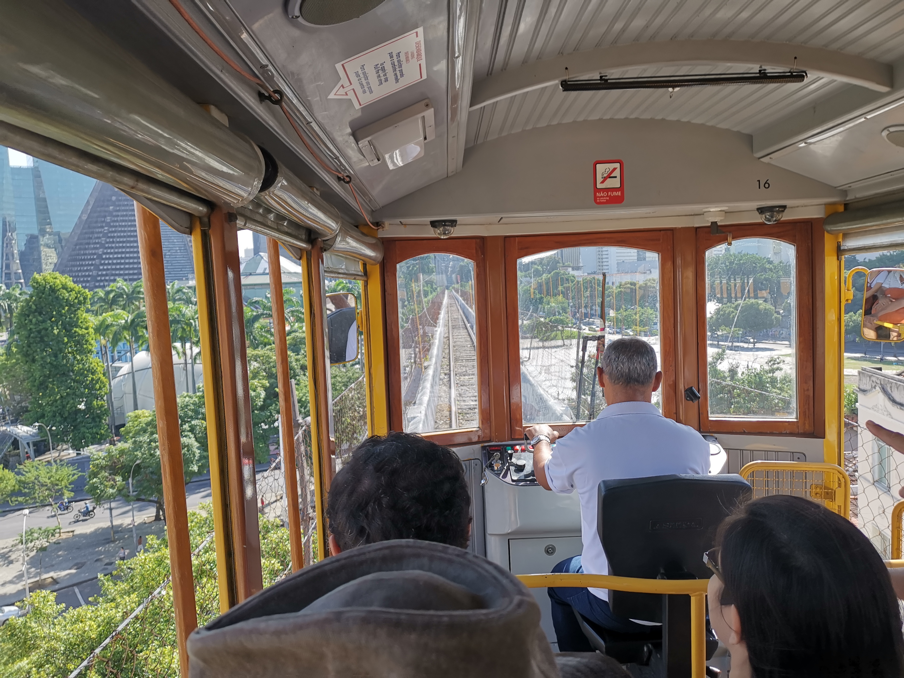The Tram is great. It rattles and bounces through the narrow streets, past dignified houses, pretty gardens and concrete monstrosities that should have been demolished at birth, until it finally clatters across an ancient aqueduct converted into an aerial tightrope for the tram to teeter across before it pulls into ToyTown Station in downtown Rio. The tram itself appears to be a very simple engineering masterpiece powered by falling carefully along some tracks, and a brake. I remain mystified as to how it goes back uphill again, unless they have discovered an anti-gravity machine. To stop people falling out, they have a long wooden pole along each side and, at each stop, the driver and the brakeman at the back have to lift the pole up to let people climb in and out. I loved it.